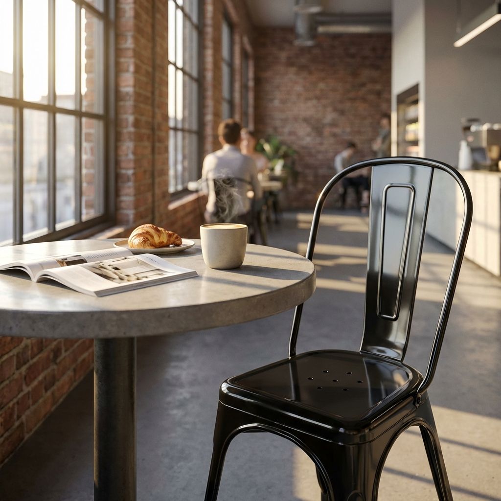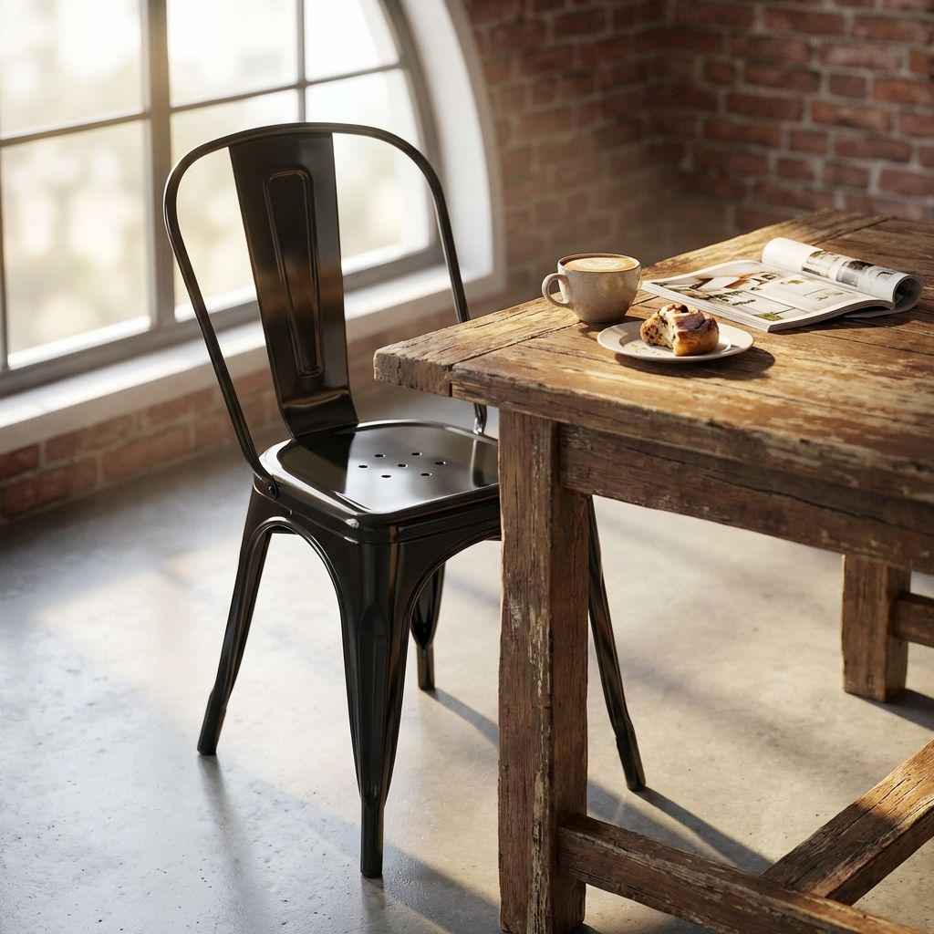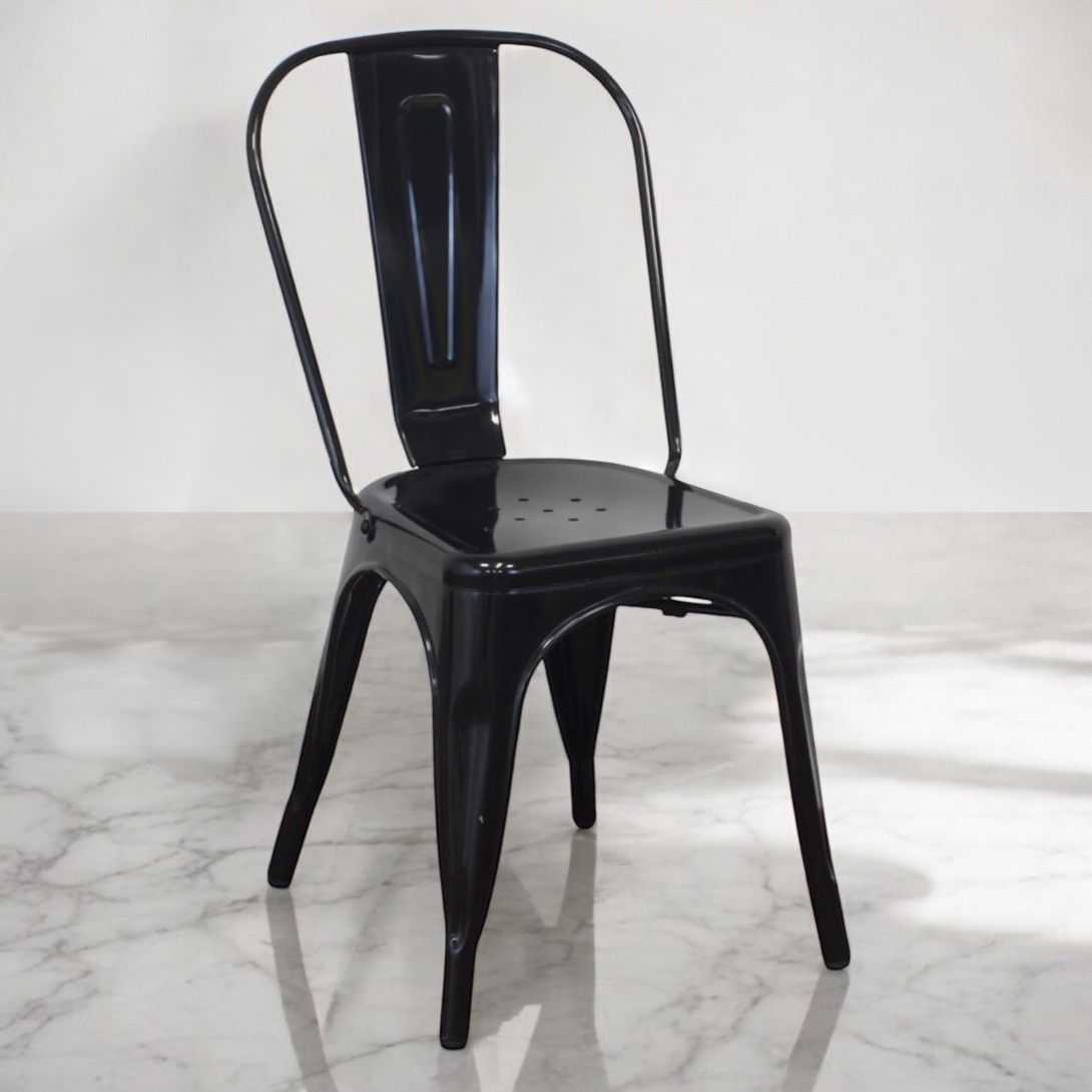 Questa sedia in metallo combina design industriale e praticità. Disponibile in diversi colori, è adatta per uso interno ed esterno. Impilabile e resistente, è perfetta per arredare con stile cucine, sale da pranzo, bar e ambienti moderni