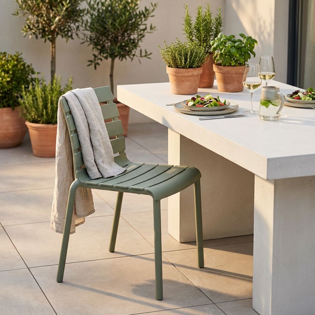 Sedia moderna in polipropilene, disponibile nei colori tortora, grigio, sabbia, arancione, nero e verde. Robusta e leggera, è ideale per spazi interni ed esterni, donando un tocco di design moderno.