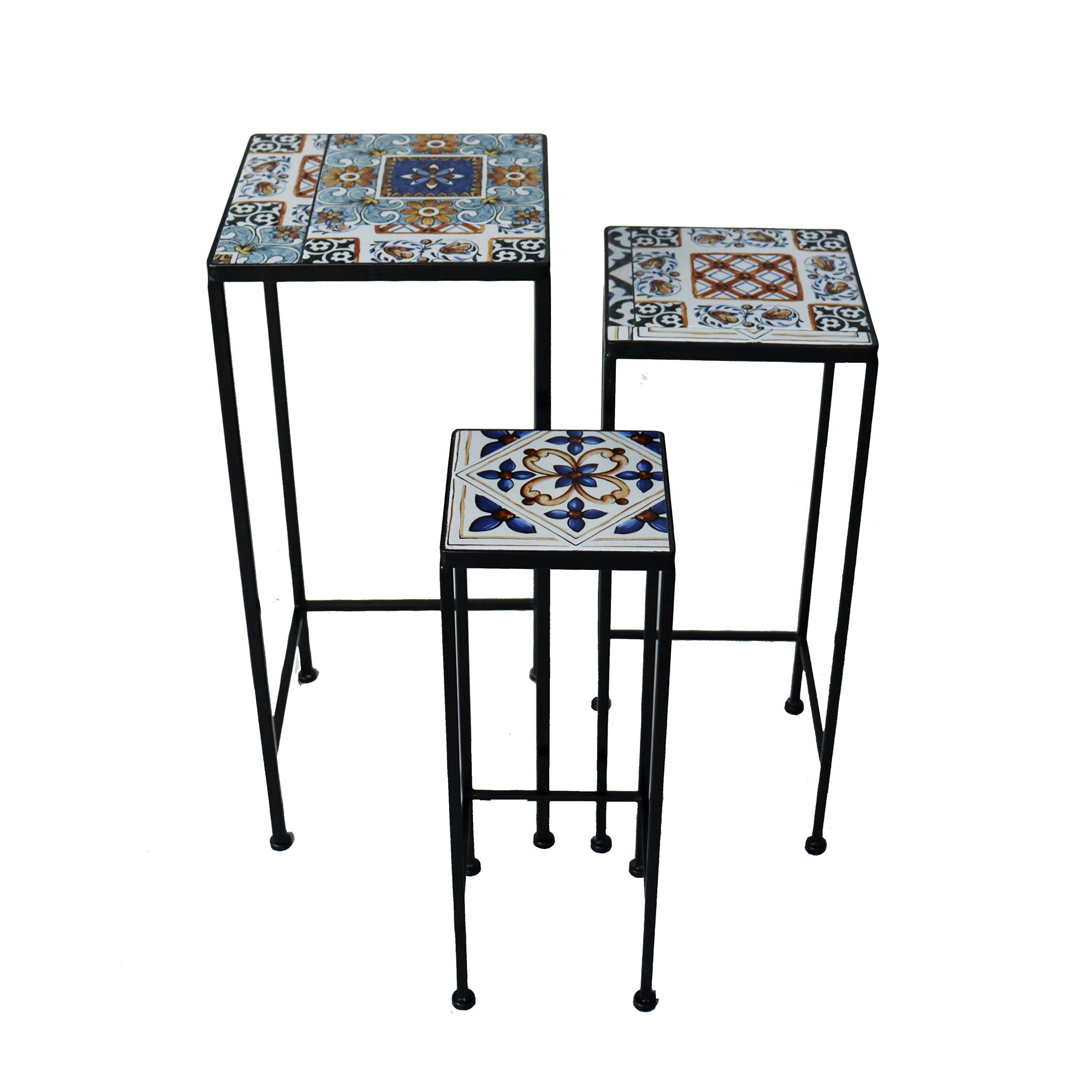 Set di tre fioriere in metallo verniciato a polvere con piano in piastrelle decorative, disponibili in diverse varianti cromatiche. L’ispirazione mediterranea delle maioliche conferisce un tocco raffinato e artistico, ideale per valorizzare ogni ambiente con stile e originalità.