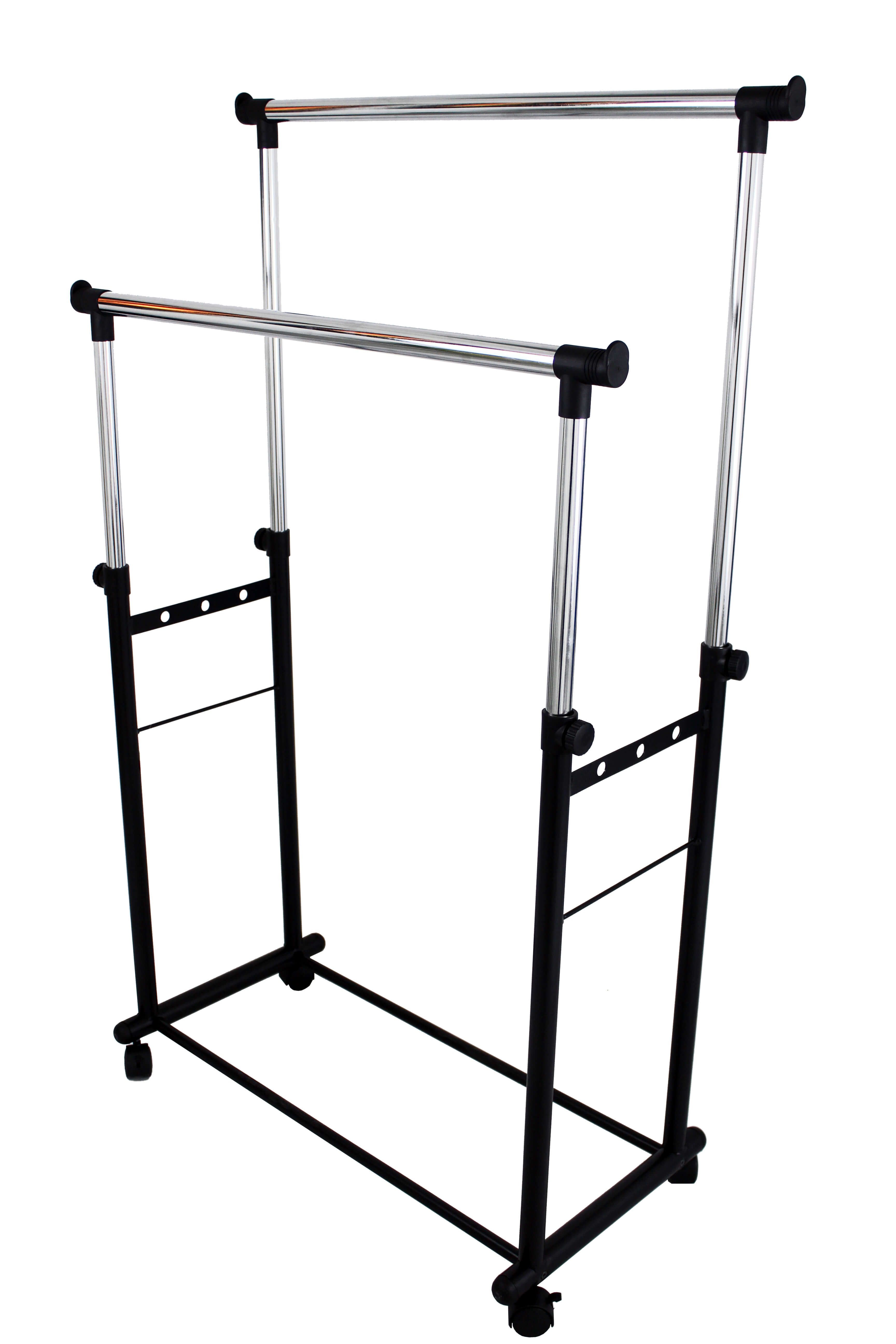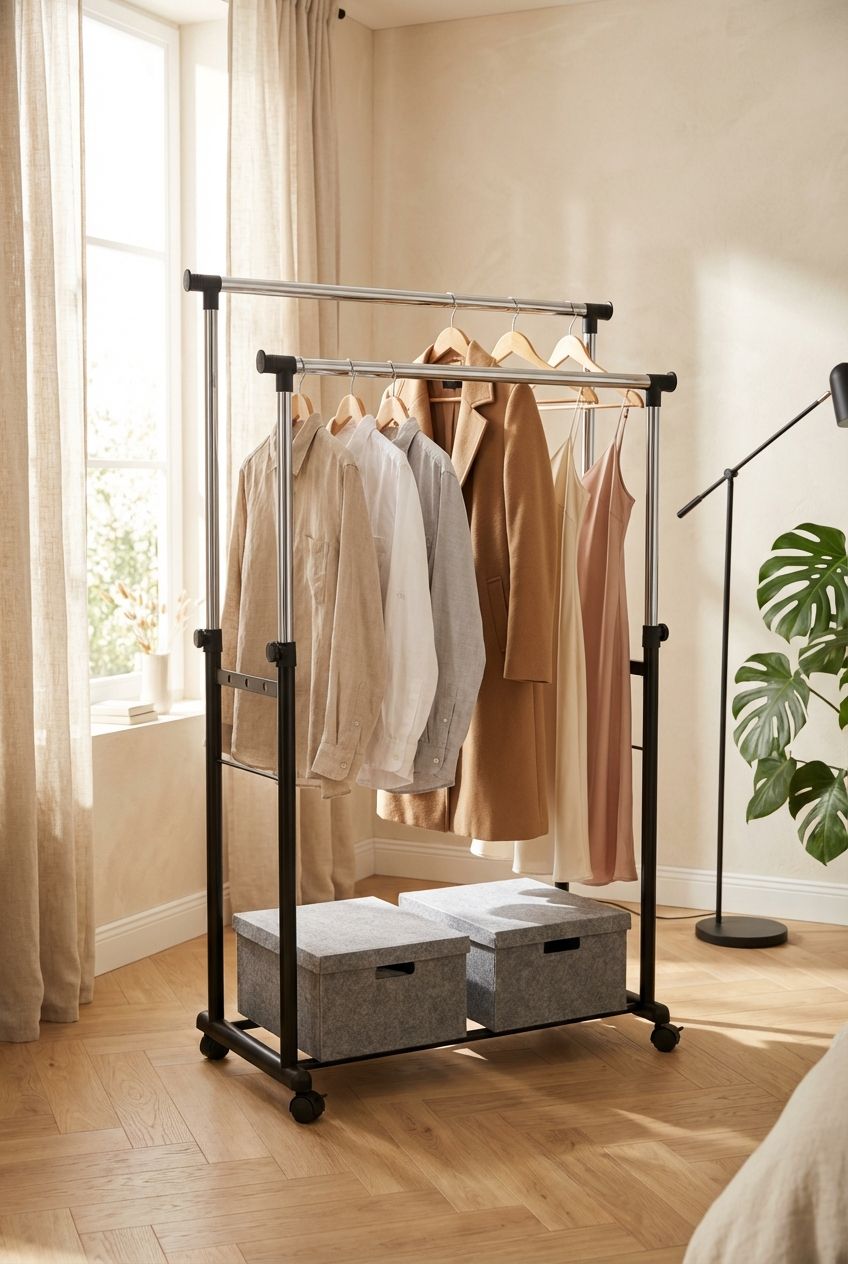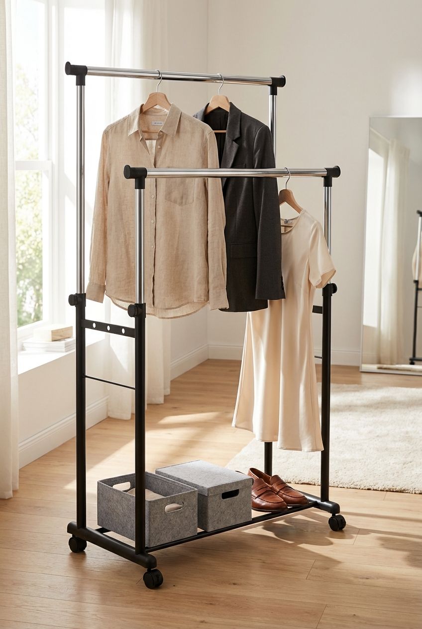 L'appendiabiti doppio, con design pratico e linee essenziali, offre soluzioni per ordinare camicie, vestiti, pantaloni e accessori, con spazio aggiuntivo per scatole alla base. Altezza e larghezza regolabili per massima adattabilità e stile.