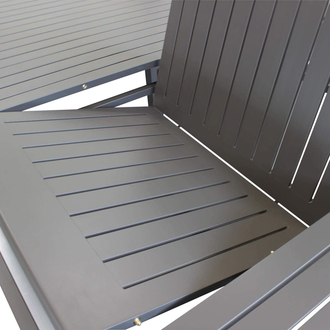 ARGENTUM è il tavolo allungabile da giardino per un ambiente arredato in stile minimal chic; elegante e raffinato, di tendenza, renderà il tuo giardino ancora più accattivante.Non solo, perché ARGENTUM, con la sua linea sobria ed essenziale, si adatta a qualsiasi tipo di outdoor.A prima vista, il tavolo da giardino cattura con il suo colore deciso, un sofisticato antracite dai toni scuri, perfetto da abbinare con le sedie coordinate o con sedute da colori chiari e vivaci, per un sorprendente effetto a contrasto cromatico.In secondo luogo, ARGENTUM conquista per il materiale robusto e resistente dell'allumino, funzionale a tutte le stagioni.ARGENTUM si allunga con un semplice meccanismo scorrevole, intuitivo e immediato: in pochi gesti è pronto ad accogliere e aggiungere un posto in più, come cita la celebre canzone.Basta aprile le due ali laterali e sollevare il tassello interno per ottenere un tavolo ancora più lungo e ospitale, perfetto per piacevoli pranzi della domenica en plein air.La superficie zigrinata con le fessure regala un'allure leggera come una piuma, nel pieno rispetto del mood less is more.Il risultato è un tavolo da giardino di tendenza, funzionale e dalle linee accattivanti come vogliono gli arredi di oggi.Eleganza e stile nel tuo giardinoQuando si avvicina l'estate e la bella stagione, la prima cosa da fare per accogliere queste giornate soleggiate è organizzare un pranzo all'aria aperta.Come arredare il proprio giardino con stile, ma senza dimenticare la funzionalità?ARGENTUM è il tavolo allungabile in alluminio che ti semplifica la vita, ma soprattutto anima il tuo outdoor con il suo carattere elegante e pratico allo stesso tempo.Il materiale è robusto e resistente, bello da vedere e facile da tenere pulito.Basterà utilizzare un panno con poco detergente per eliminare qualsiasi tipo di sporcizia e incrostazioni.L'alluminio è inoltre il materiale per eccellenza per l'arredo outdoor, poiché non viene attaccato da ruggine e umidità.In un solo componente d'arredo avrai il tavolo ideale per le tue grigliate saporite e per pranzi e cene in compagnia di amici e familiari.Come abbinare ARGENTUM?Grazie alle linee pulite ed essenziali, impeccabili e rigorose, il tavolo da giardino ARGENTUM si abbina a sedute in palette, oppure con sedie pieghevoli in alluminio.Bellezza, praticità e uno spirito funzionale che cattura anche la persona più pragmatica, ma sempre attenta al particolare più ricercato: ARGENTUM è la risposta all'esigenza di resa estetica e design, in un solo oggetto.Infine, nasconde l'anima allegra e conviviale: il tavolo si apre in un solo gesto e diventa il protagonista di festose cene di mezza estate.