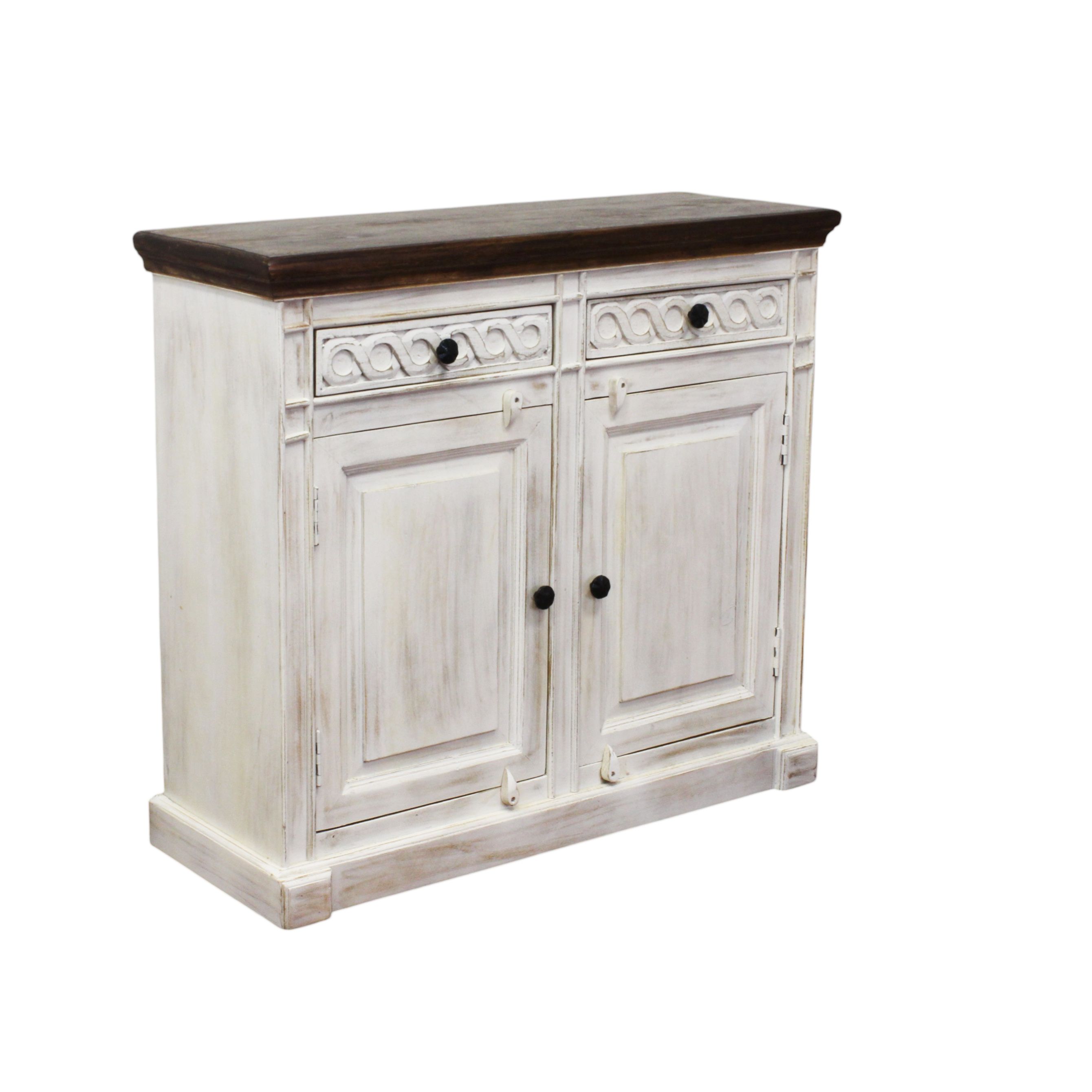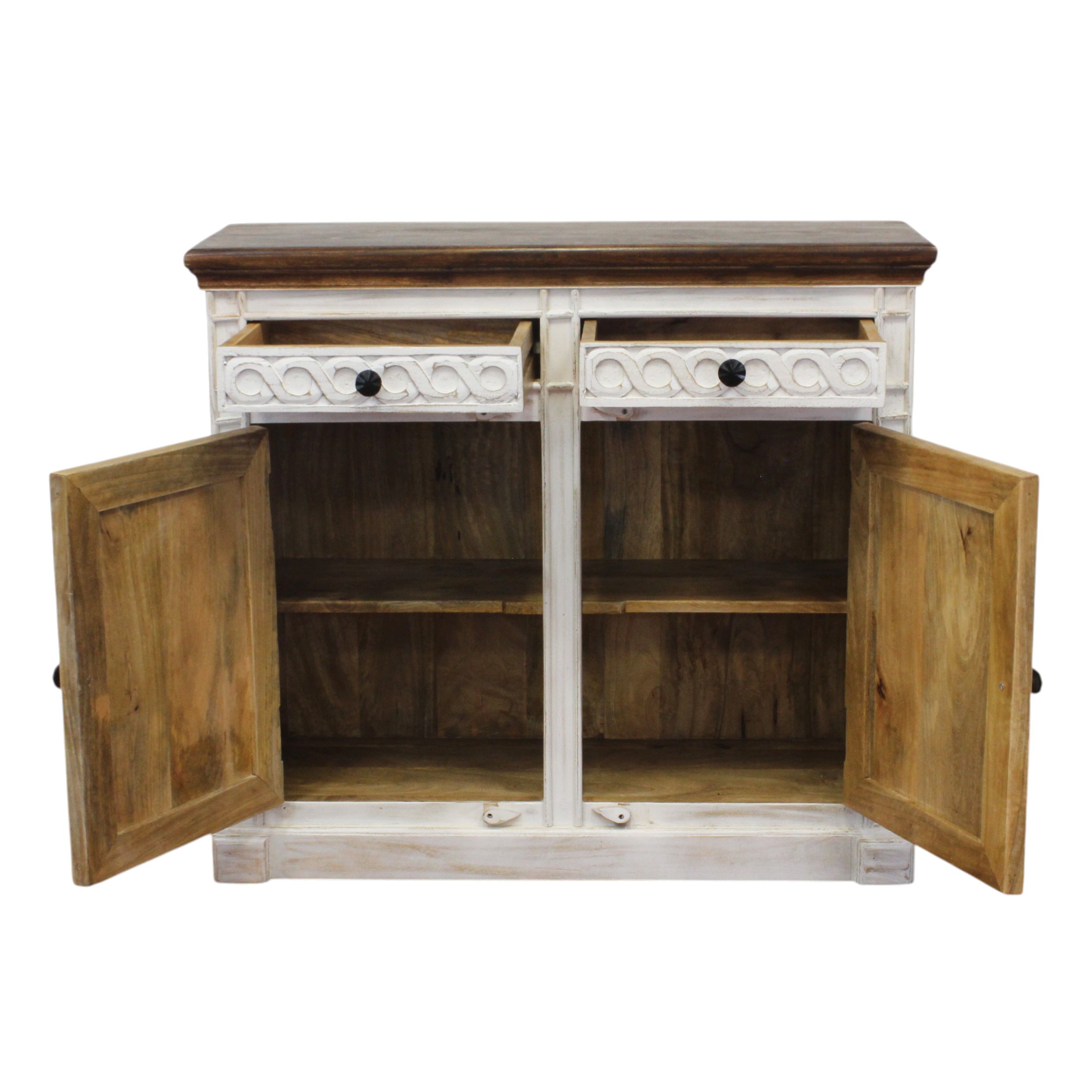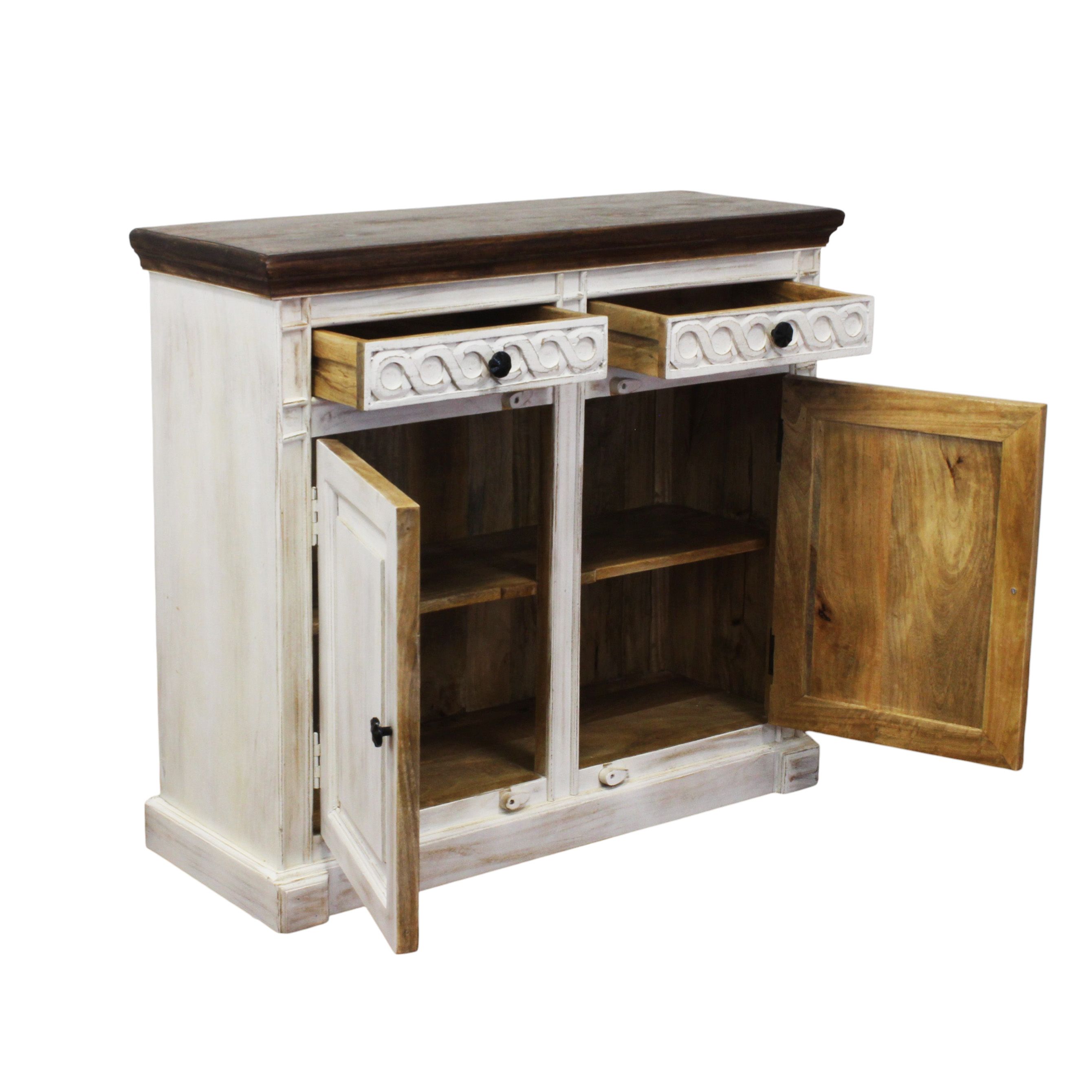 Mobile in legno massello di mango con finitura bianca decapata e piano superiore a contrasto. Dotato di due cassetti intagliati e due ante con ripiano interno, offre ampio spazio contenitivo. Ideale per soggiorno, ingresso o sala da pranzo, unisce stile shabby chic, solidità e funzionalità.