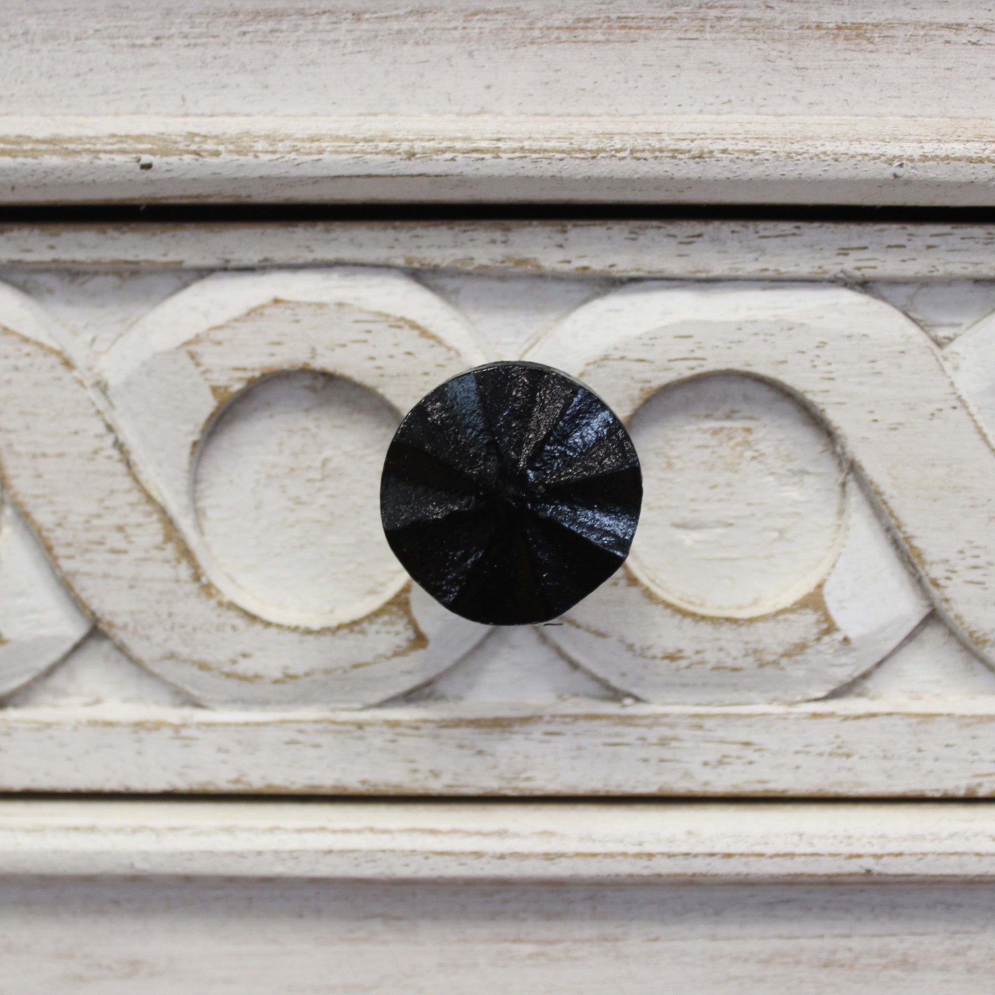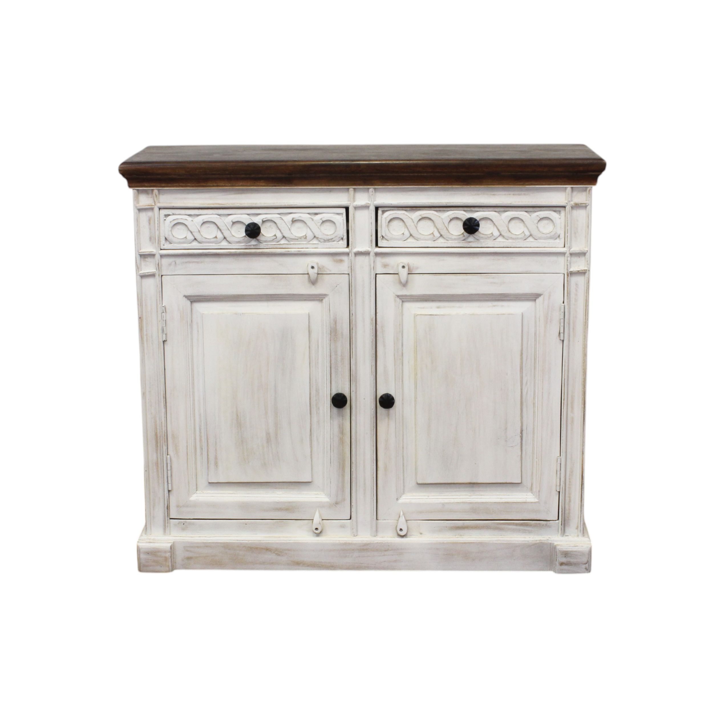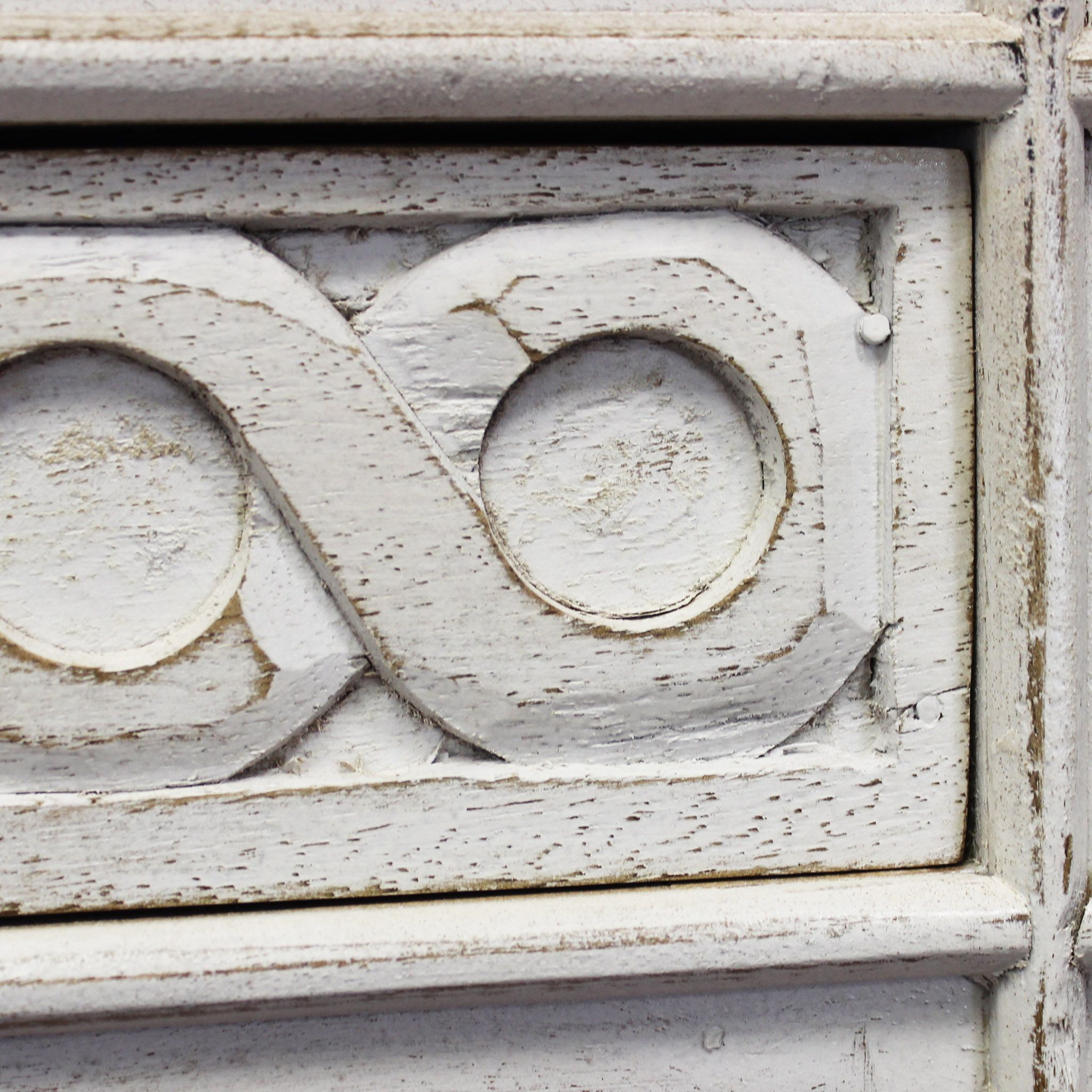 Mobile in legno massello di mango con finitura bianca decapata e piano superiore a contrasto. Dotato di due cassetti intagliati e due ante con ripiano interno, offre ampio spazio contenitivo. Ideale per soggiorno, ingresso o sala da pranzo, unisce stile shabby chic, solidità e funzionalità.