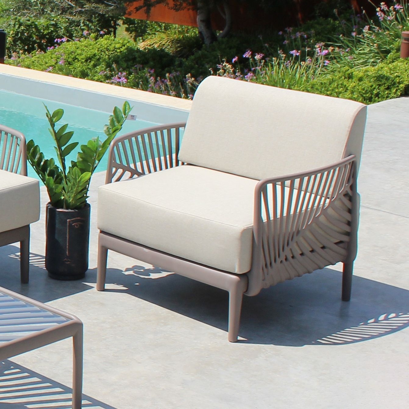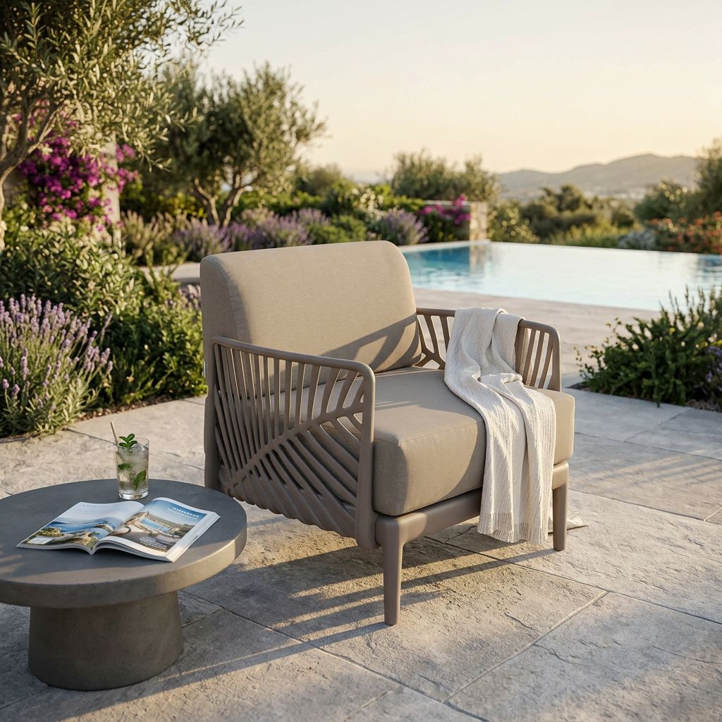 Questa poltrona da giardino, disponibile nei colori bianco/grigio, verde oliva, tortora e taupe, unisce eleganza e comfort. La struttura in polipropilene e il tessuto resistente alle intemperie ne fanno un arredo durevole e raffinato per ogni spazio esterno.