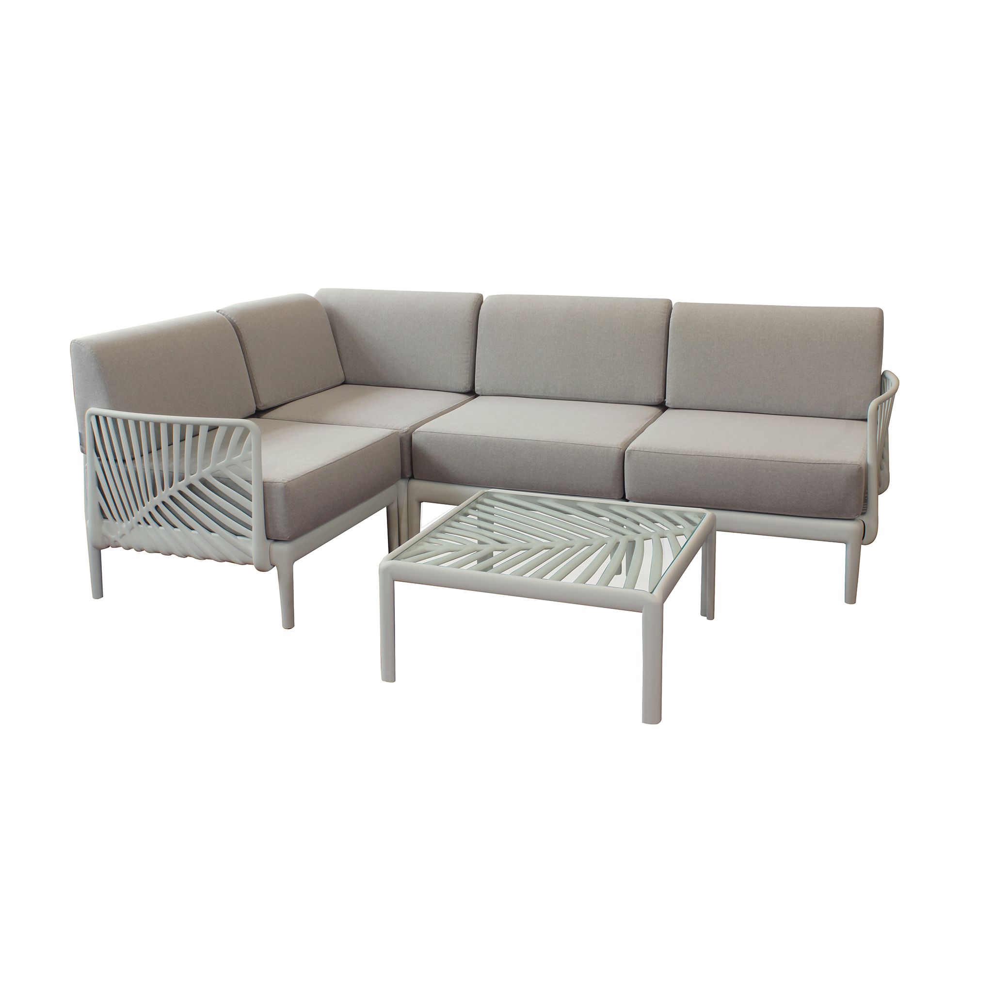 Il salotto angolare da giardino, disponibile nei colori bianco/grigio, verde oliva, tortora e taupe, unisce design e durata con la sua struttura in polipropilene e il tessuto resistente agli agenti atmosferici.