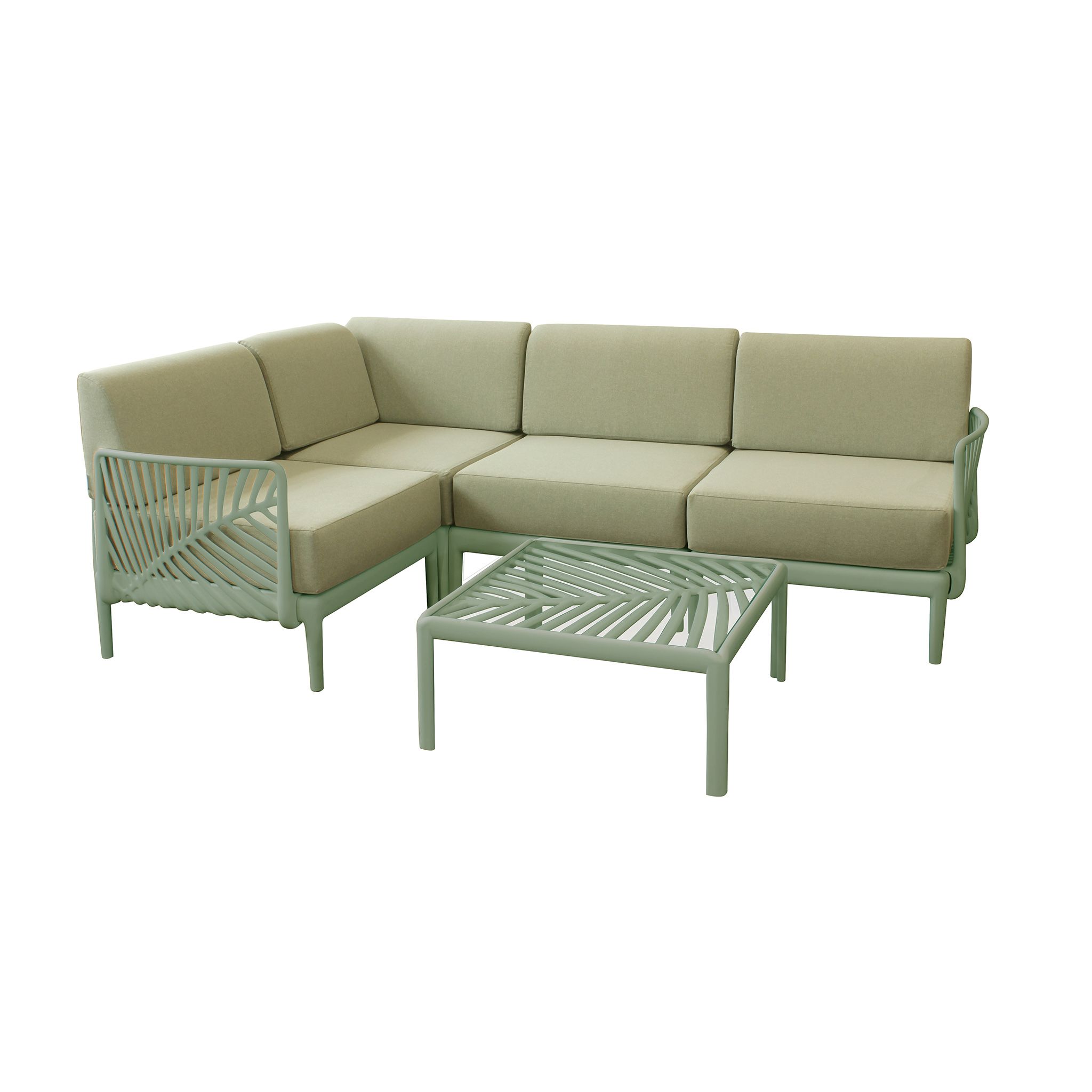 Il salotto angolare da giardino, disponibile nei colori bianco/grigio, verde oliva, tortora e taupe, unisce design e durata con la sua struttura in polipropilene e il tessuto resistente agli agenti atmosferici.