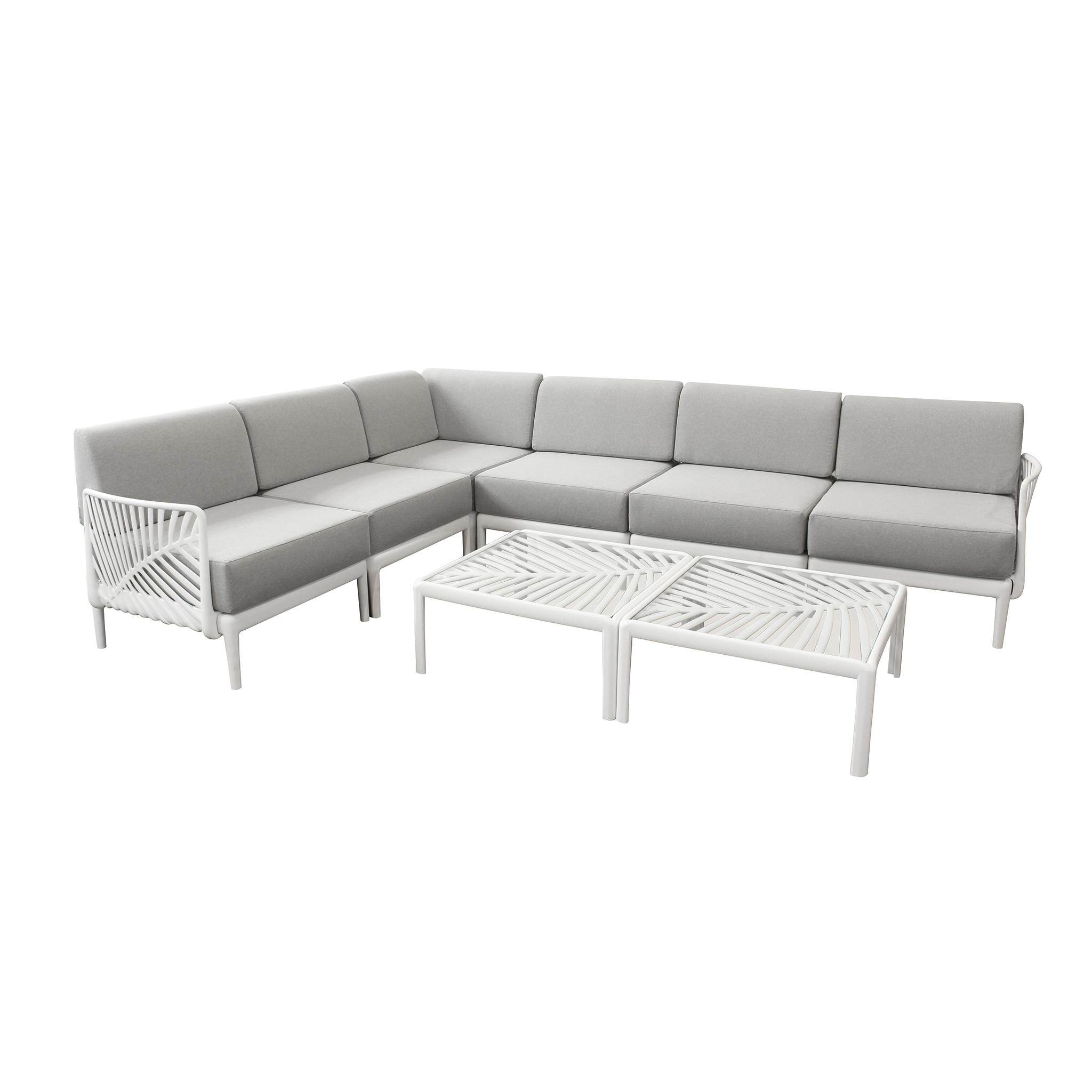 Il salotto angolare da giardino versione large, disponibile nei colori bianco/grigio, verde oliva, tortora e taupe, unisce eleganza e durabilità grazie alla struttura in polipropilene e al tessuto resistente agli agenti atmosferici.