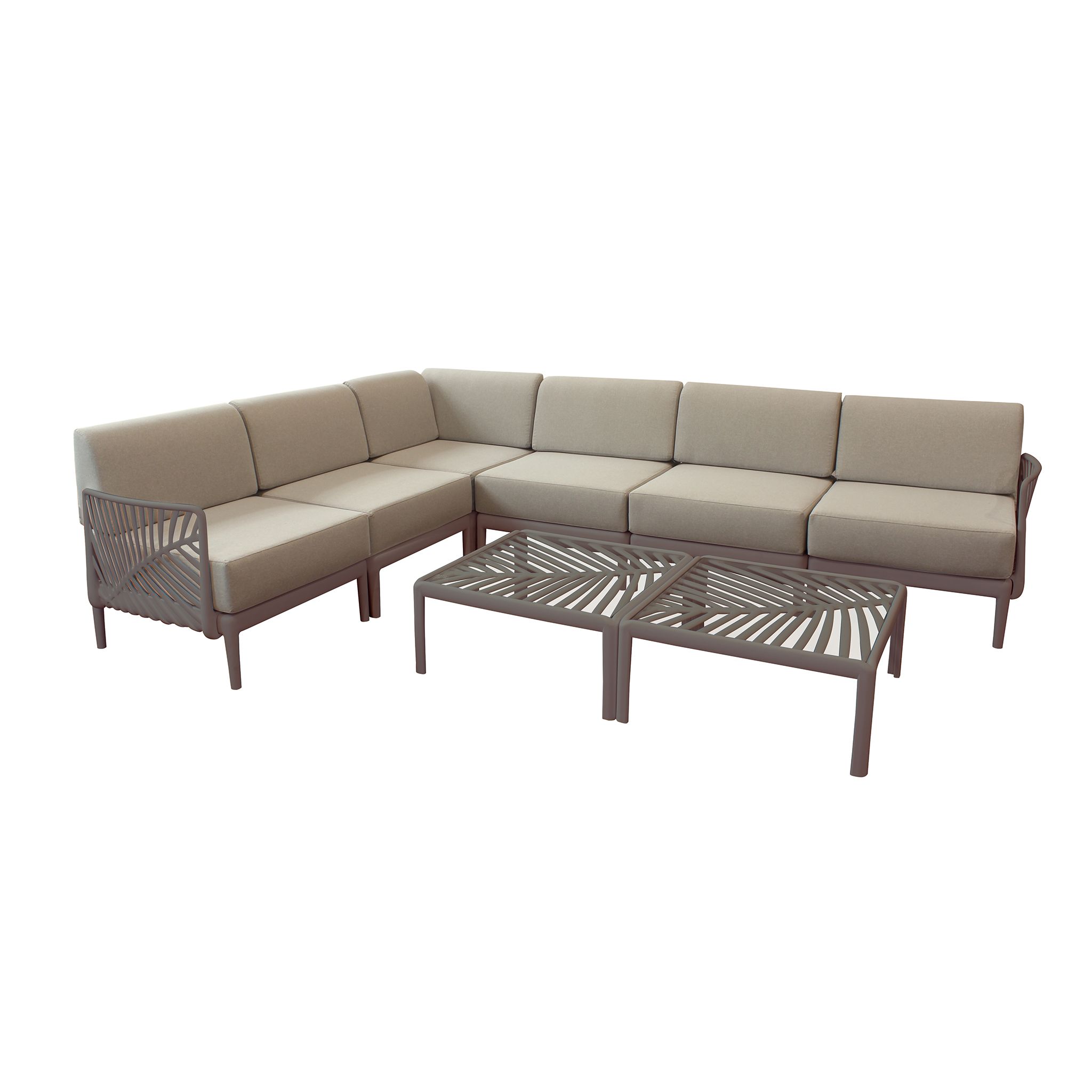 Il salotto angolare da giardino versione large, disponibile nei colori bianco/grigio, verde oliva, tortora e taupe, unisce eleganza e durabilità grazie alla struttura in polipropilene e al tessuto resistente agli agenti atmosferici.