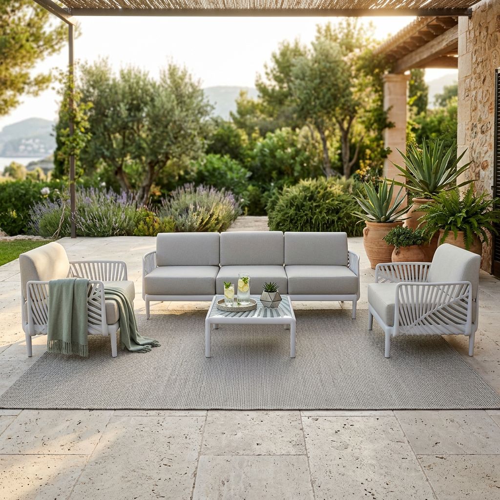 Questo salotto da giardino, disponibile nei colori bianco/grigio, verde oliva, tortora e taupe, unisce eleganza e durata grazie alla struttura in polipropilene e al tessuto resistente agli agenti atmosferici.