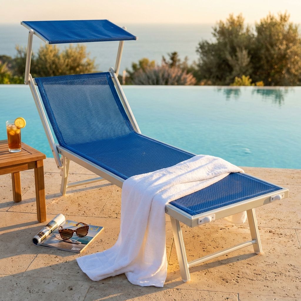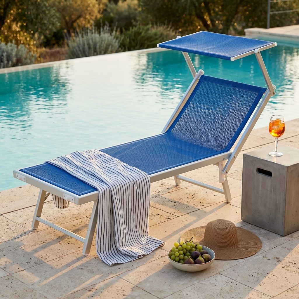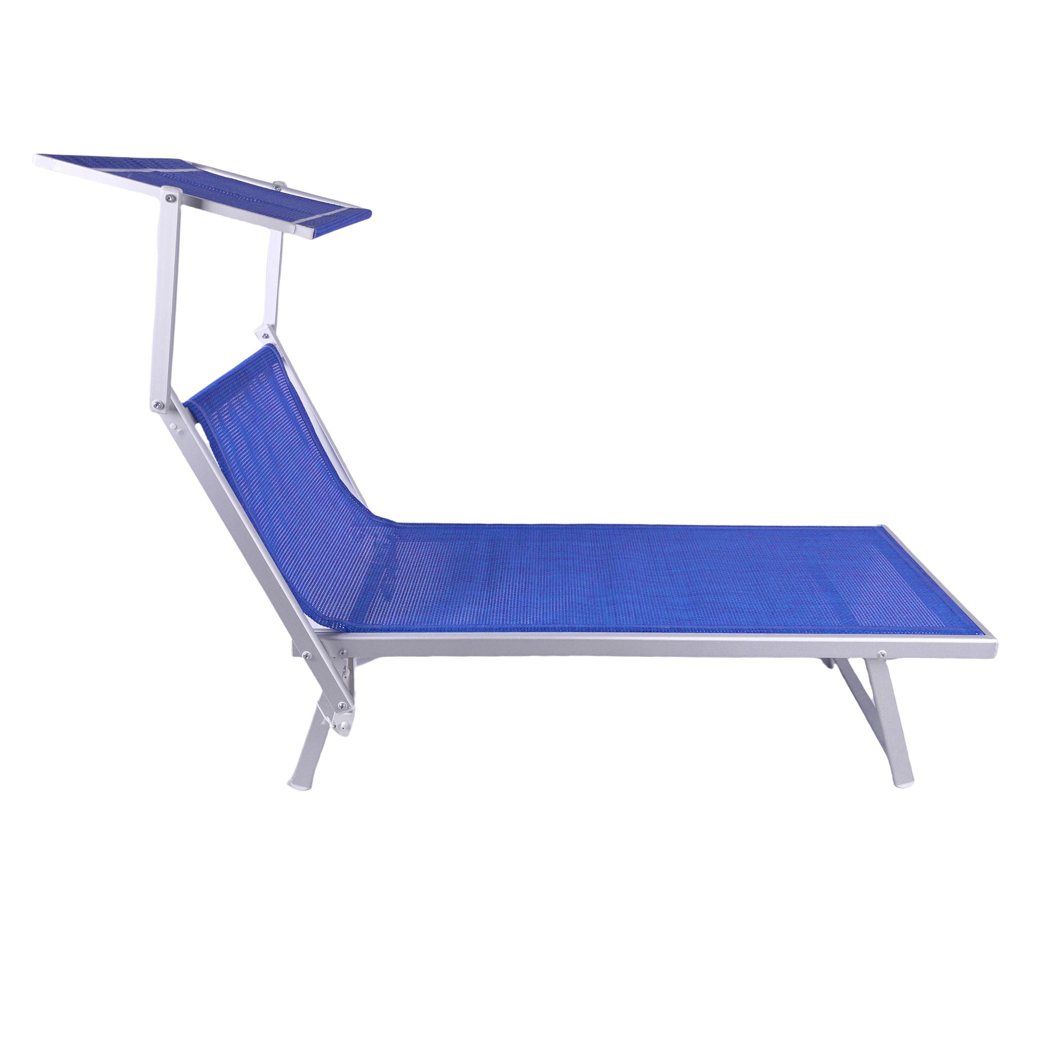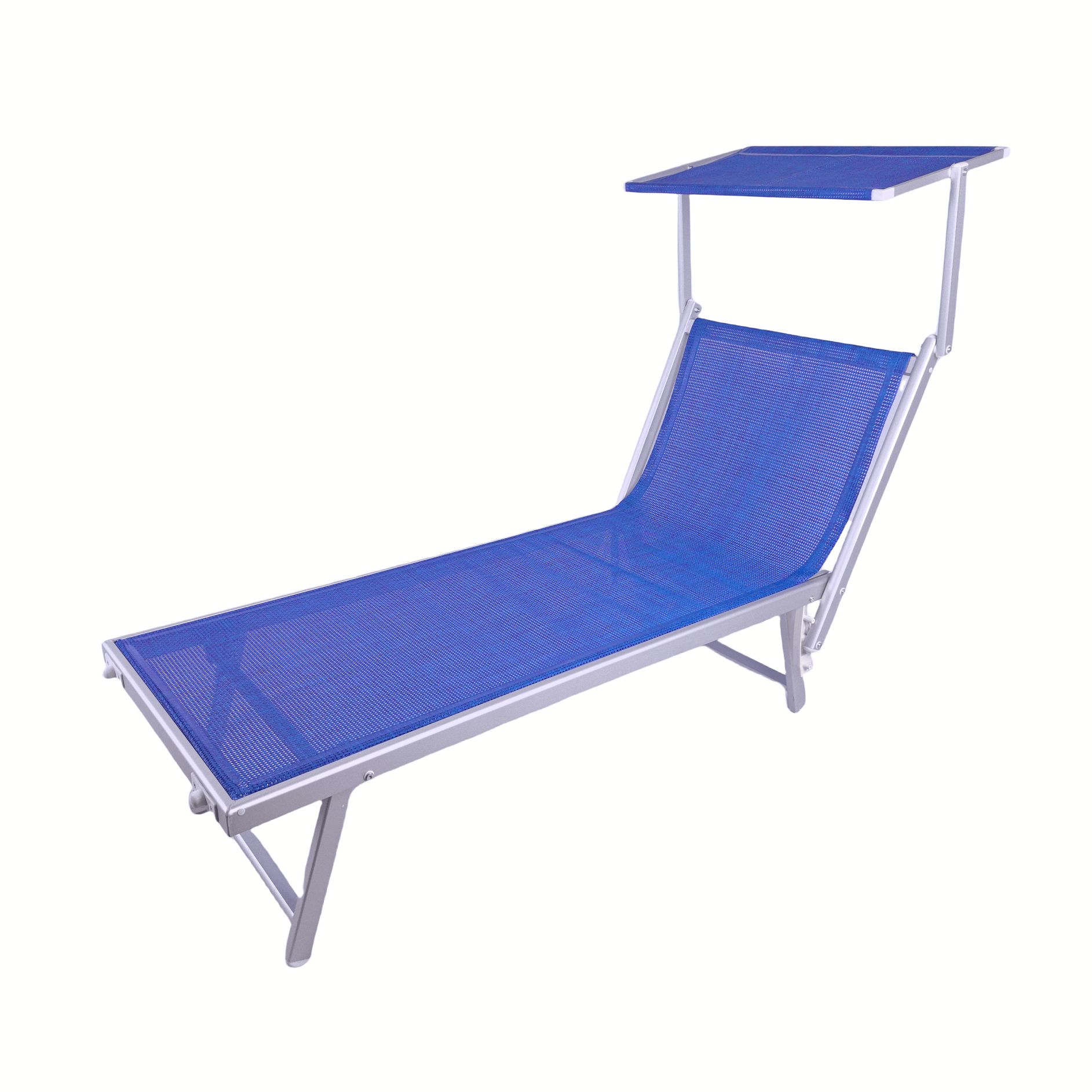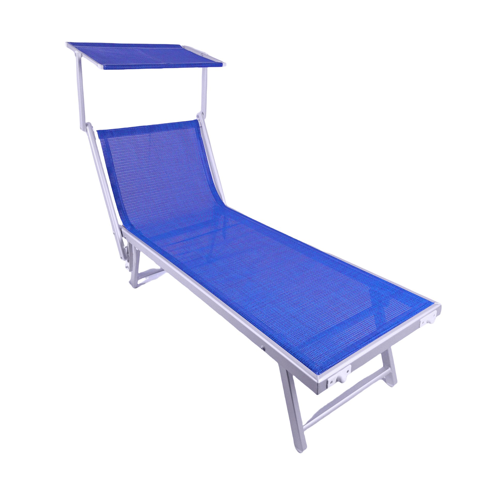 Lettino da esterno con struttura in alluminio e seduta in textilene 5x5, resistente e maneggevole. Dotato di tettuccio regolabile. Perfetto per spiaggia, giardino o bordo piscina.