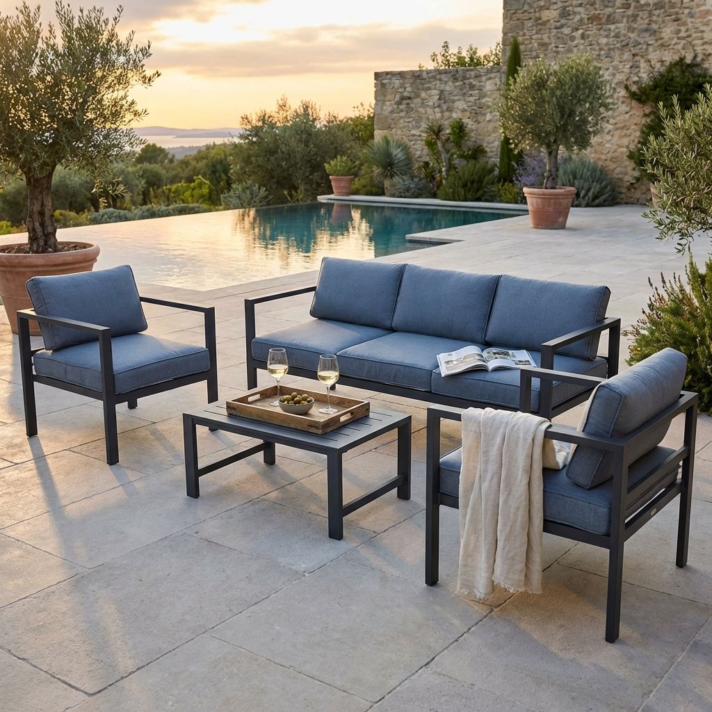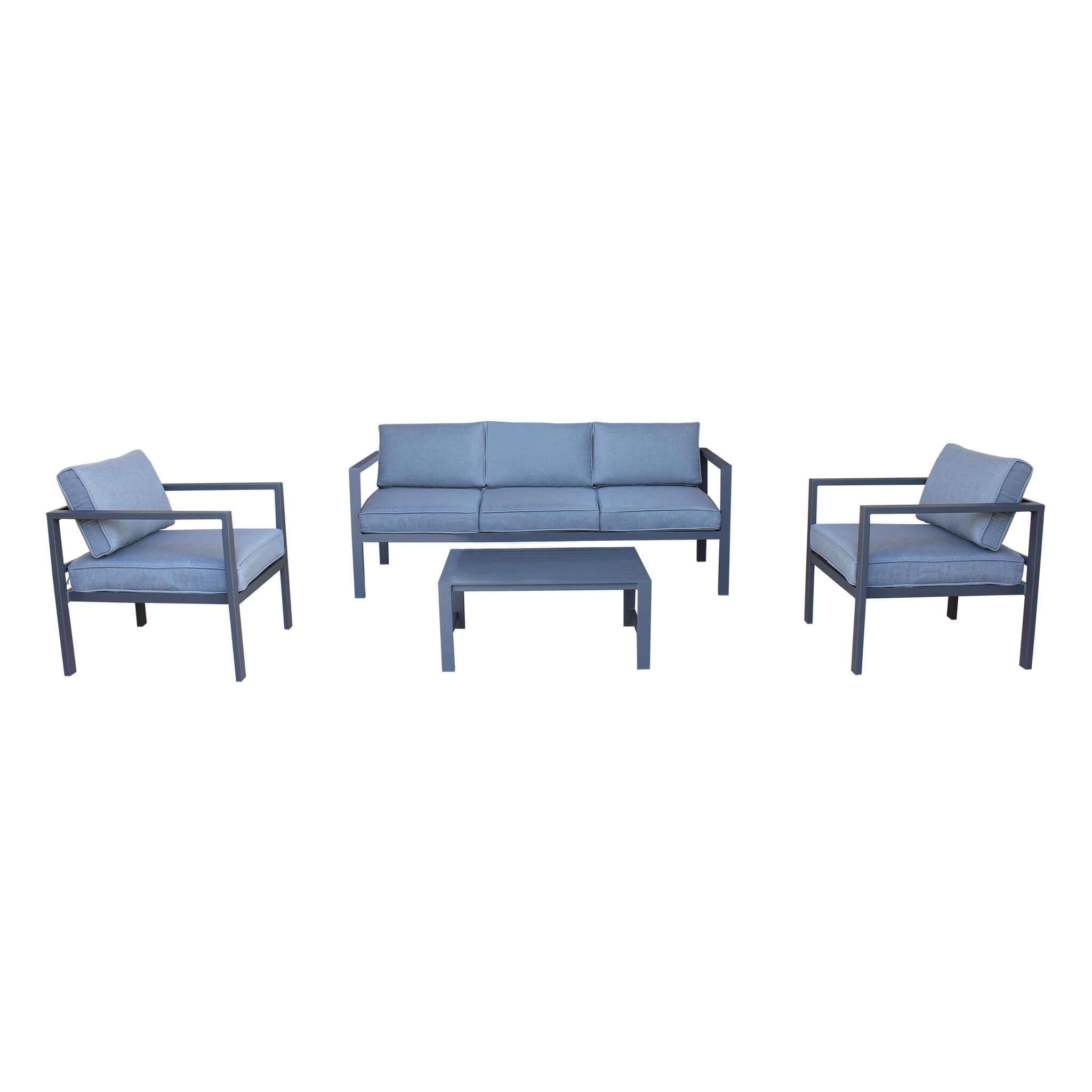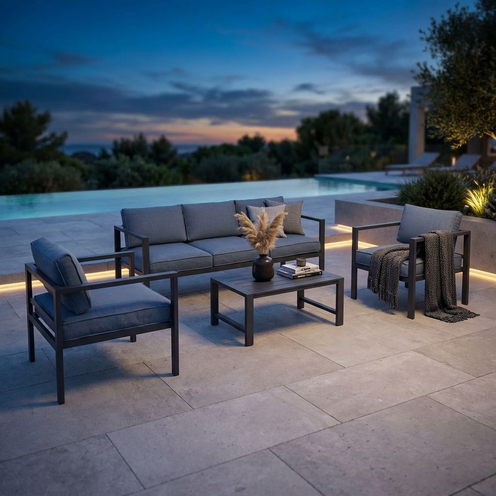 il salotto da giardino in alluminio di alta qualità, resistente agli agenti atmosferici. Con versioni da 4 o 5 posti, offre comfort e stile. Cuscini idrorepellenti e varietà di colori. Trasforma il tuo giardino in un'oasi di relax con Aulus.