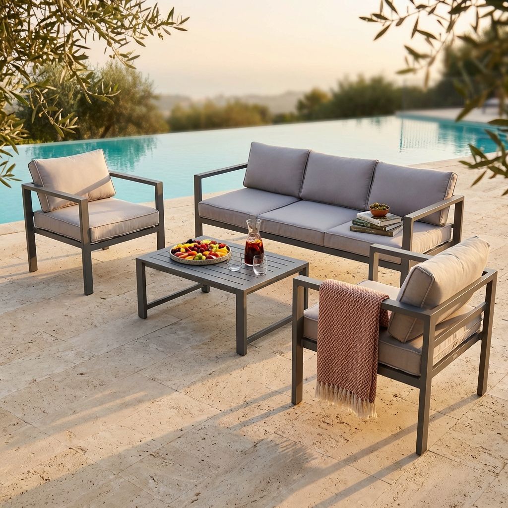il salotto da giardino in alluminio di alta qualità, resistente agli agenti atmosferici. Con versioni da 4 o 5 posti, offre comfort e stile. Cuscini idrorepellenti e varietà di colori. Trasforma il tuo giardino in un'oasi di relax con Aulus.