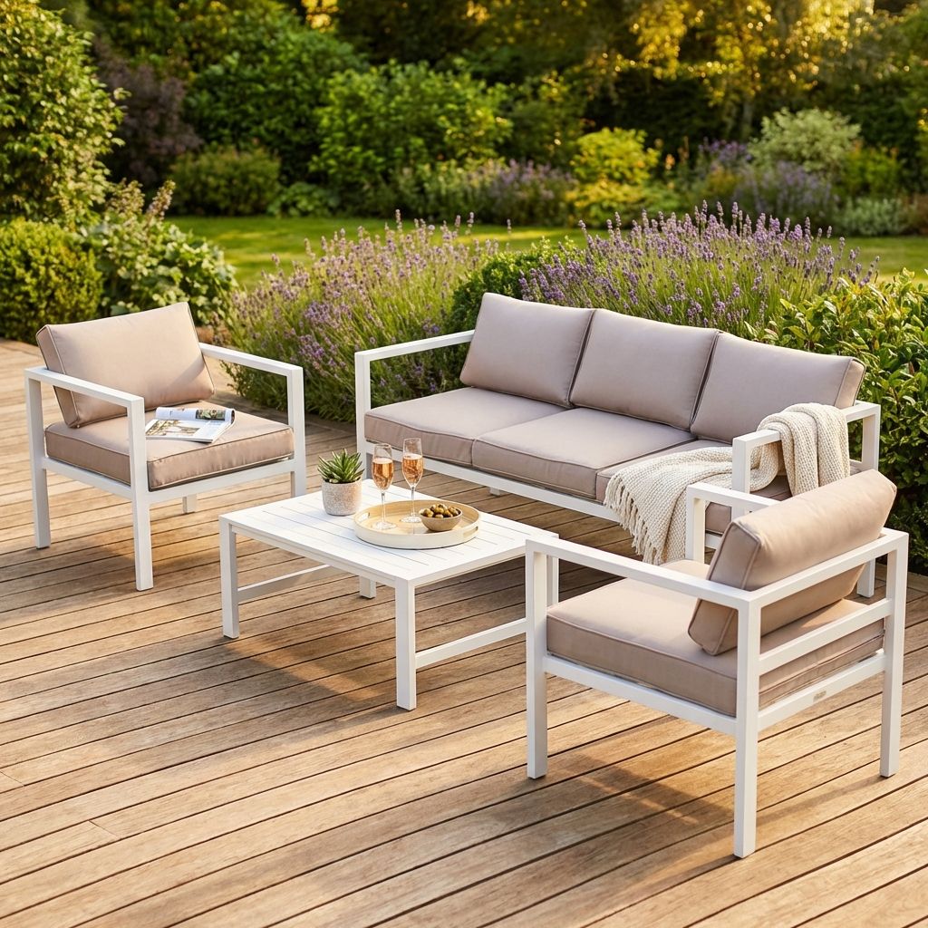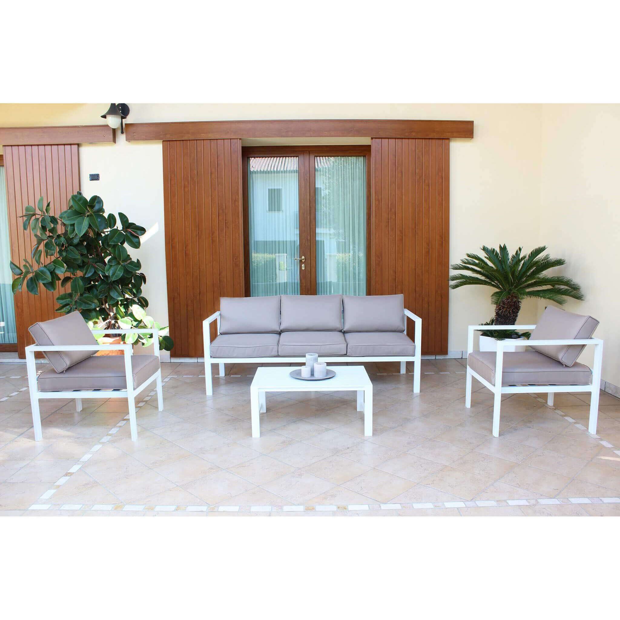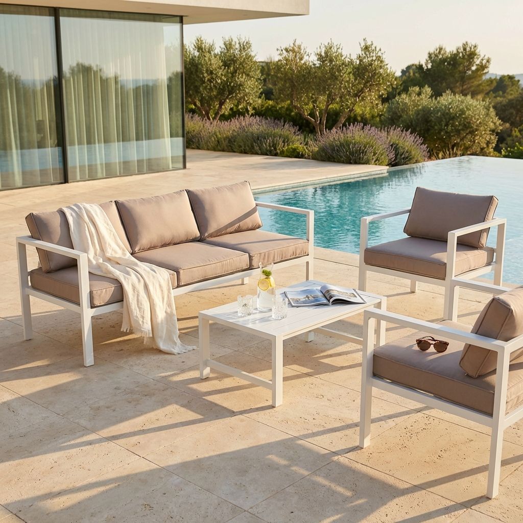 il salotto da giardino in alluminio di alta qualità, resistente agli agenti atmosferici. Con versioni da 4 o 5 posti, offre comfort e stile. Cuscini idrorepellenti e varietà di colori. Trasforma il tuo giardino in un'oasi di relax con Aulus.