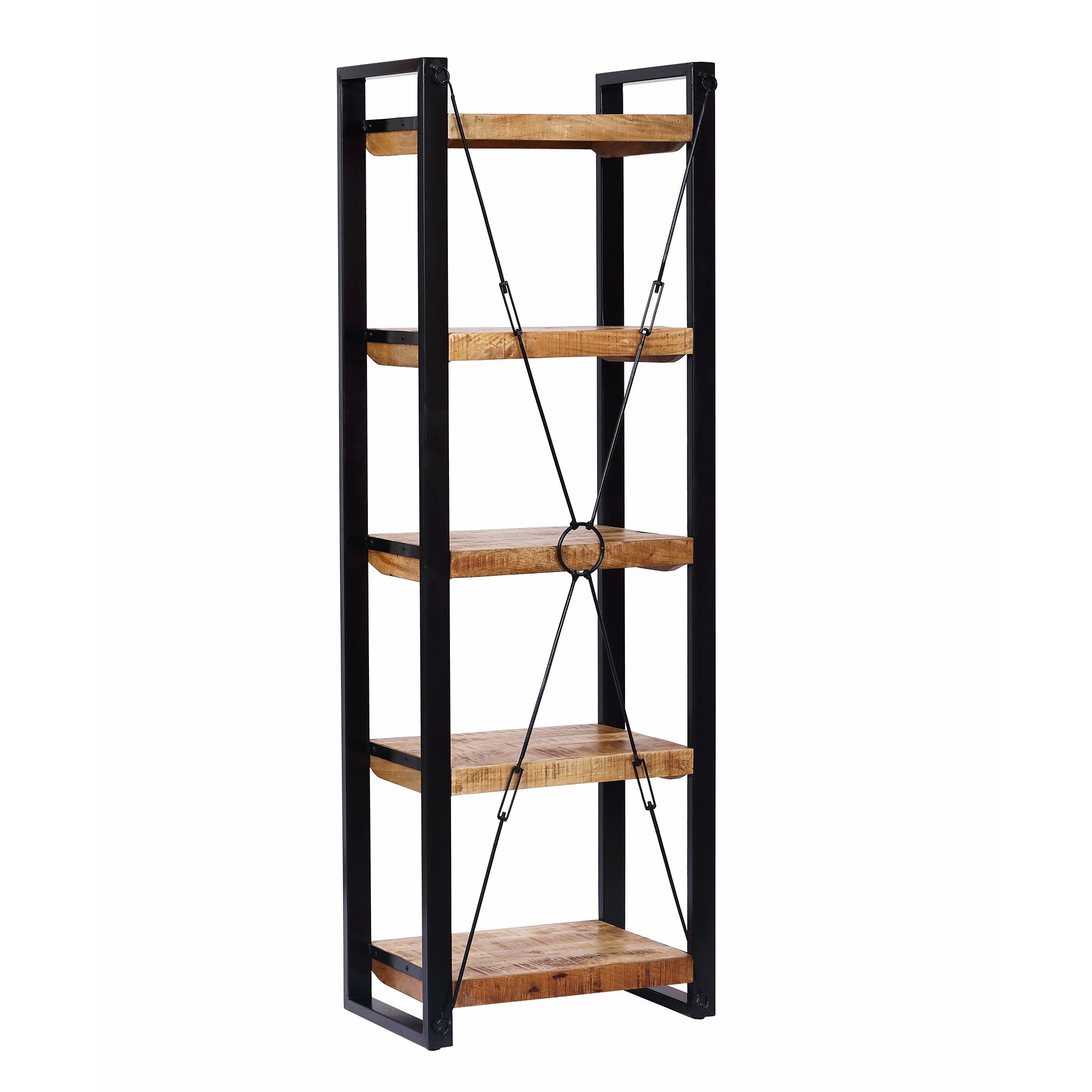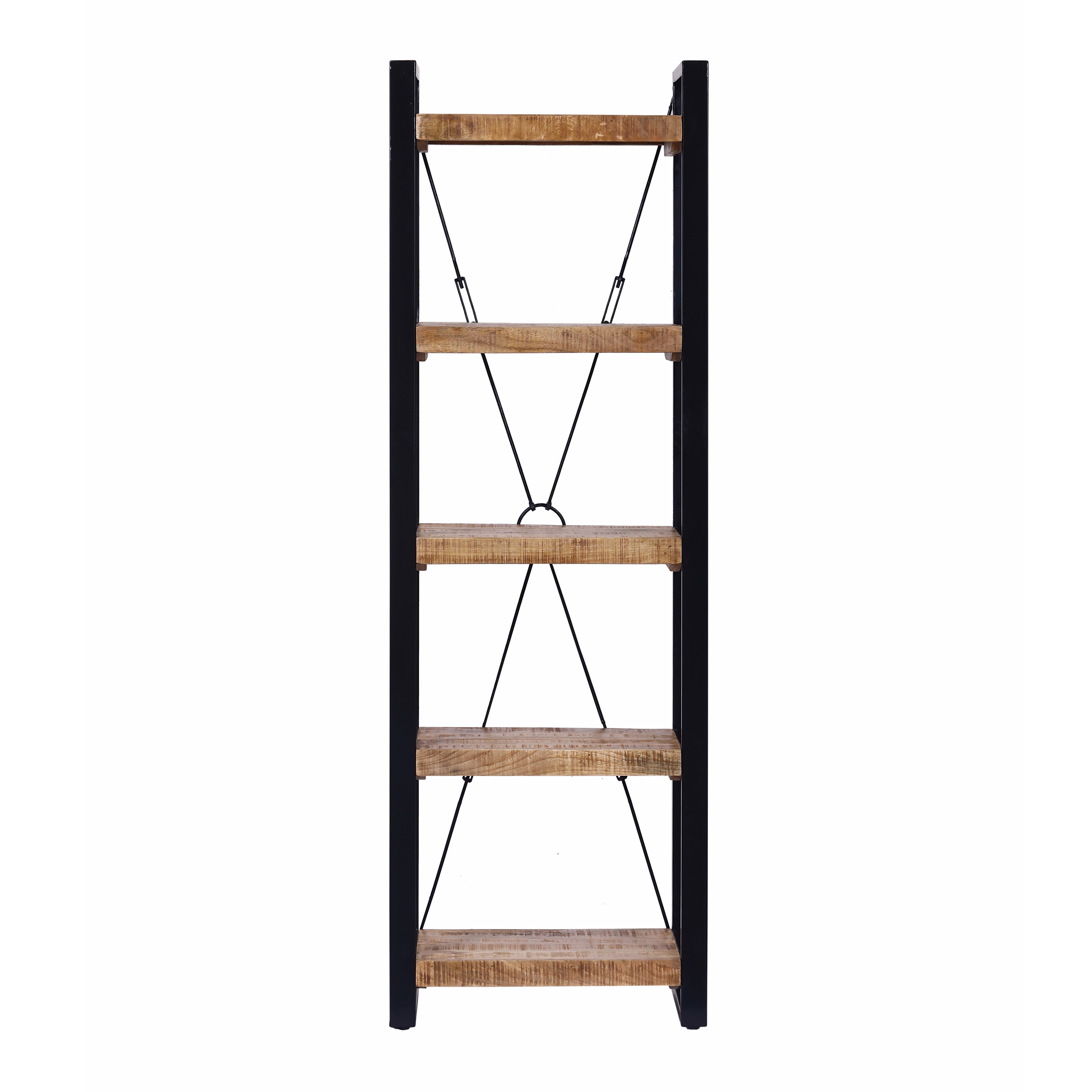 Mobile libreria in stile industrial con 5 ripiani in legno massello di mango e struttura in metallo nero. Perfetto per aggiungere carattere e funzionalità a ogni ambiente, unisce robustezza e design elegante. Ideale per esporre libri, oggetti decorativi o piante.