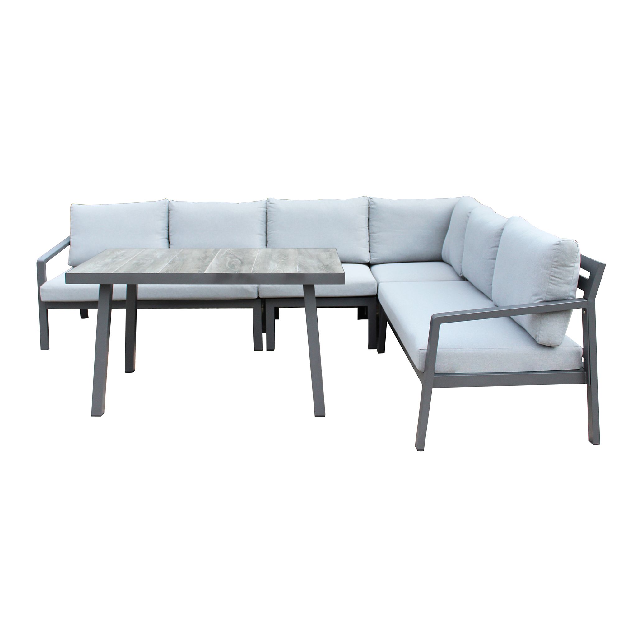 Il salotto angolare BORA, con il suo design moderno e raffinato, unisce eleganza e comfort per l'arredo di giardini, terrazze o verande. Realizzato con una struttura durevole in alluminio e comodi cuscini resistenti alle intemperie, garantisce un'esperienza di relax all'aperto ineguagliabile. Il set include un tavolino in gress, resistente e funzionale, perfetto per completare l'atmosfera conviviale. Con una gamma di finiture e colori disponibili, BORA permette di personalizzare l'estetica del tuo spazio esterno, offrendo allo stesso tempo durabilità e facilità di manutenzione.