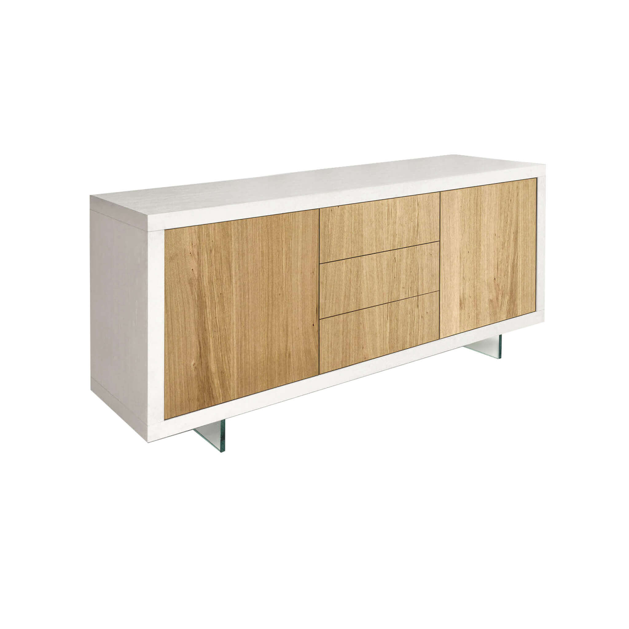 La raffinatezza di questa credenza italiana è data dalle linee essenziali e pulite che disegnano la sua forma rettangolare e che la dividono nettamente in 3 settori distinti: la parte centrale è costituita da 3 cassetti con apertura push and pull, le parti laterali invece sono costituite da due molto spaziose anch'esse con apertura push and pull.