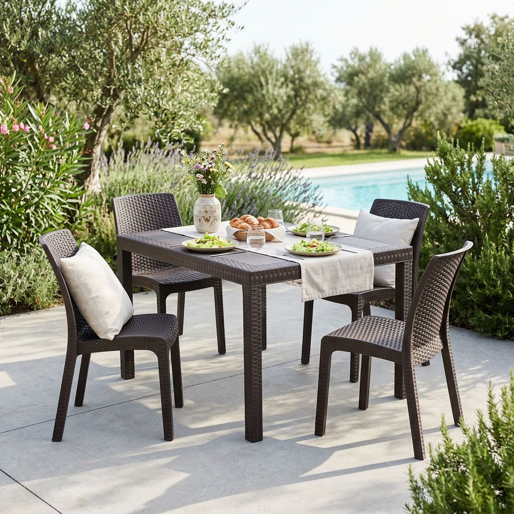 Il set tavolo CALIGOLA è disponibile in colore antracite, bianco, marrone e taupe, con 4 e 6 sedute