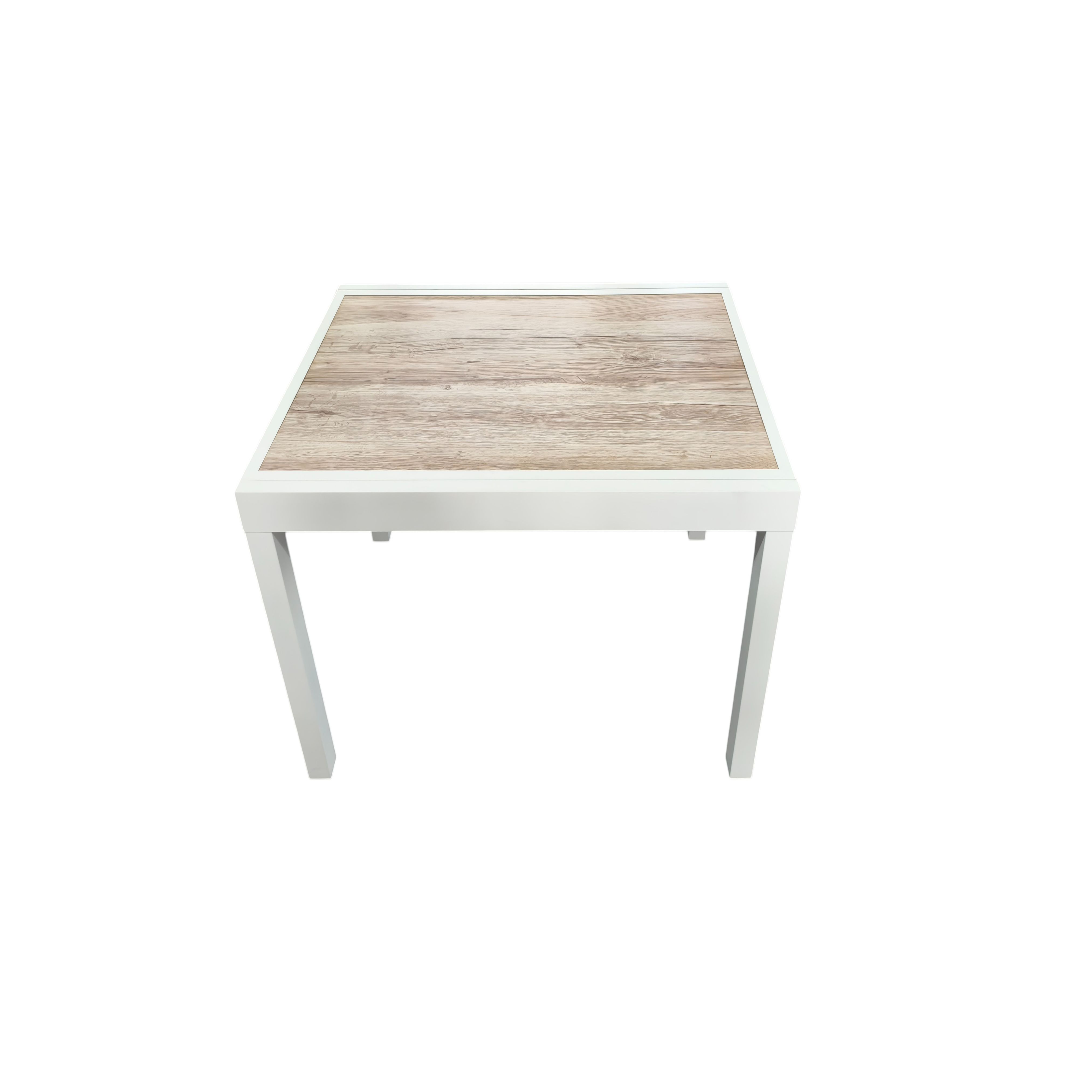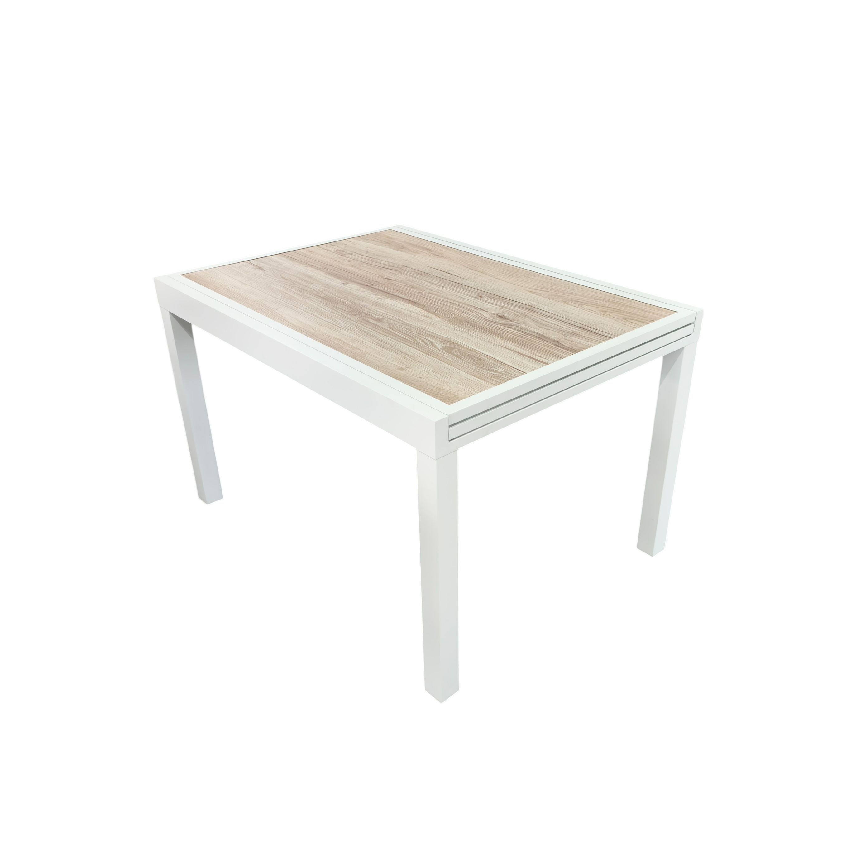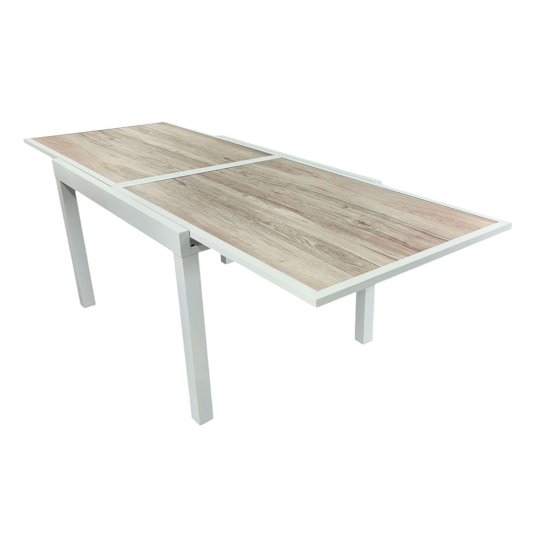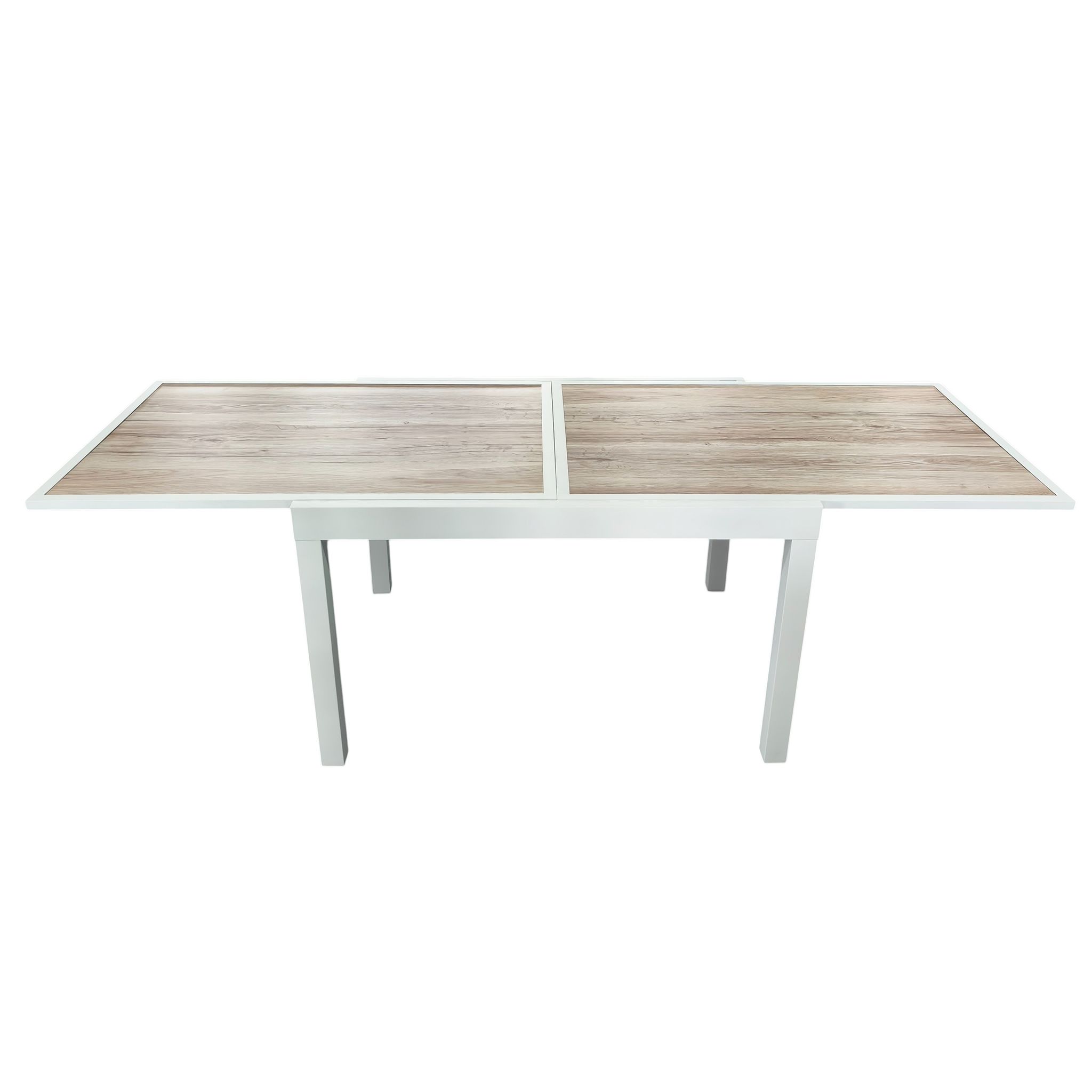 Tavolo allungabile da esterno con struttura in alluminio e piano in vetro effetto LEGNO. L’apertura a scorrimento laterale consente di ampliare facilmente la superficie, offrendo spazio per ogni occasione. Unisce design moderno e massima praticità. Disponibile anche in bianco e taupe.