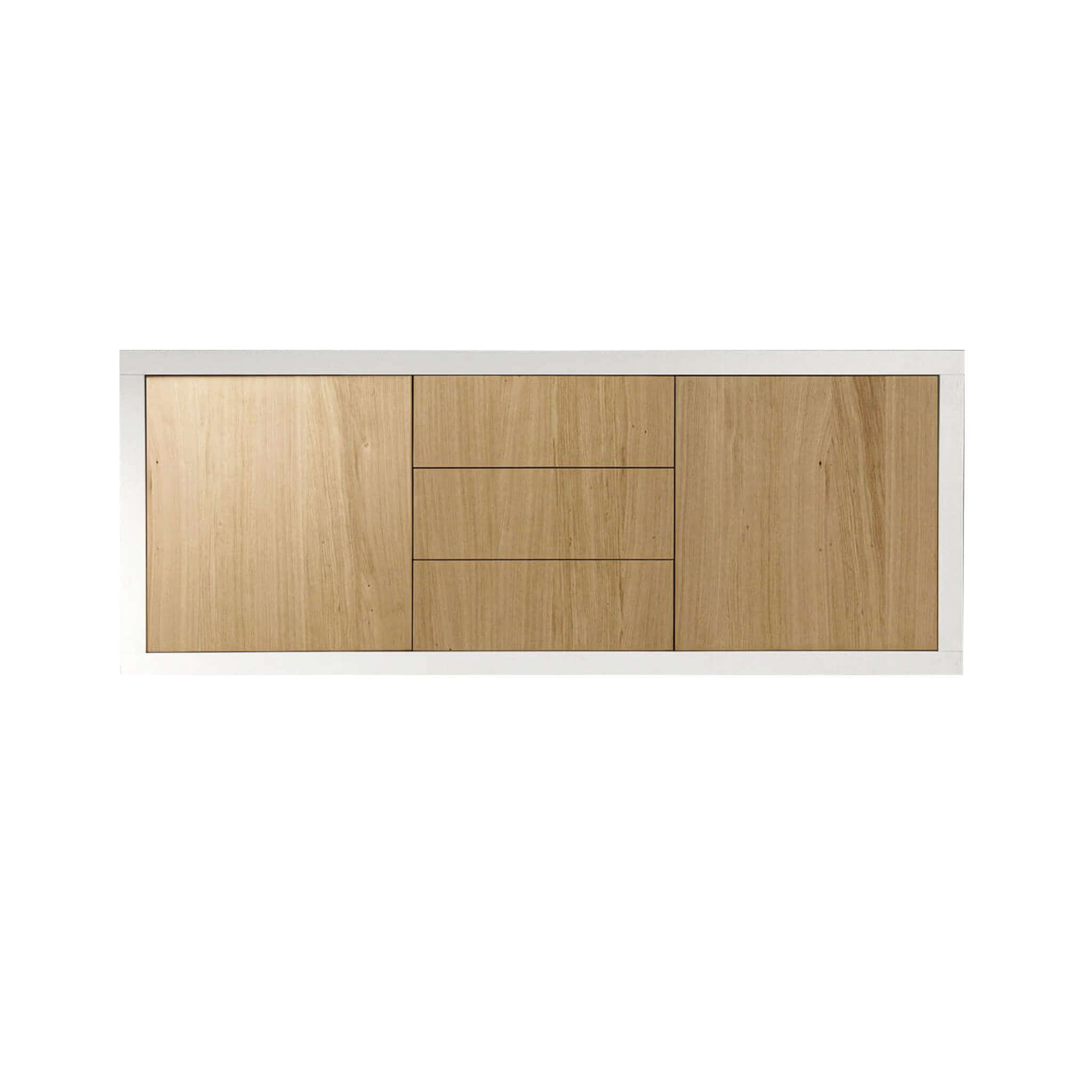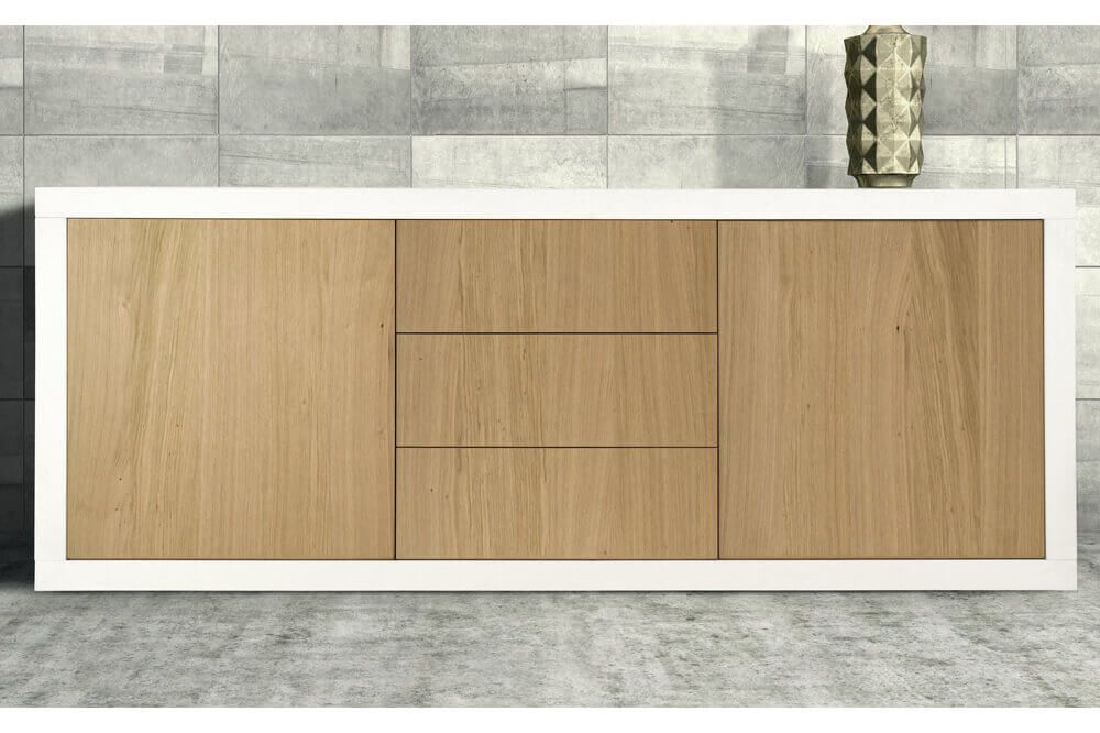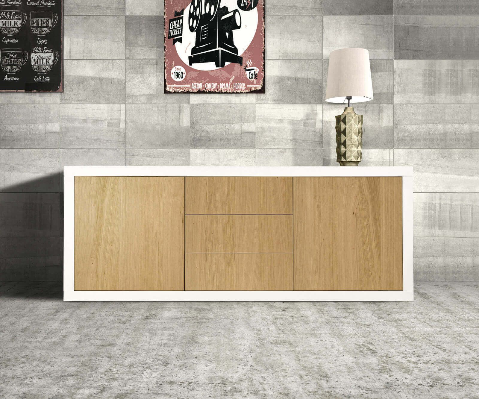 La madia Calvin è un mobile multifunzionale che si adatta perfettamente sia a un soggiorno che a un ufficio, grazie al suo mix di colori unico. Questa raffinata credenza italiana cattura l'attenzione con le sue linee pulite che dividono lo spazio in tre settori distinti. I tre cassetti centrali si aprono con un semplice tocco, mentre le parti laterali offrono un ampio spazio di archiviazione. Calvin è compatto ma spazioso, perfetto per organizzare e mantenere in ordine oggetti di varie dimensioni. Inoltre, il top può essere utilizzato per esporre oggetti decorativi o per sistemare la TV. Che tu voglia archiviare posate, cancelleria o libri professionali, Calvin è la scelta ideale per combinare stile e funzionalità in ogni ambiente.