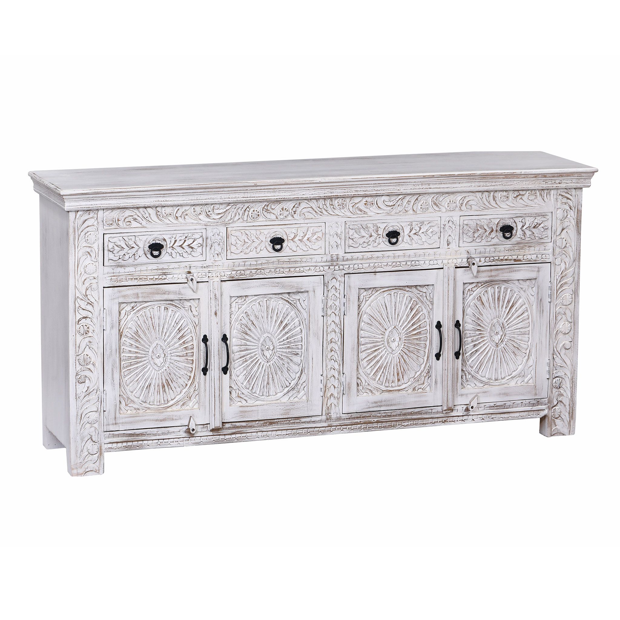 Elegante credenza in legno di mango con raffinata finitura bianca decapata e dettagli intagliati a motivo floreale. Dotata di quattro ante e quattro cassetti, offre ampio spazio contenitivo con un tocco shabby chic. Perfetta per soggiorni, sale da pranzo e ingressi, si adatta a stili rustici, vintage e provenzali con il suo design artigianale.