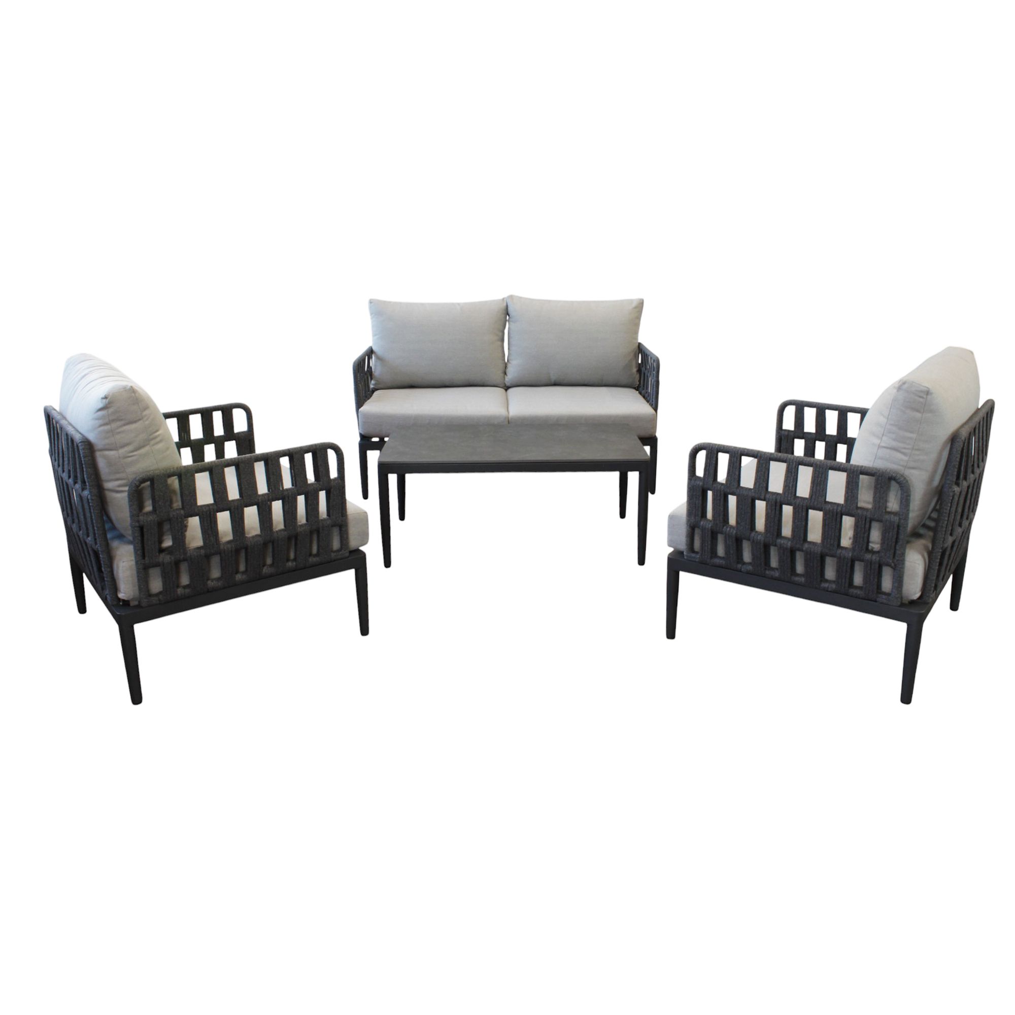 Un salotto da esterno elegante e confortevole, con struttura in alluminio resistente e schienale intrecciato in fettuccia di PVC. Disponibile in antracite, grigio chiaro e alluminio effetto legno, include un tavolino con piano in pietra sinterizzata. Cuscini sfoderabili e lavabili. Ideale per arredare con stile ogni spazio outdoor.