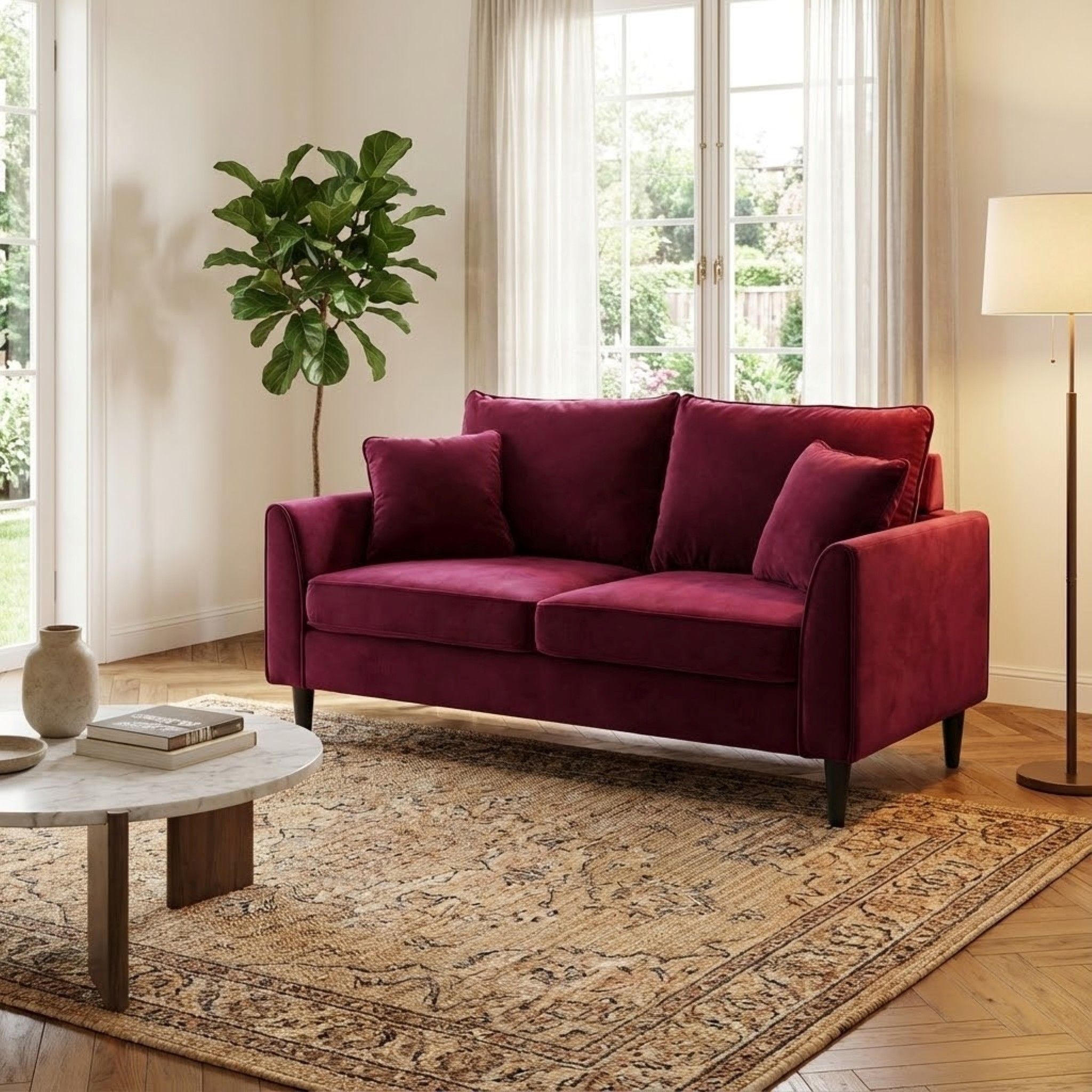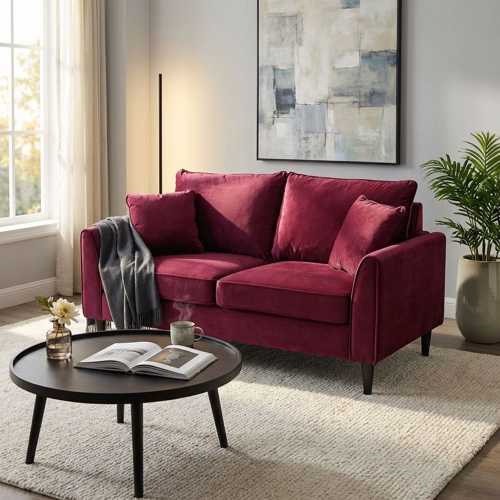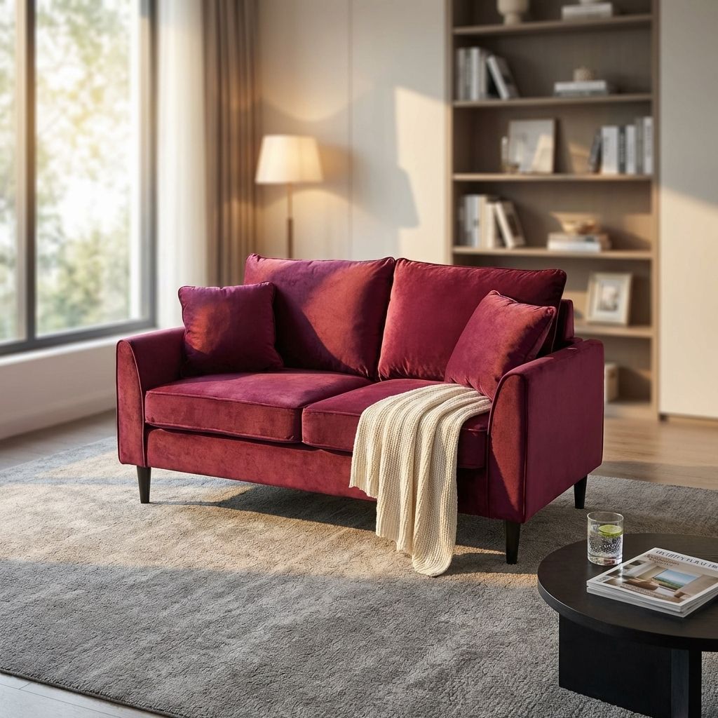 Divano 2 posti in velluto bordeaux dal design elegante e contemporaneo. Seduta confortevole con cuscini imbottiti e sfoderabili tramite zip. Struttura solida con piedini slanciati in finitura scura. Ideale per soggiorno o studio.