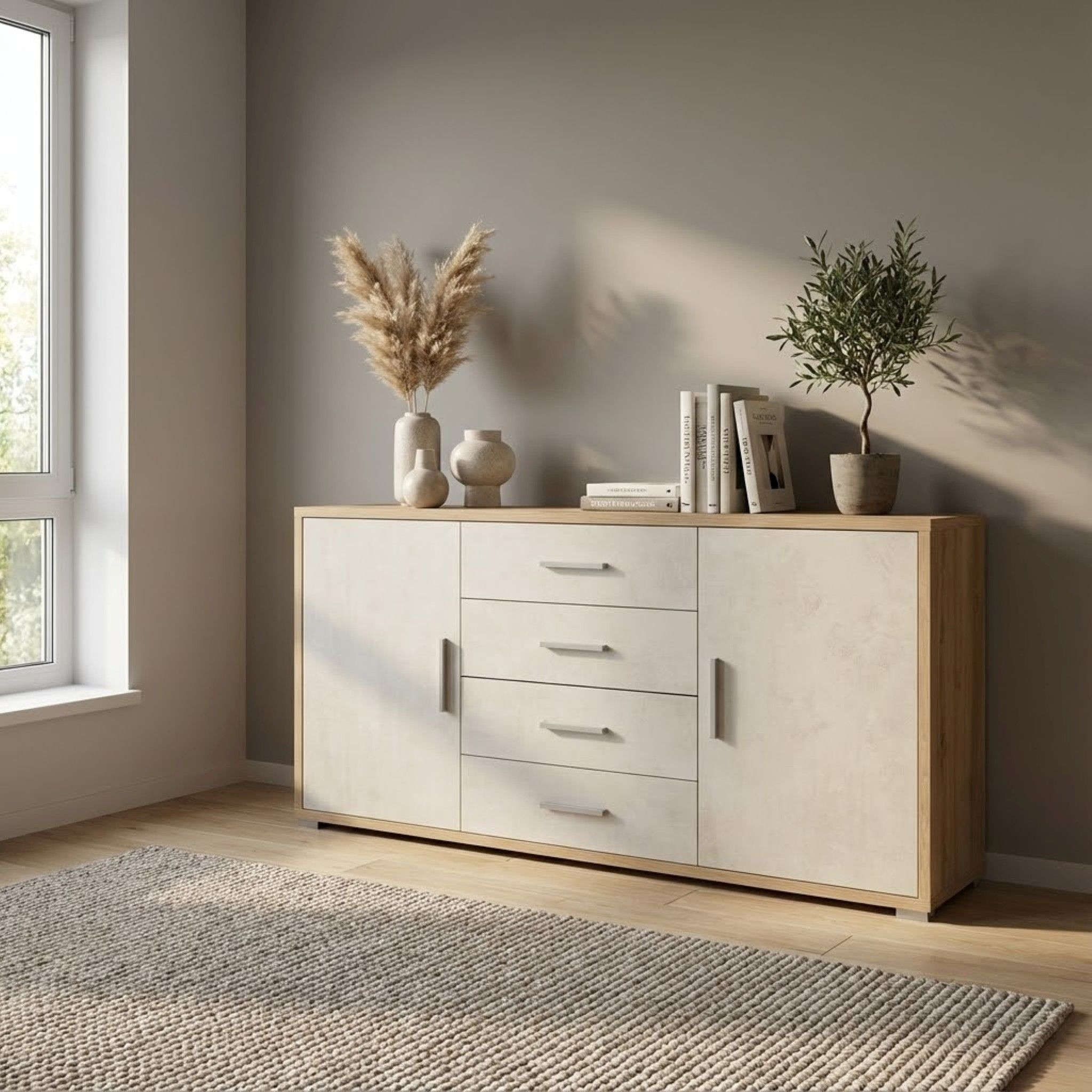 La madia CLINTON rappresenta l'essenza del design moderno, offrendo spazio e stile per un soggiorno sempre impeccabile. Un mobile versatile e elegante, ideale per chi desidera combinare bellezza e praticità.Disponibile in bianco e noce chiaro.