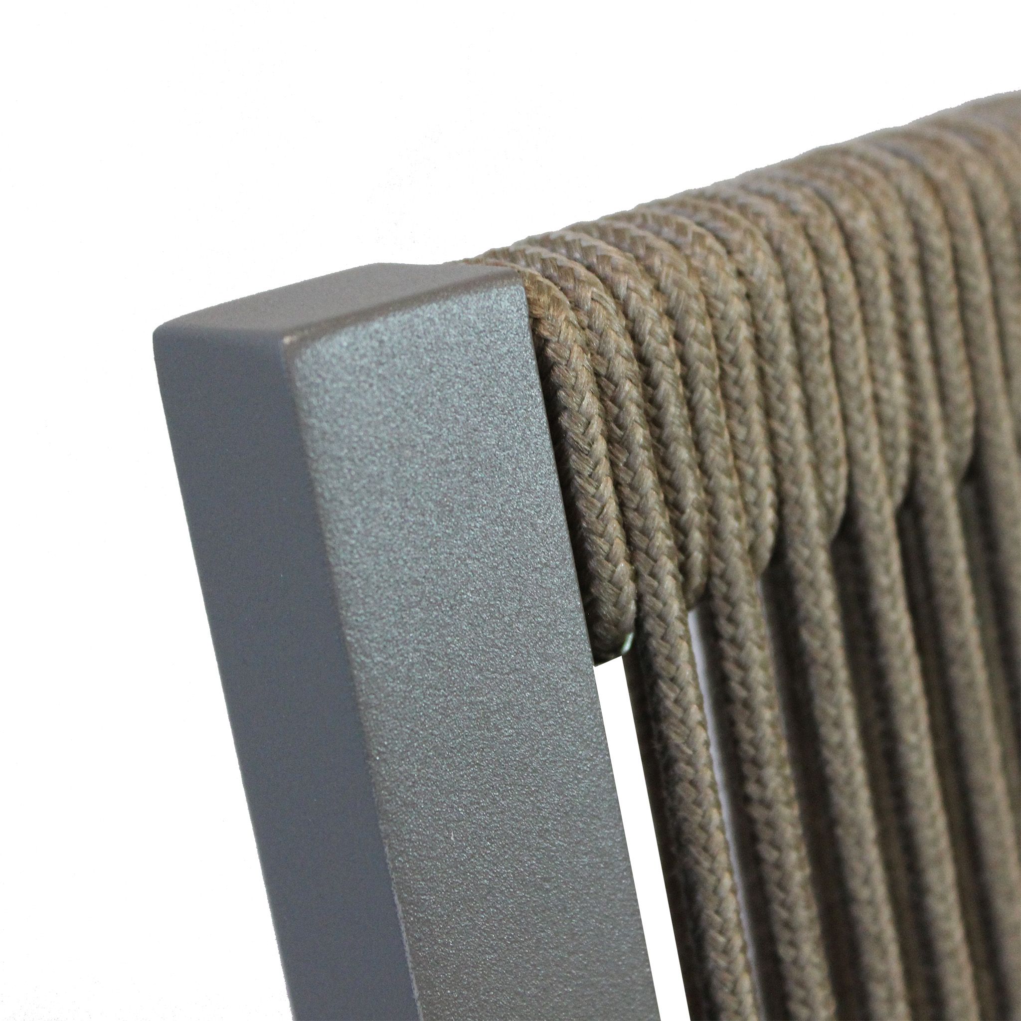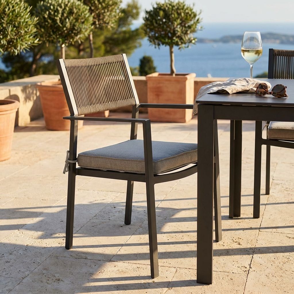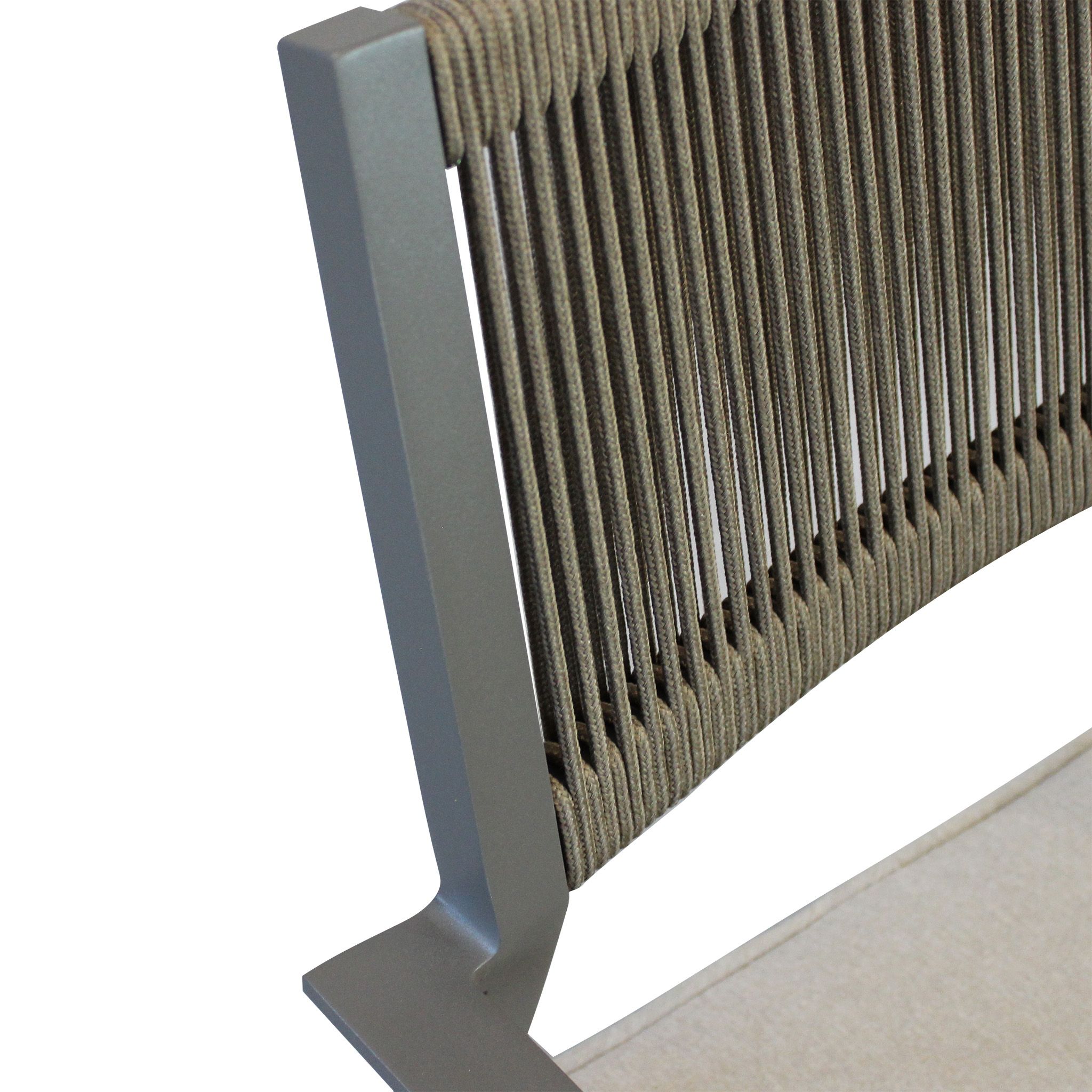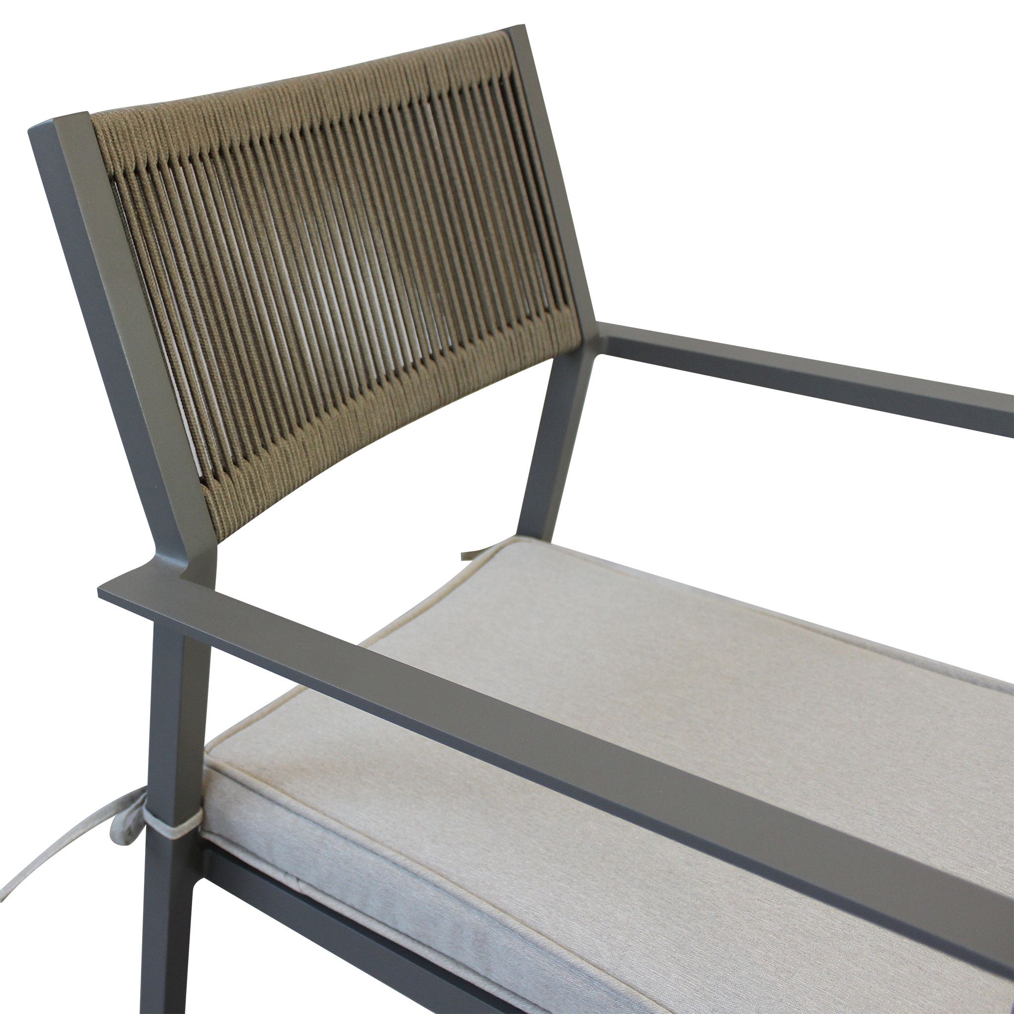 Questa poltrona da esterno combina design moderno e massimo comfort. La struttura in alluminio bianco, taupe o antracite è resistente e leggera, mentre lo schienale in corda di PVC dona un tocco elegante e sofisticato. La seduta ergonomica in doghe di alluminio è completata da un cuscino sfoderabile e lavabile, perfetto per un relax ottimale