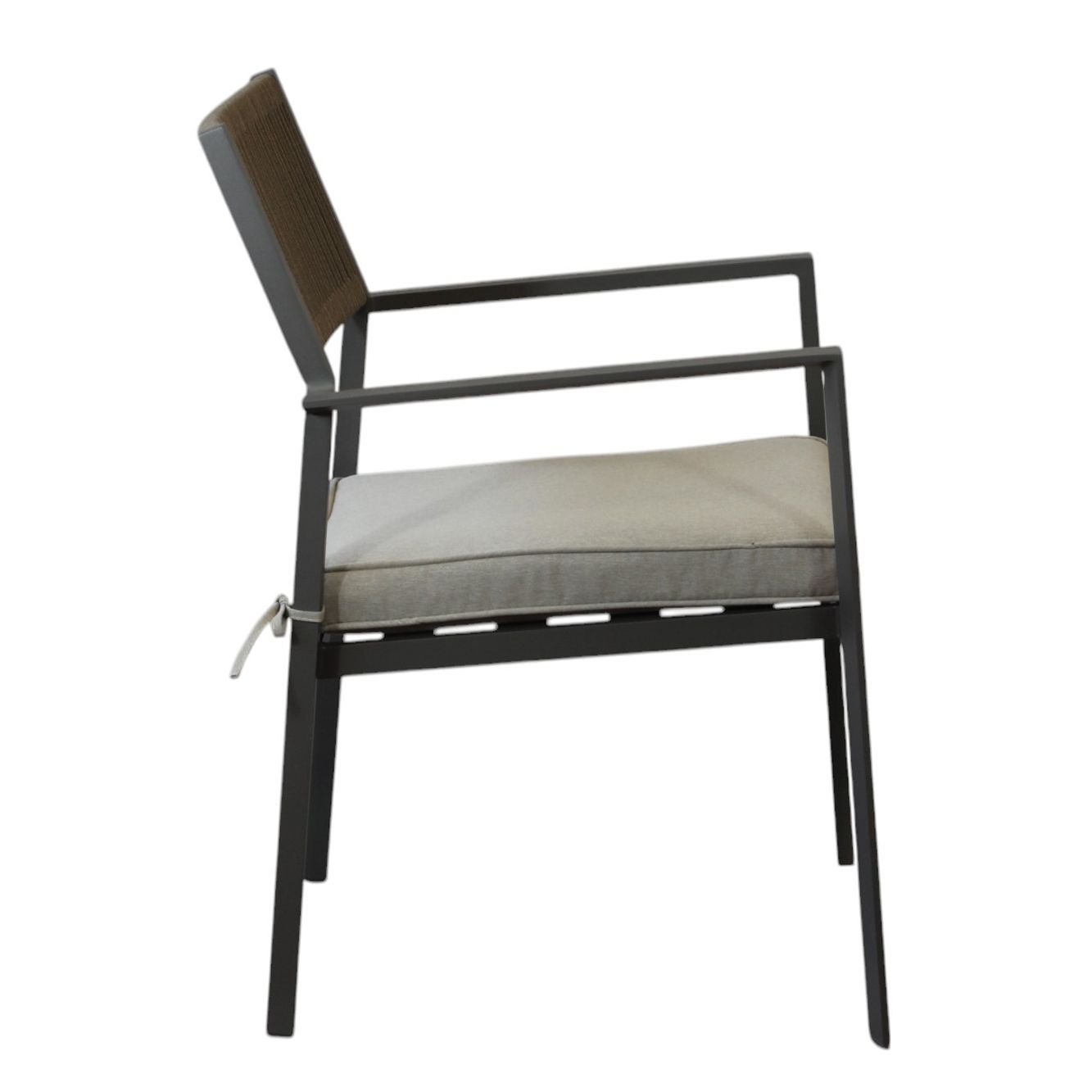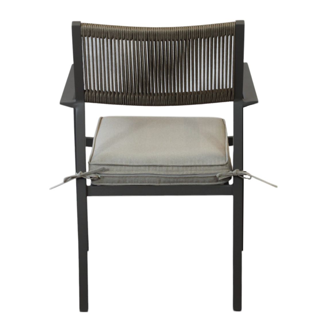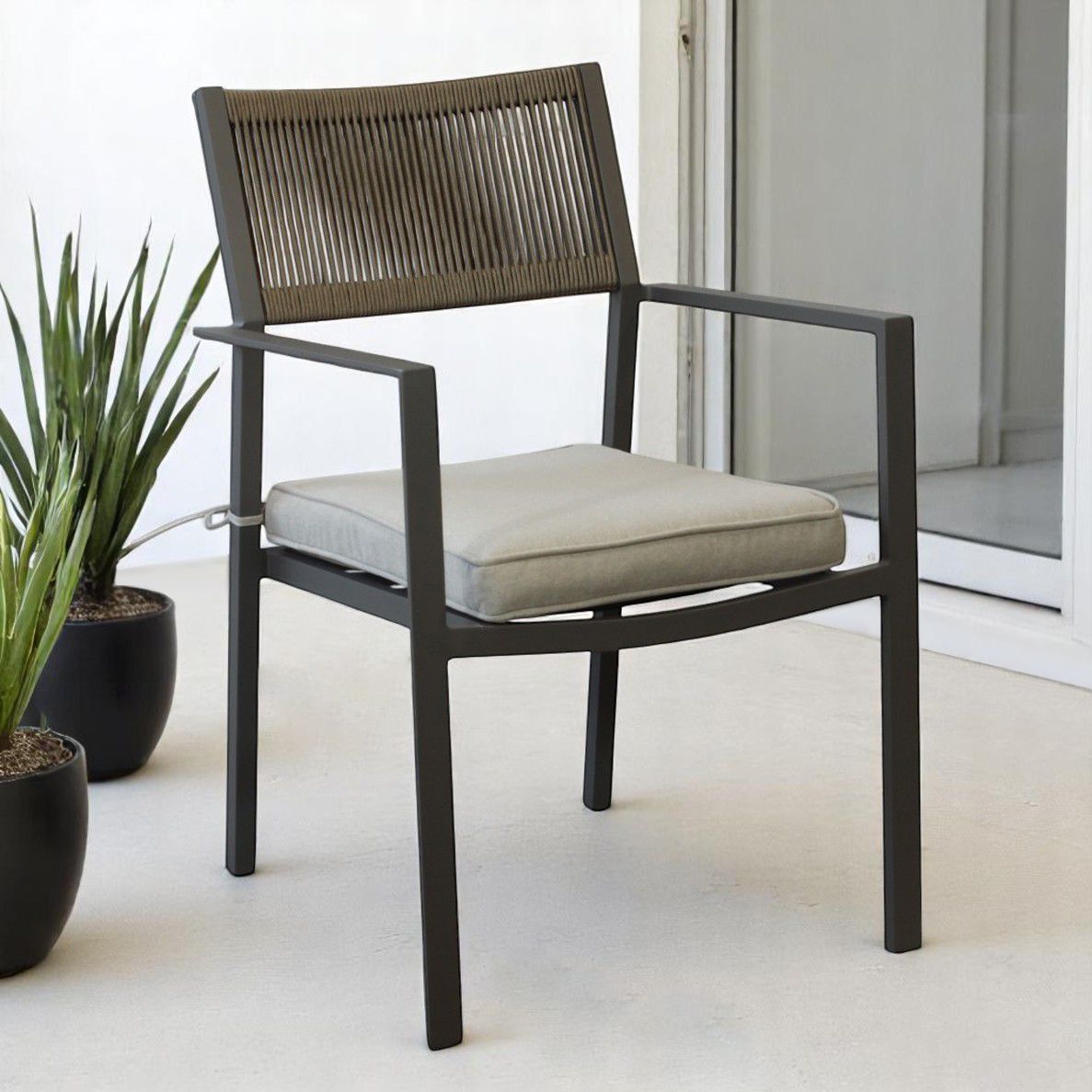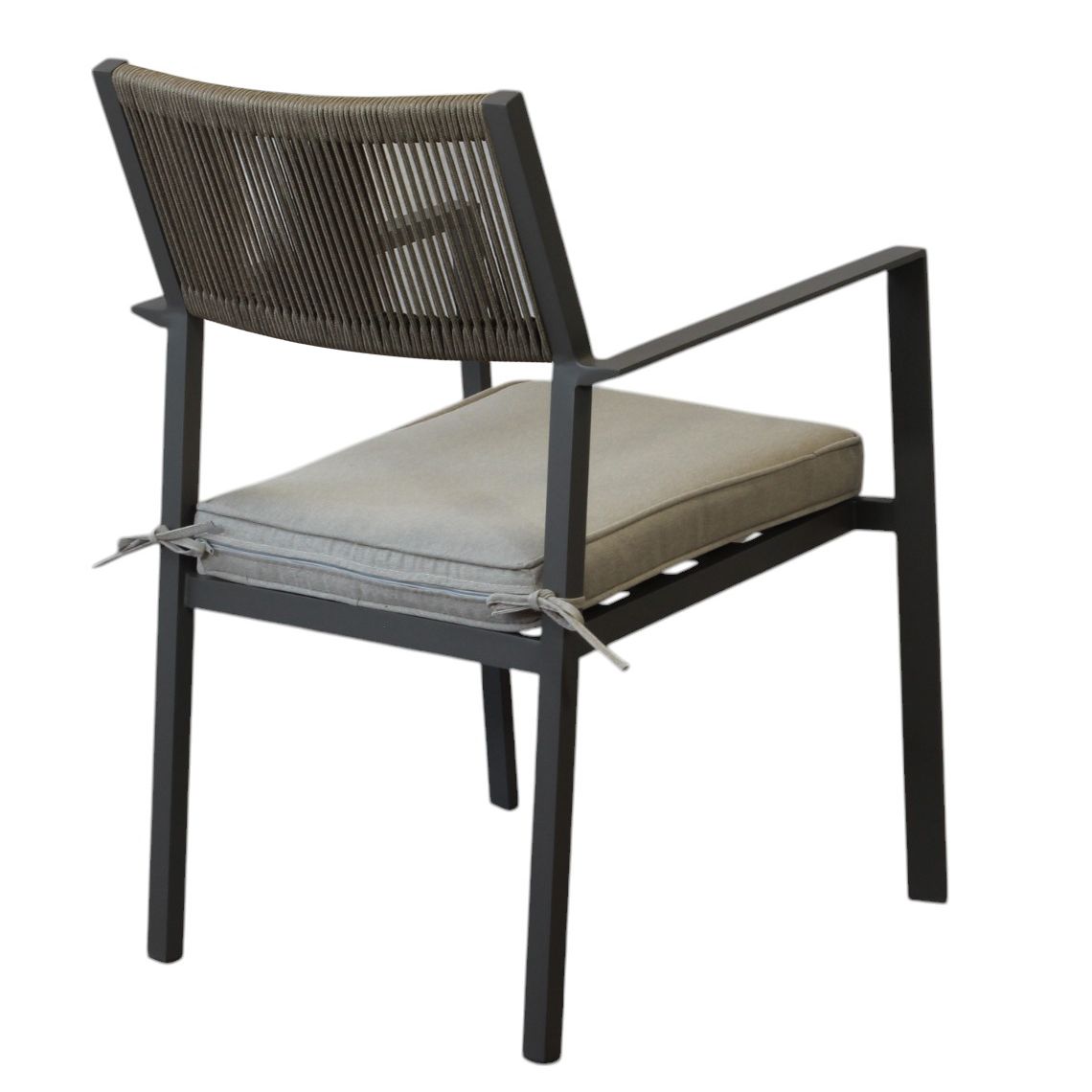 Questa poltrona da esterno combina design moderno e massimo comfort. La struttura in alluminio bianco, taupe o antracite è resistente e leggera, mentre lo schienale in corda di PVC dona un tocco elegante e sofisticato. La seduta ergonomica in doghe di alluminio è completata da un cuscino sfoderabile e lavabile, perfetto per un relax ottimale