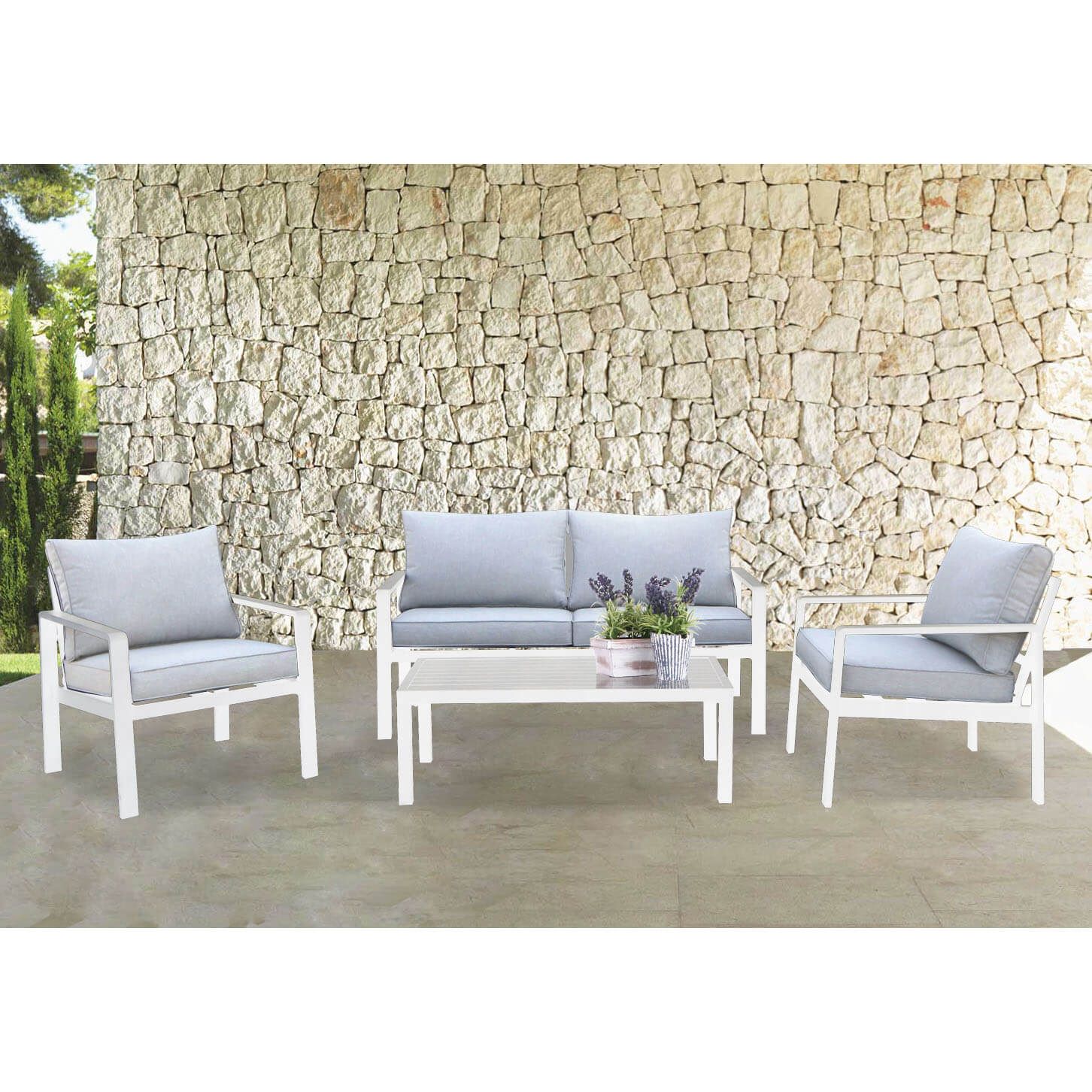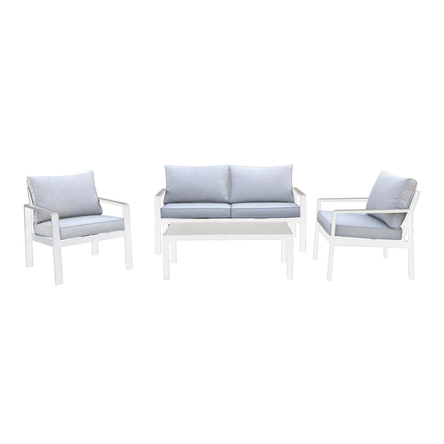 CORONA è un salotto 5 posti totalmente in alluminio con cuscini sfoderabili disponibile in 2 varinti colori bianco e antracite