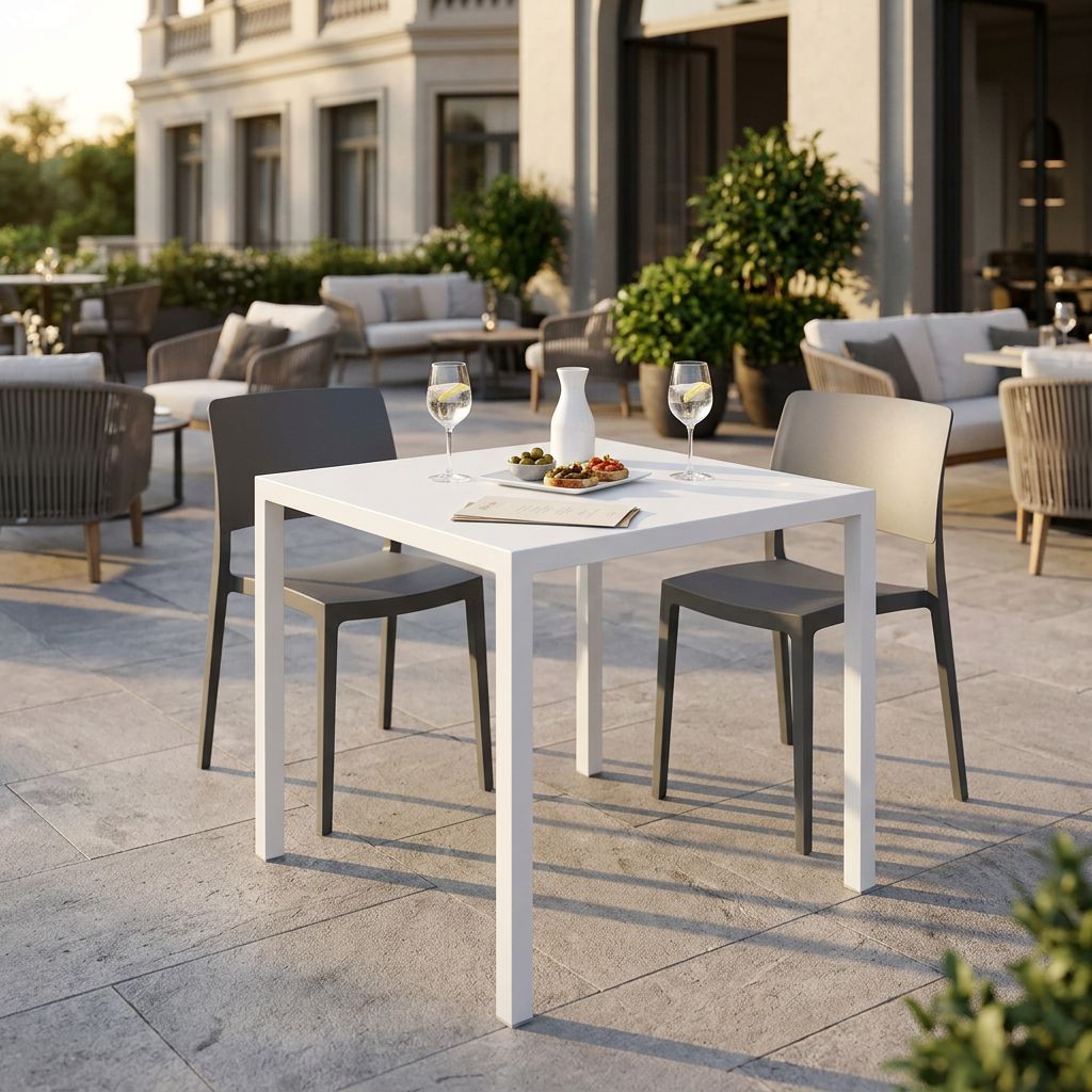 Tavolo contract 80x80 cm in metallo, ideale per bar, ristoranti, terrazze e spazi professionali. Struttura solida e resistente con sistema autolivellante per garantire stabilità anche su superfici irregolari. Design essenziale e moderno. Disponibile nei colori bianco e antracite.