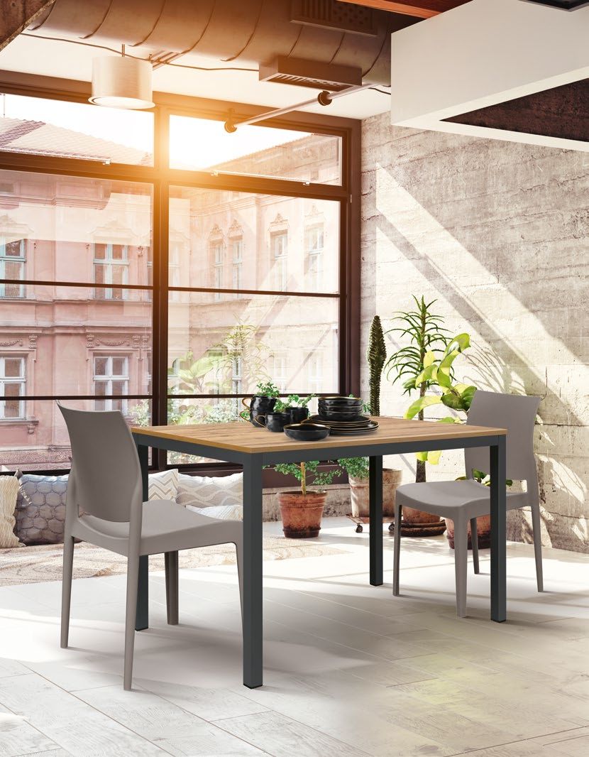 Tavolo da pranzo rettangolare o quadrato con struttura nera o bianca e piano disponibile in legno naturale, grigio o bianco. Linee moderne e pulite lo rendono perfetto per qualsiasi ambiente, donando eleganza e praticità.
