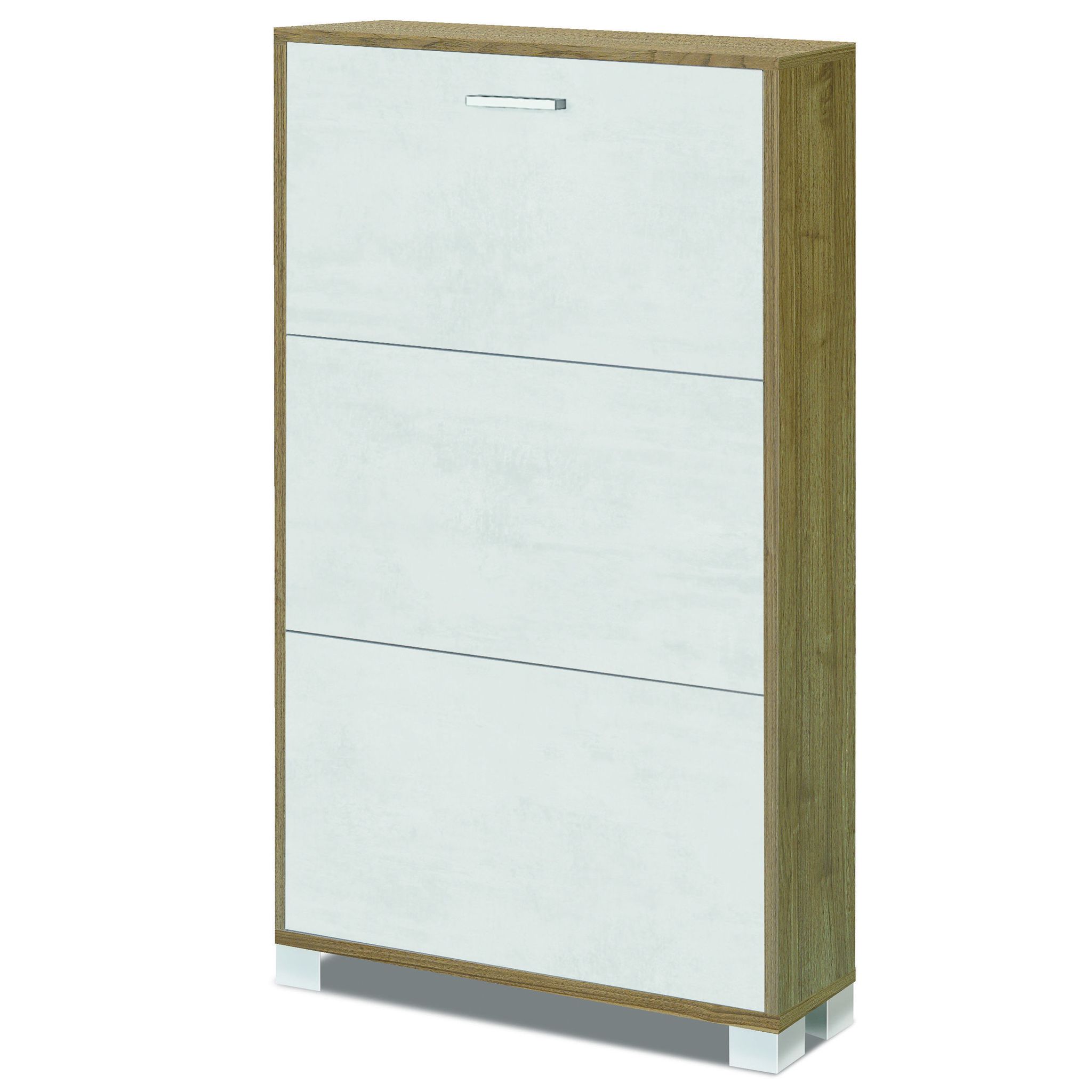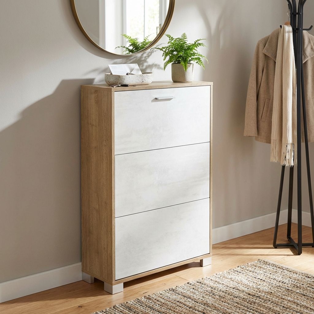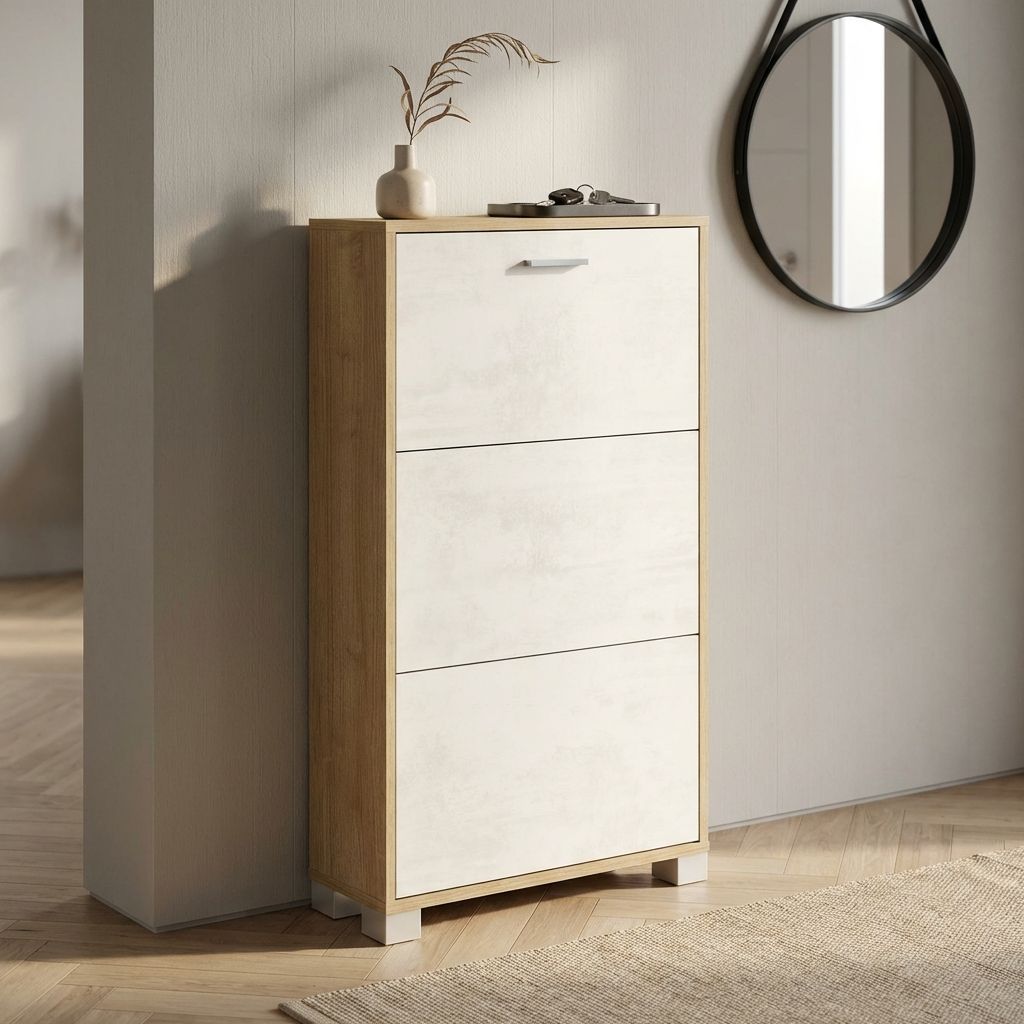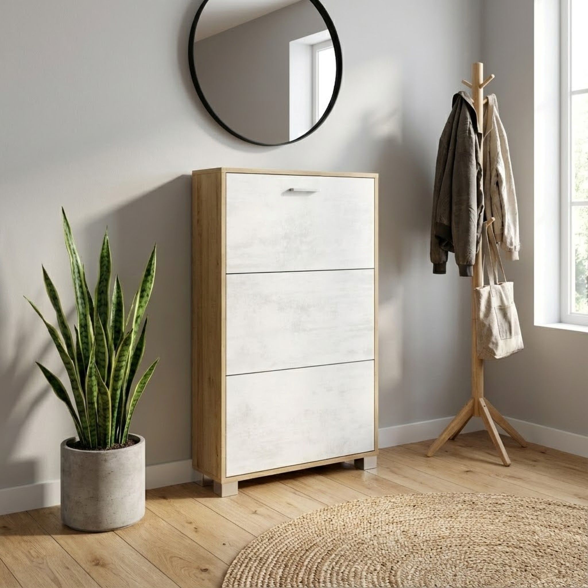 DEBBY, la scarpiera a 3 ante dal design sobrio e raffinato, si presenta come la soluzione ideale per arricchire l'ingresso di casa con eleganza e ordine. Offre un'ampia capacità di stoccaggio pur mantenendo un'estetica piacevole e un'usabilità intuitiva. Disponibile in bianco/noce chiaro, noce/ nero e bianco ossido/grigio.