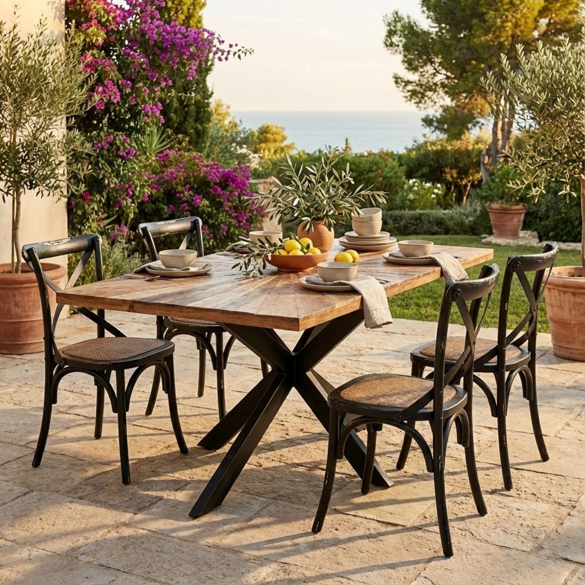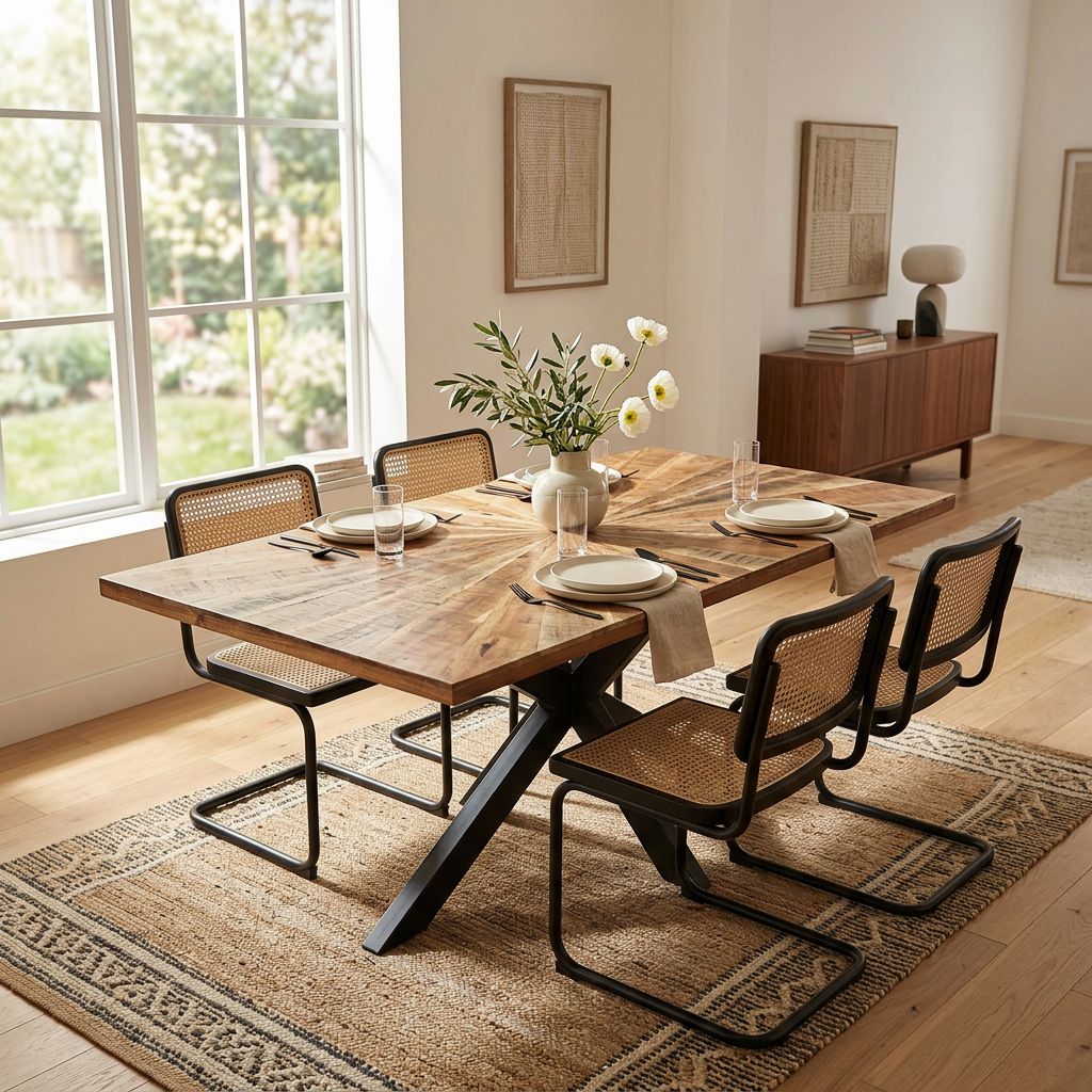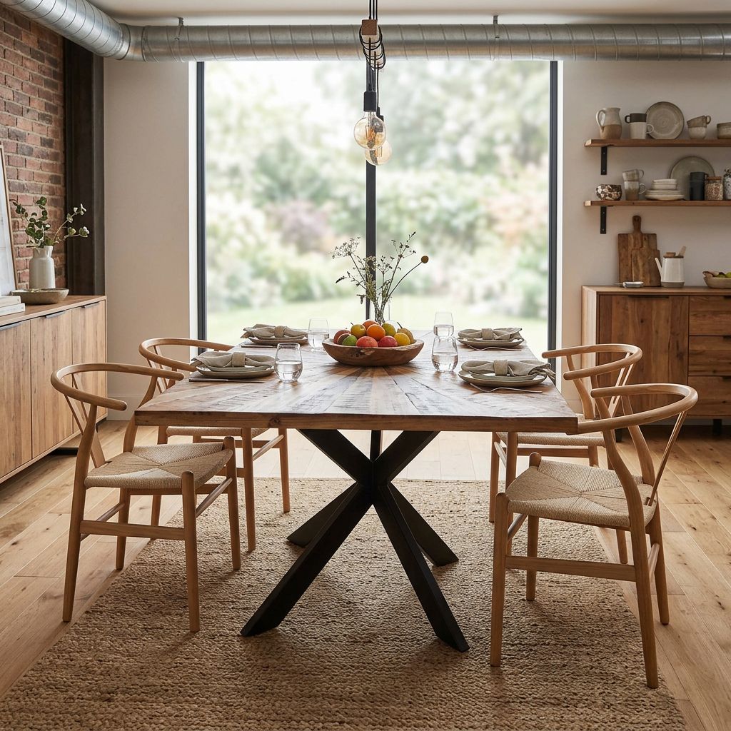 DENNY è un tavolo che combina la calda estetica del legno massiccio con un design a raggiera e gambe in metallo forti e stilizzate, offrendo un punto focale di design unico per qualsiasi ambiente.
