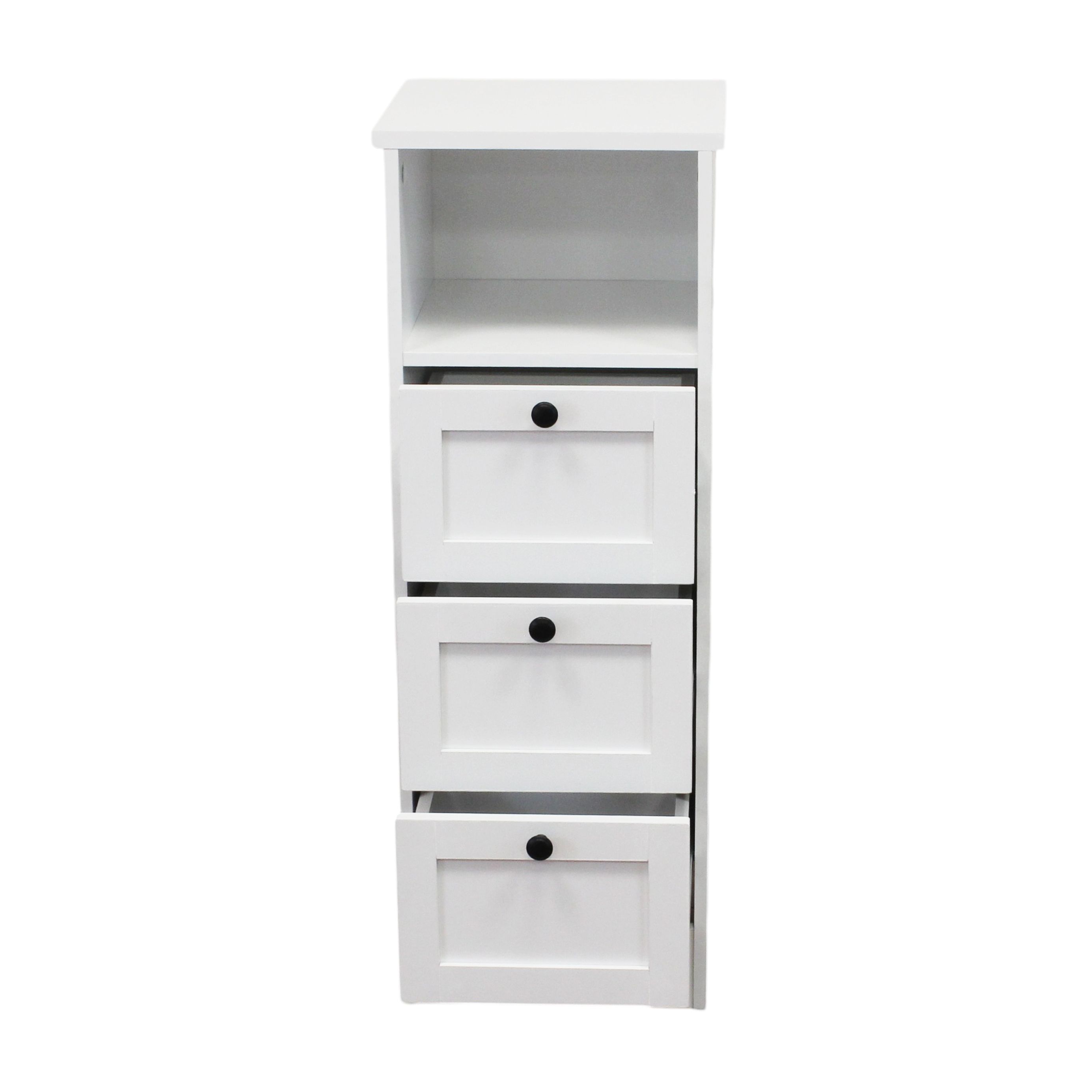 Mobiletto in pannello truciolare con tre cassetti e vano a giorno. Linee essenziali e finitura bianca lo rendono elegante e versatile, adatto a bagno, camera o ingresso. I cassetti con maniglie nere garantiscono ordine e praticità, mentre il vano aperto aggiunge spazio utile e decorativo. Resistente, compatto e funzionale.