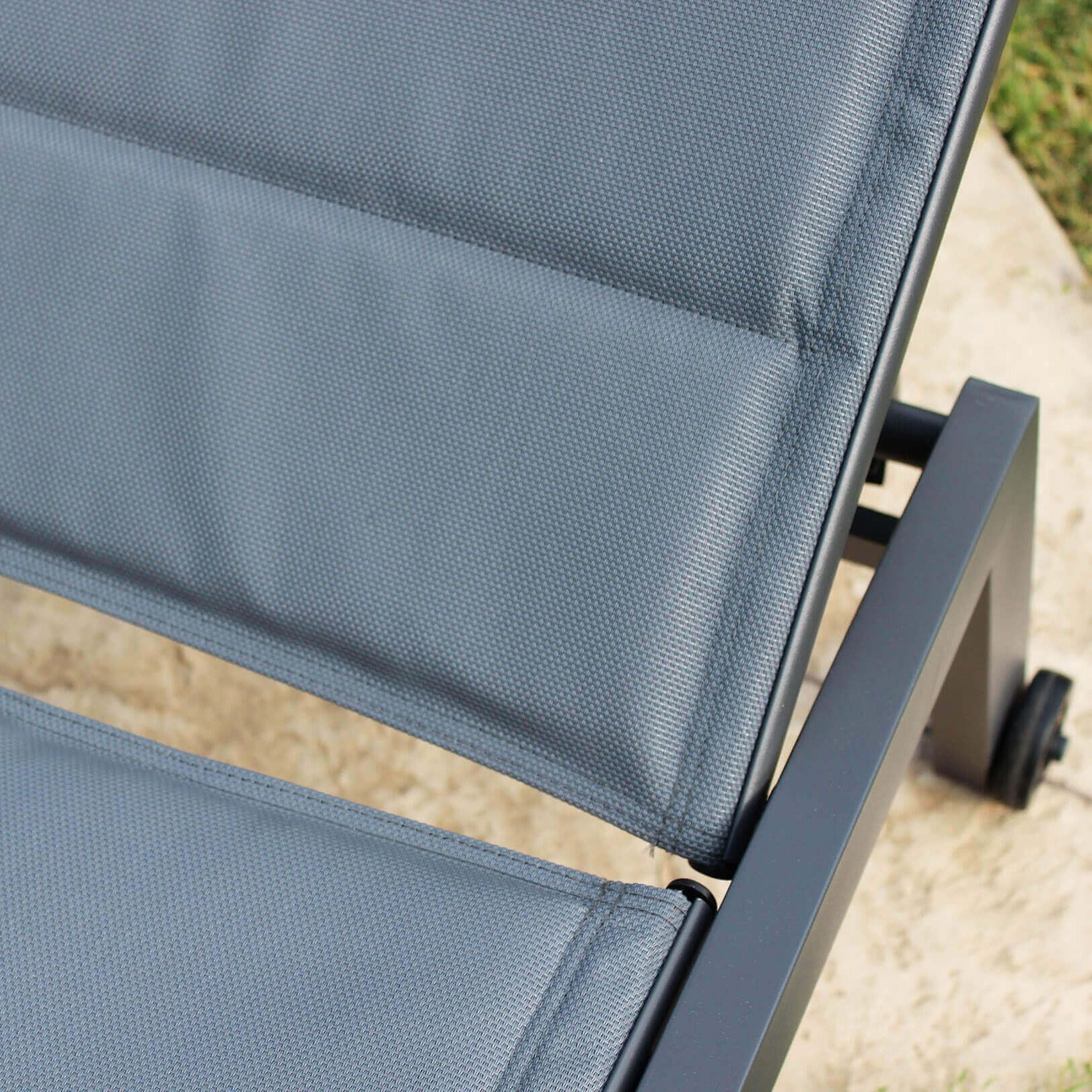 Lettino prendisole con struttura in alluminio e seduta in textilene. Schienale regolabile, ruote posteriori per facile spostamento, sovrapponibile. Perfetto per spazi outdoor eleganti e funzionali.