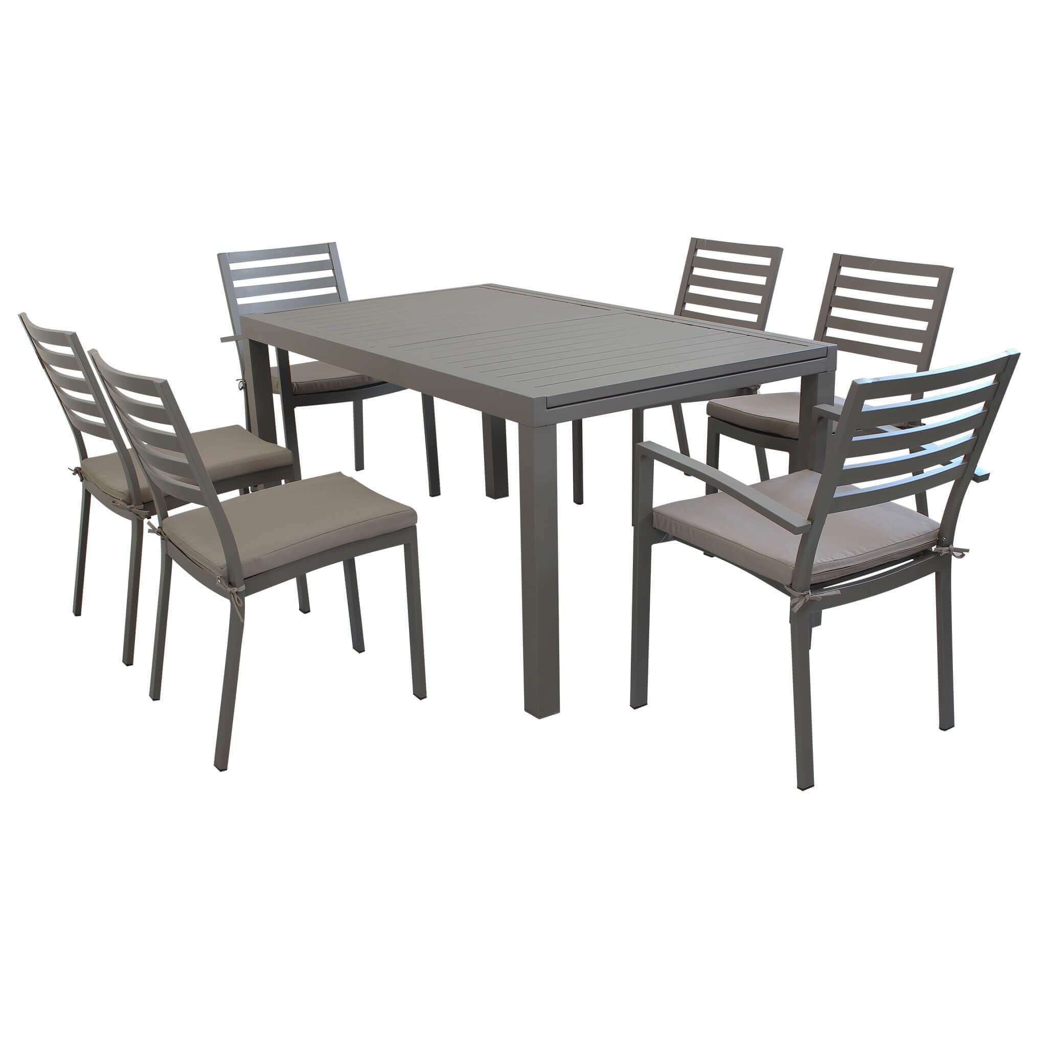 Il set DEXTER è disponibile con 4, 6, 8, 10 poltrone in colore bianco, antracite, tortora e taupe inoltre è possibile scegliere due dimensioni del tavolo, 160x90 allungabile fino a 240 cm e 200x100 allungabile fino a 300 cm