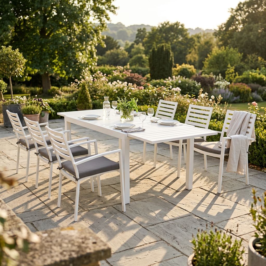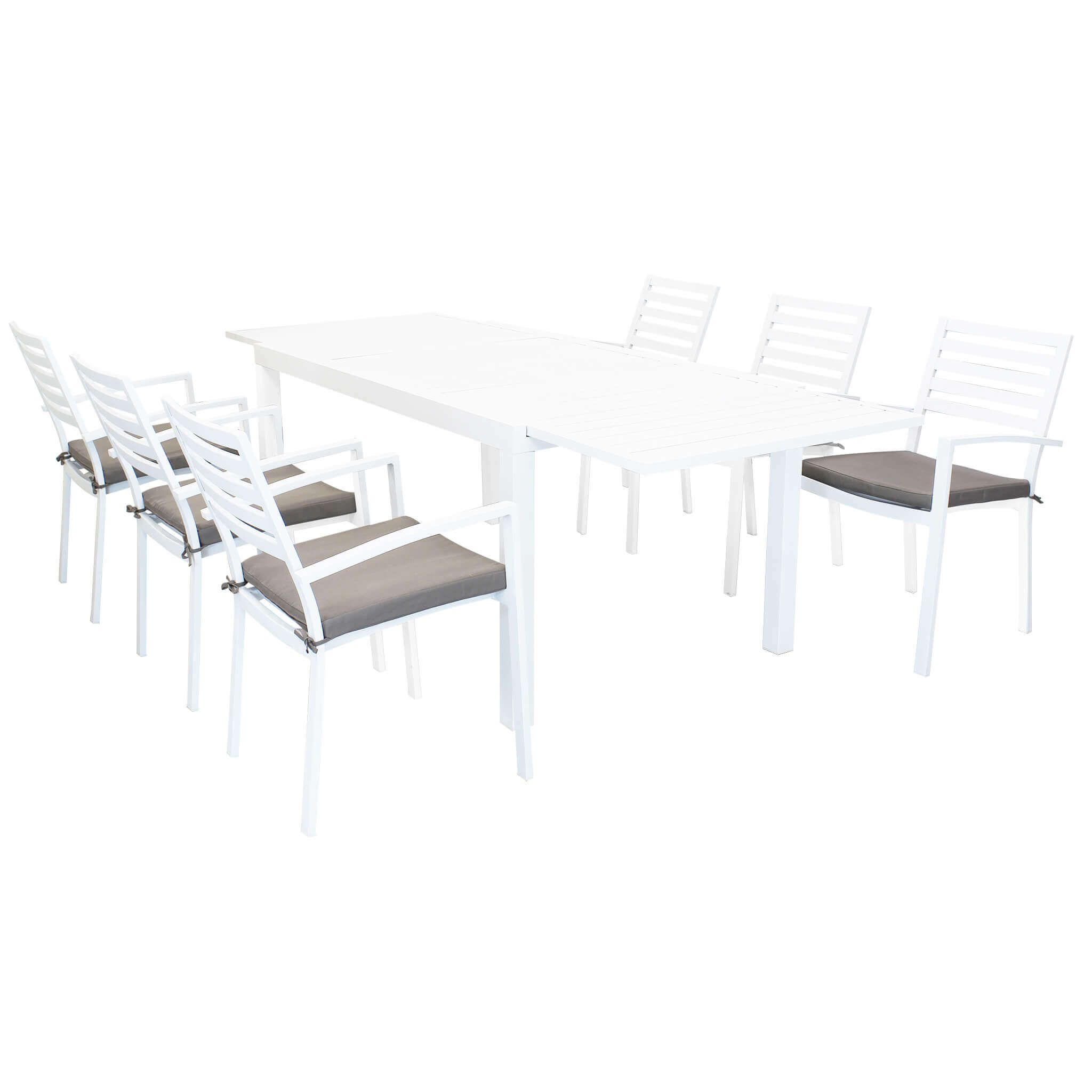 Il set DEXTER è disponibile con 4, 6, 8, 10 poltrone in colore bianco, antracite, tortora e taupe inoltre è possibile scegliere due dimensioni del tavolo, 160x90 allungabile fino a 240 cm e 200x100 allungabile fino a 300 cm