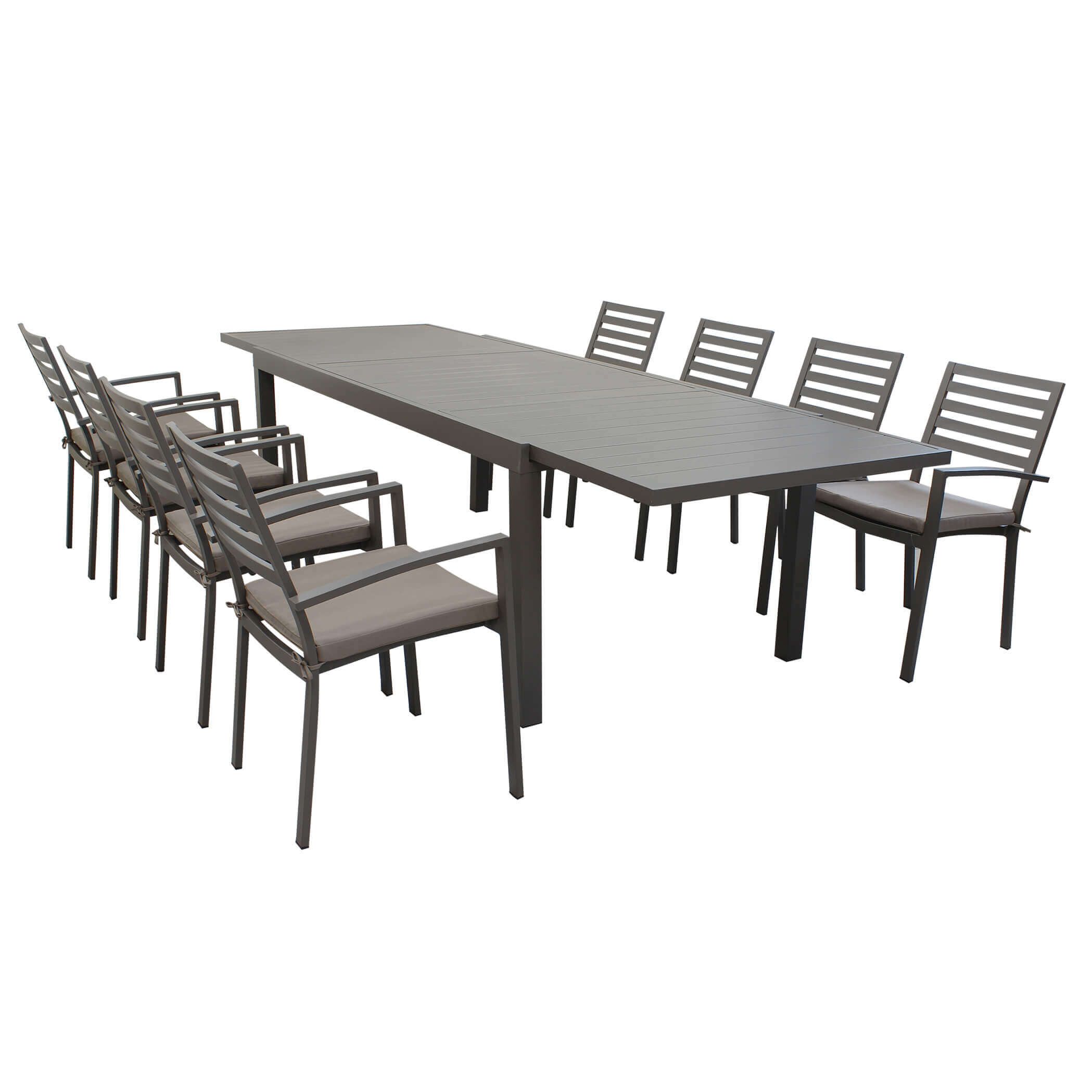 Il set DEXTER è disponibile con 4, 6, 8, 10 poltrone in colore bianco, antracite, tortora e taupe inoltre è possibile scegliere due dimensioni del tavolo, 160x90 allungabile fino a 240 cm e 200x100 allungabile fino a 300 cm