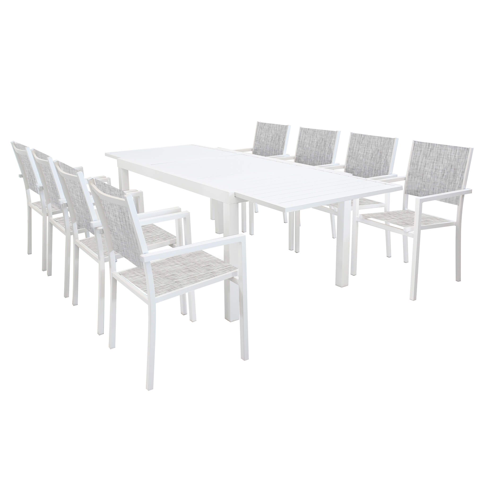 Il set DEXTER è disponibile con 4, 6, 8, 10 poltrone in colore bianco, antracite, tortora e taupe inoltre è possibile scegliere due dimensioni del tavolo, 160x90 allungabile fino a 240 cm e 200x100 allungabile fino a 300 cm