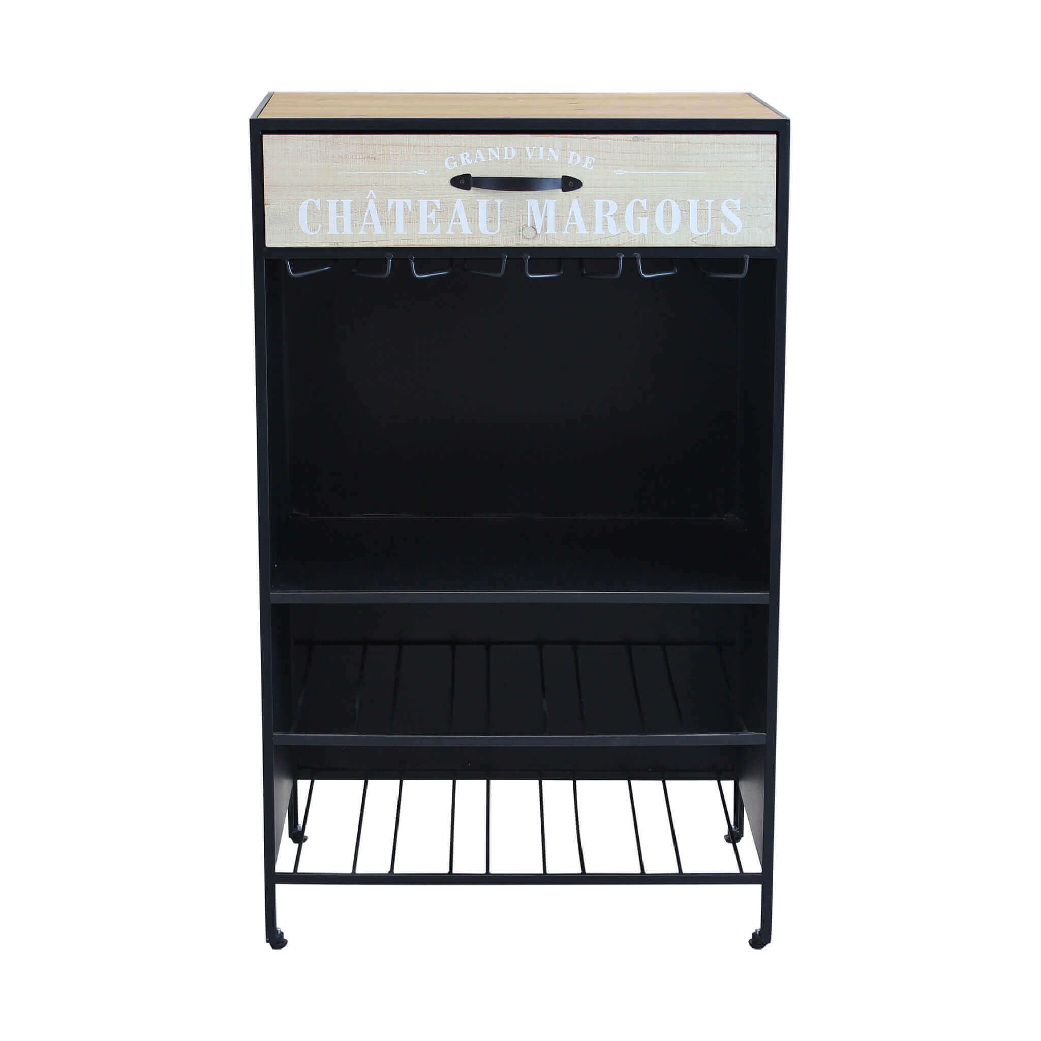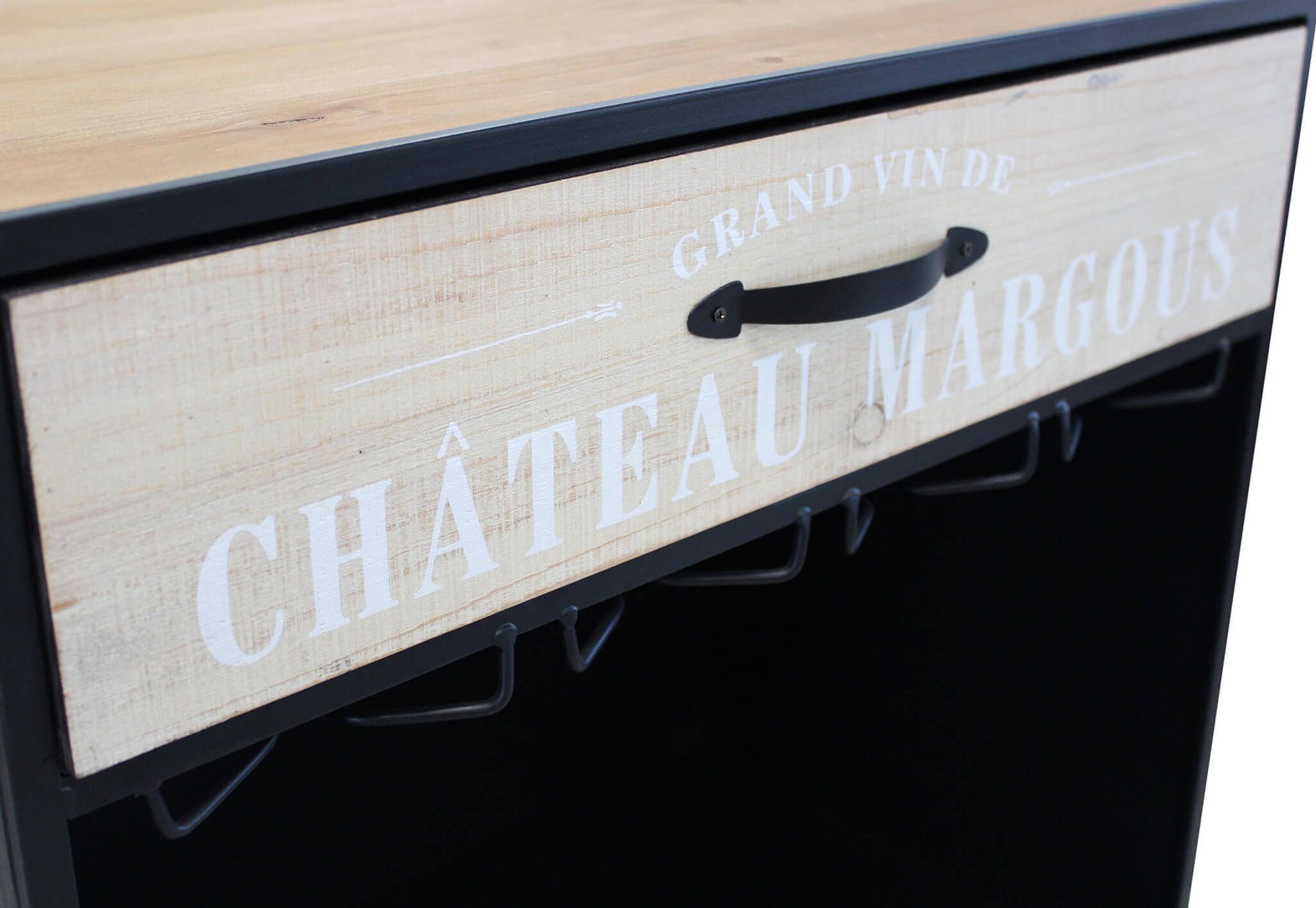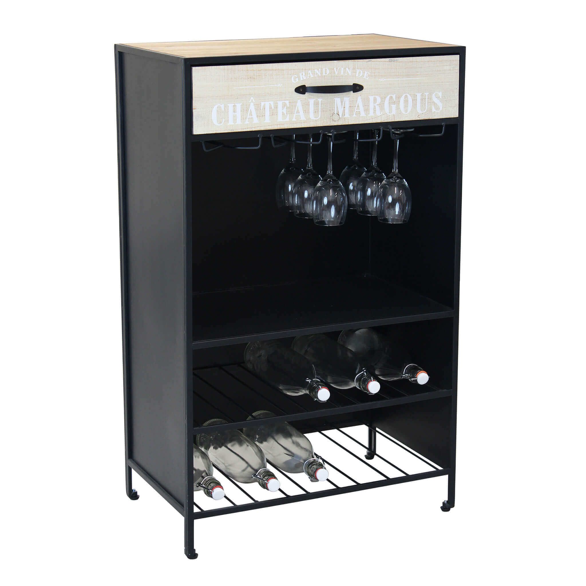 Fantastico mobile portabottiglie in perfetto stile industriale, DIRK è fornito di tutti gli elementi per custodire nel modo migliore e pratico le vostre bottiglie più pregiate. Infatti, il nostro mobiletto industrial, è composto da un piano d'appoggio e un cassettino in legno dove riporre gli oggetti in maniera pratica e ordinata. Al di sotto vi sono dei pratici portabicchieri in sospensione che aumentaranno il carattere della vostra stanza e 3 ripiani in metallo in stile rastrelliera per appggiare le bottiglie in maniera orizzontale. Il materiale utilizzato come il ferro anche grezzo, contribuisce a creare ambienti in stile industrial unici e originali.