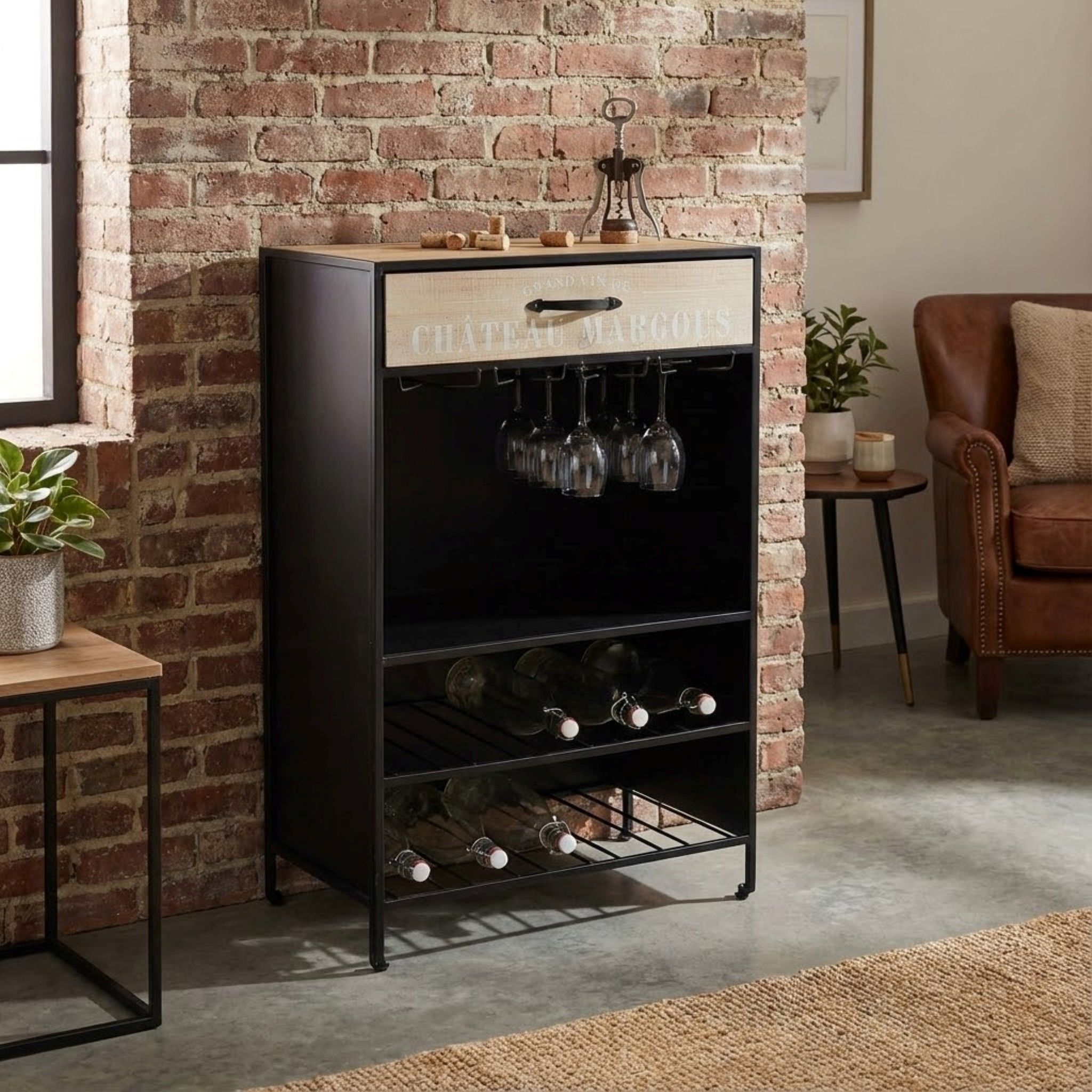 DIRK è un mobile portabottiglie dallo stile industriale perfetto. Con il suo piano d'appoggio, cassettino e portabicchieri sospesi, è l'ideale per conservare ed esporre le bottiglie preziose. I ripiani in metallo conferiscono un tocco rustico, mentre il ferro grezzo crea un'atmosfera unica e originale.test a