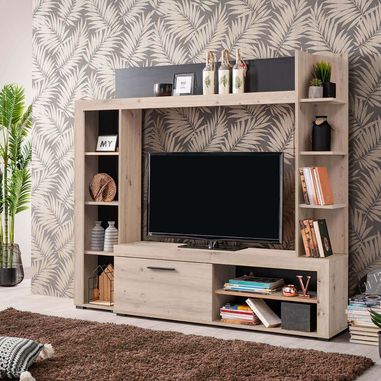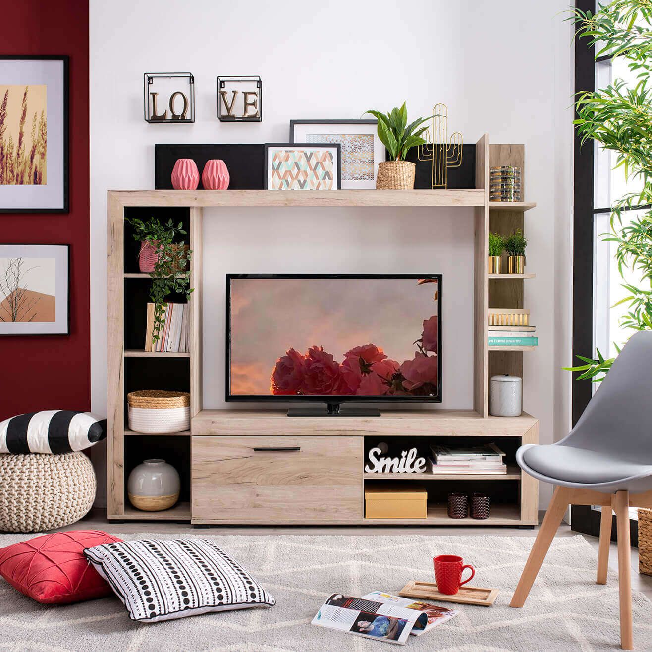 • ZONA TV ORGANIZZATA: struttura con basi, pensili e vani a giorno per sistemare tv, decoder, console, libri e oggetti decorativi in modo ordinato e sempre a portata di mano.