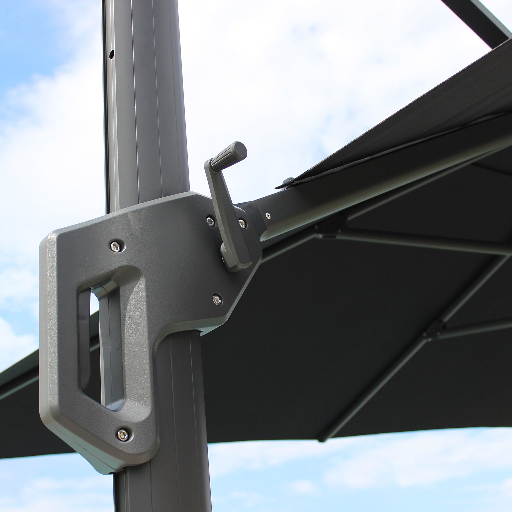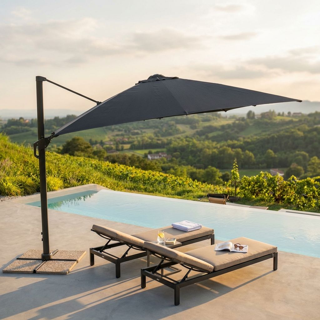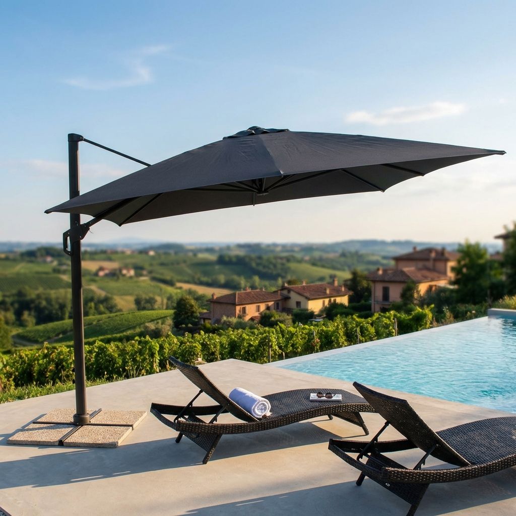 Ombrellone da esterno 3x4 m con struttura in alluminio e palo laterale, dotato di telo impermeabile in nylon. Design raffinato e pratico, offre un’ampia zona d’ombra. Disponibile in tre varianti: bianco con telo bianco, nero con telo beige, nero con telo nero. Ideale per giardini, terrazze e aree relax.