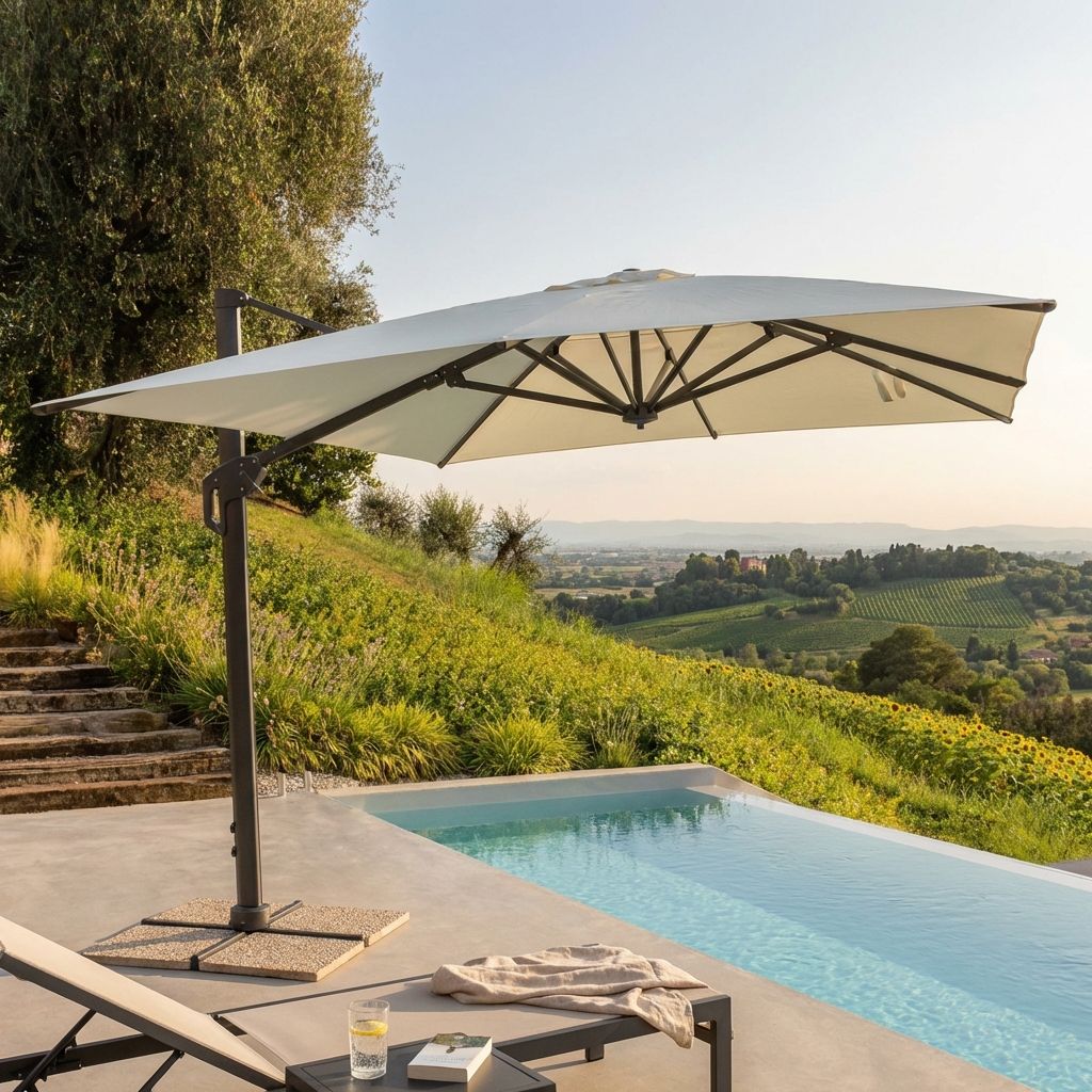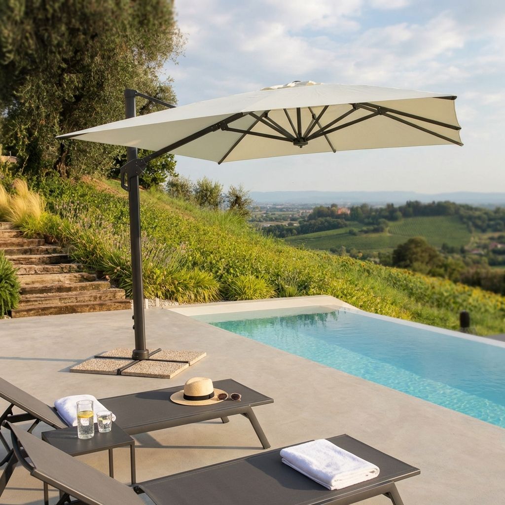 Ombrellone da esterno 3x4 metri con robusta struttura in alluminio e palo decentrato, dotato di telo impermeabile in nylon. Grazie al design elegante e funzionale, offre una generosa copertura. Disponibile in tre colorazioni: bianco/bianco, nero/beige e nero/nero. Perfetto per giardini, terrazze e aree relax moderne ed eleganti.