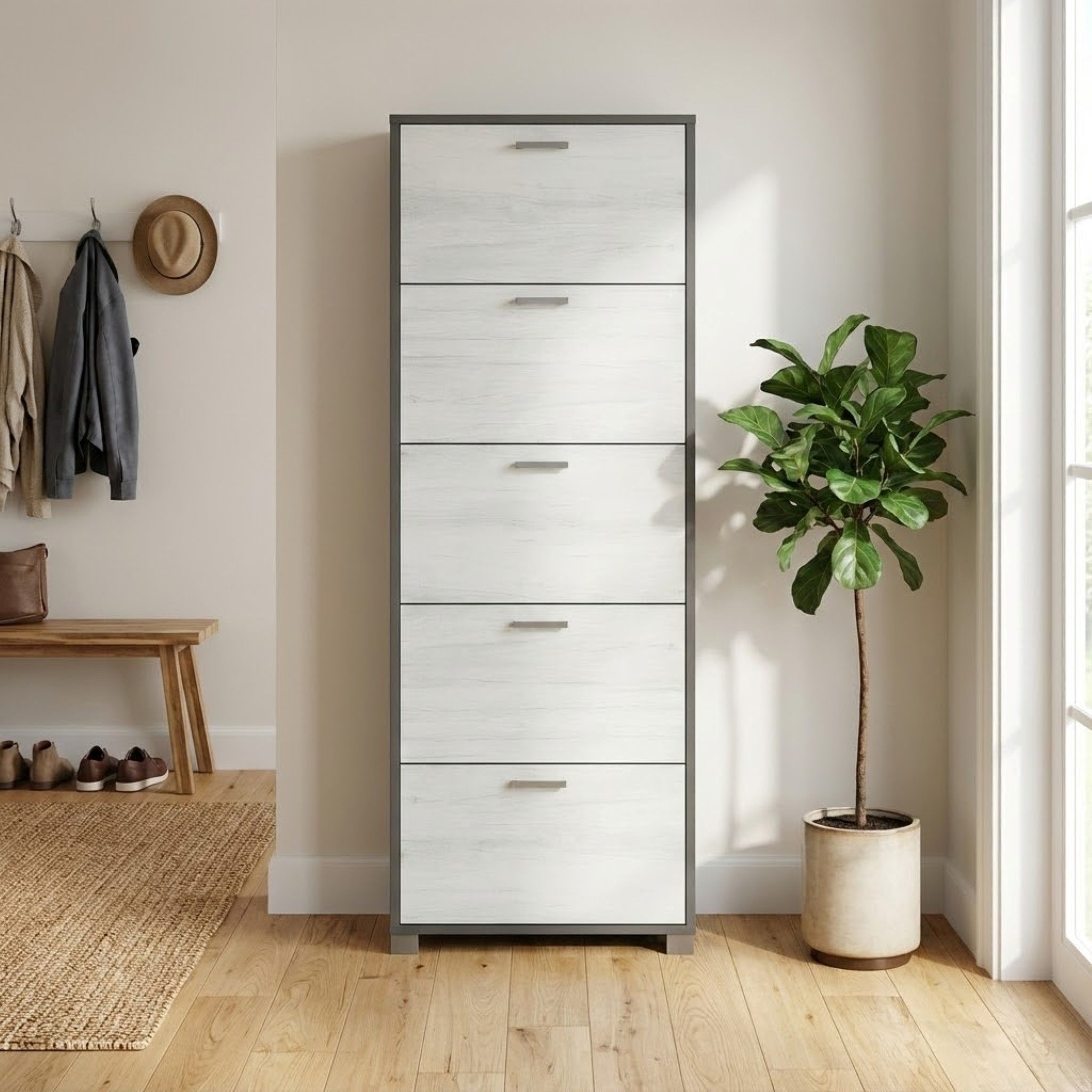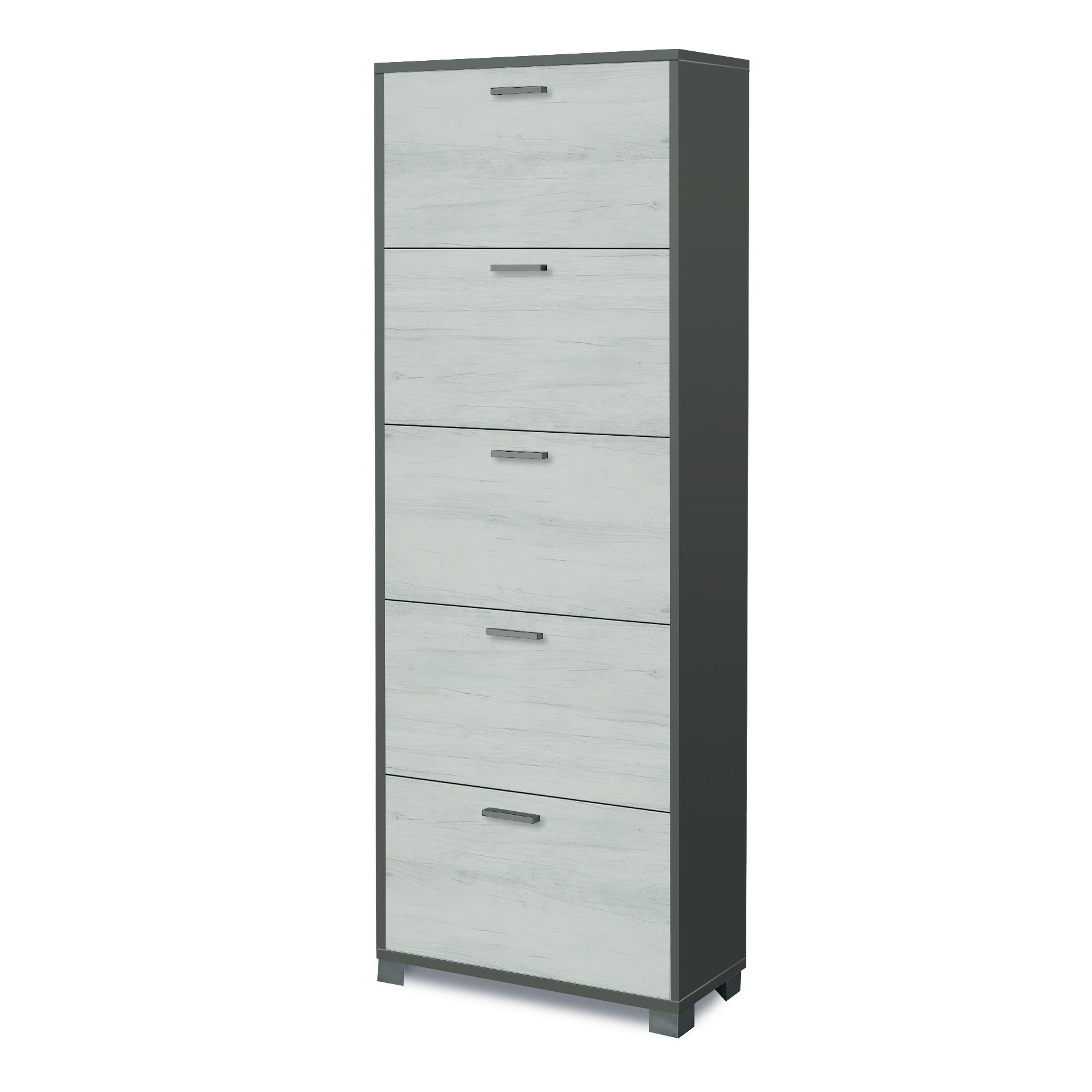 ECHO è una scarpiera a 5 ante che incarna eleganza e funzionalità. Un complemento d'arredo che risponde all'esigenza di ordine e stile in ogni spazio domestico. Disponibile in bianco/noce chiaro, noce/nero e bianco ossido/grigio.