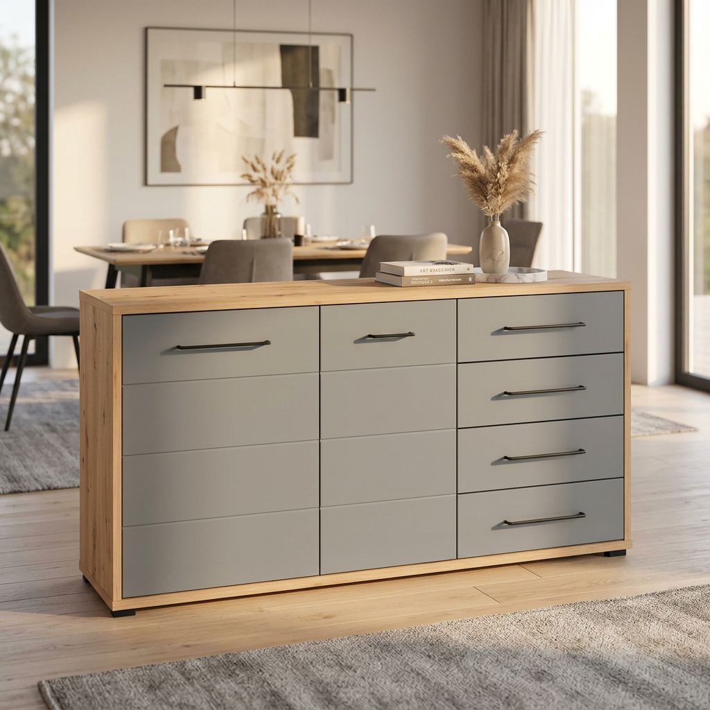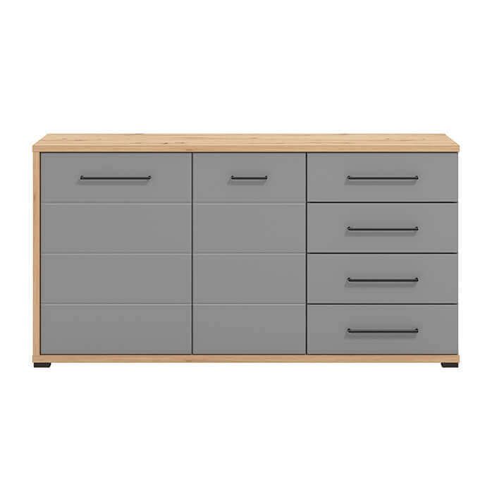 La madia moderna ELLIE è disponibile in due colori: antracite e grigio. Entrambe le varianti colore hanno una struttura in color legno naturale.