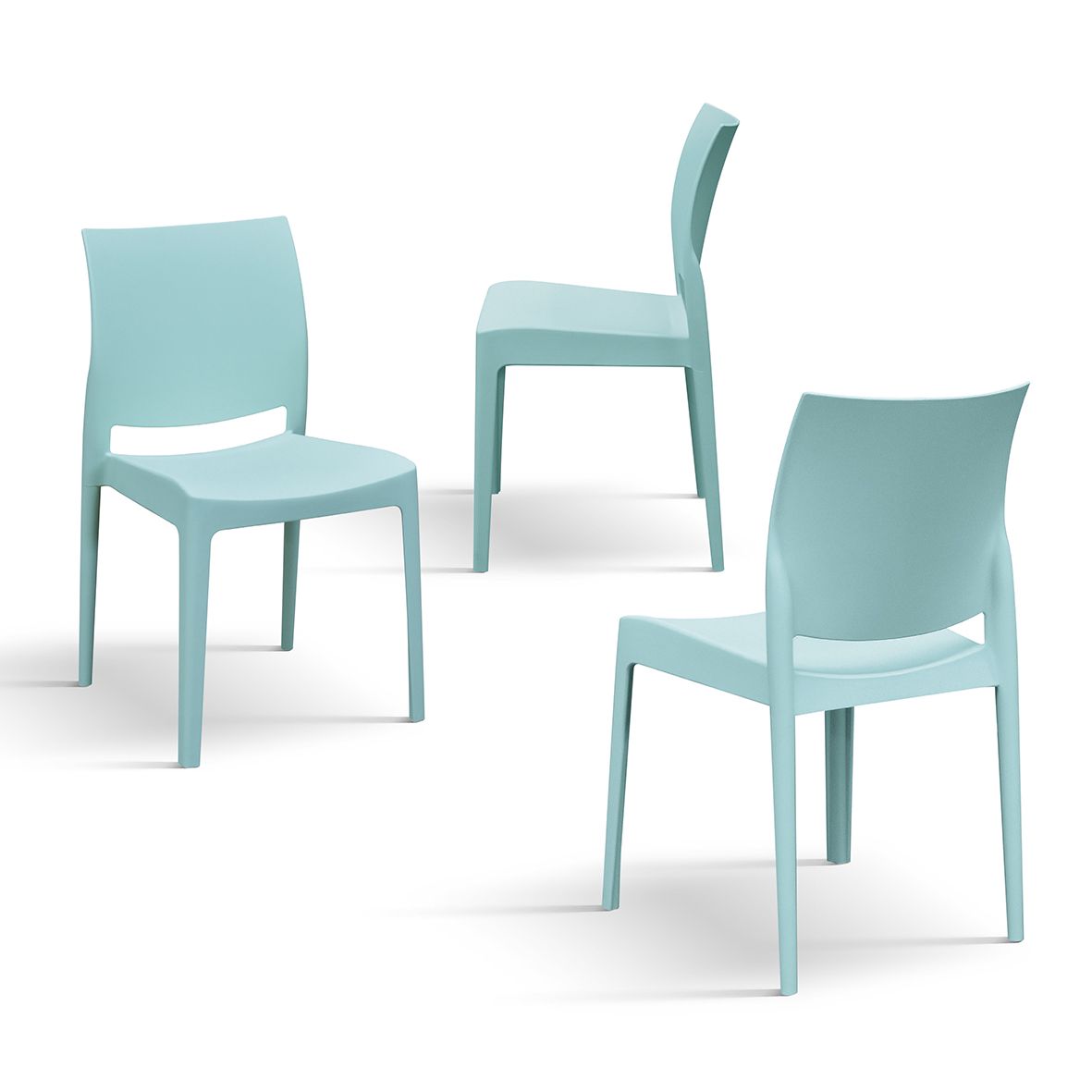 Sedia moderna in polipropilene, disponibile in verde chiaro, verde, azzurro, giallo, tortora, grigio, nero e bianco. Impilabile, leggera e resistente, perfetta per interni ed esterni.