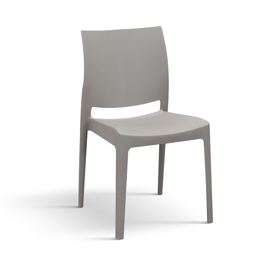Sedia moderna in polipropilene, disponibile in verde chiaro, verde, azzurro, giallo, tortora, grigio, nero e bianco. Impilabile, leggera e resistente, perfetta per interni ed esterni.