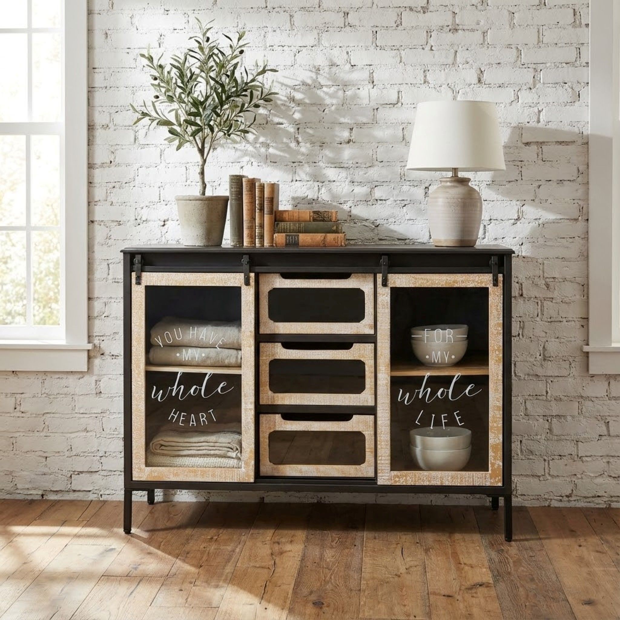 La madia ELODIE è un mobile retrò realizzato in metallo e legno, con ante scorrevoli in legno e vetro e cassetti. Perfetto per arredare ambienti vintage, con dettagli in legno di rovere chiaro che richiamano il profumo del passato. Le bellissime antine in vetro svelano i vostri oggetti preziosi, dando un tocco bakery industrial. I cassetti, adornati con finestrelle in vetro, mostrano il contenuto. Con 2 vani laterali e 3 grandi cassetti centrali, ELODIE è funzionale e carino, perfetto per tenere a portata di mano tutto ciò che serve.